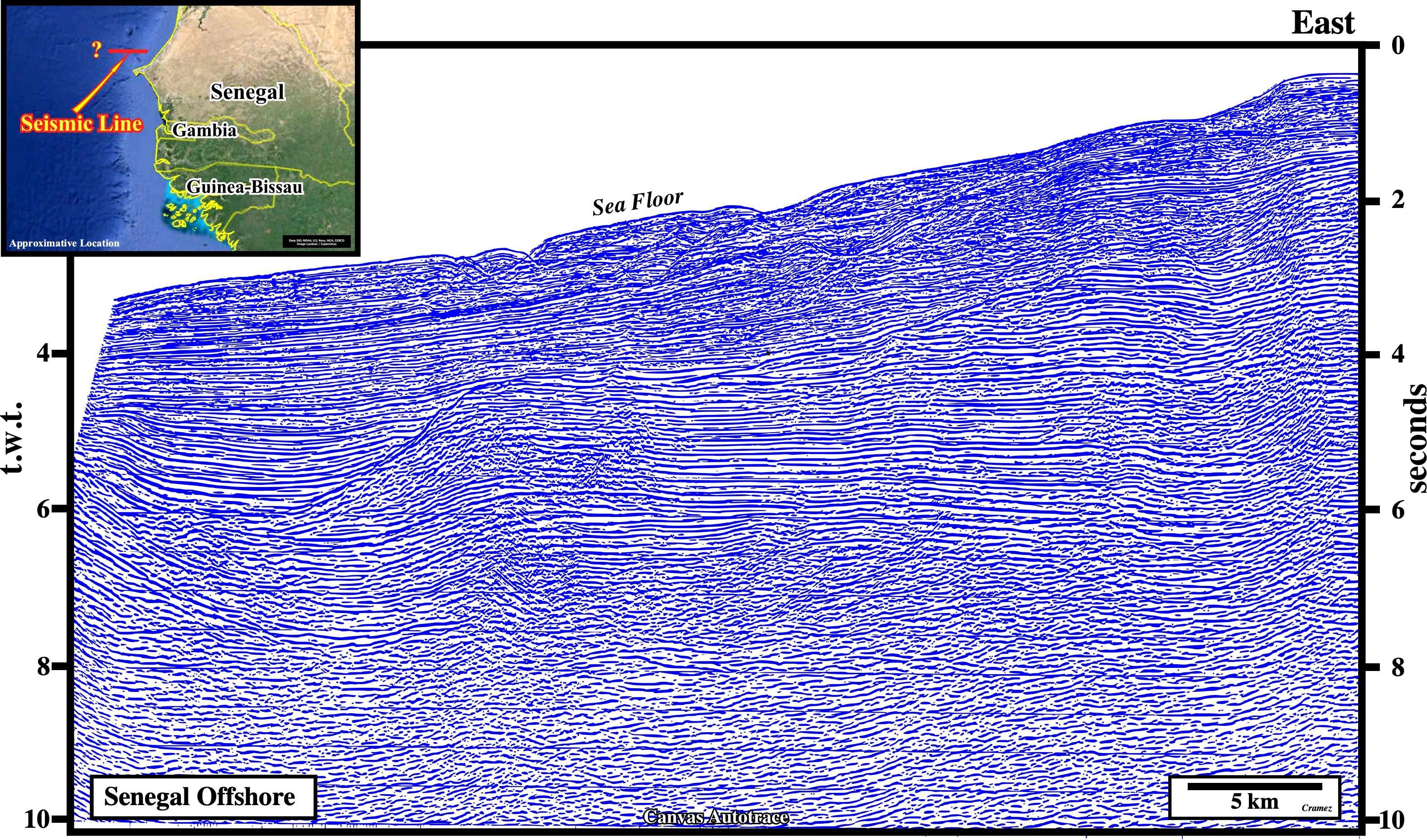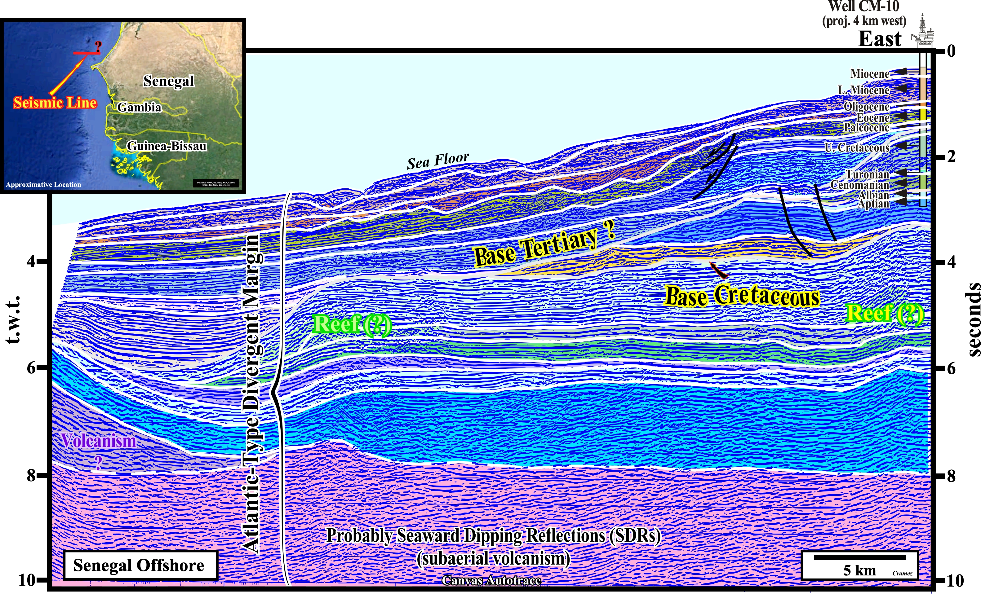 The geological results of the CM-10 well, drilled near the present time shelf break, allow the calibration of the upper part of the tentative geological interpretation of a Canvas autotrace of a Senegal offshore seismic line. The original seismic line recognizes, mainly, the upper slope, but the seismic line location on the location map is doubtful. As illustrated, the geological calibration concern just the upper seismic intervals (Aptian to Recent). The base Tertiary seems to match with the Senonian relative sea level fall (uplift, erosion and karst), which caused the slumping of the platform edge. Such a relative sea level fall developed an important unconformity with characteristic incised valley, which act as conduits along which reworked carbonate platform debris and onshore paralic sedimentary particles are transported down and deposited on the slope and at the base of slope. Below the base Cretaceous a thick Jurassic platform seems quite evident above a volcanic substratum, which can be, tentatively, interpreted as post-breakup lava-flows, i.e., SDRs. If that is so, no pre-rifting rock and rift-type sediments can be recognized in this Canvas autotrace. Note that in a depth section, due to important lateral velocity changes of the seismic waves (perturbation traveling without displacing the matter but transporting energy), the pre-Cretaceous sediments have a significant landward dip. Such a structural behavior reinforce the possibility of development of potential traps, as well as an westward migration of the hydrocarbons generated by "speculative" carbonate Jurassic source-rocks.