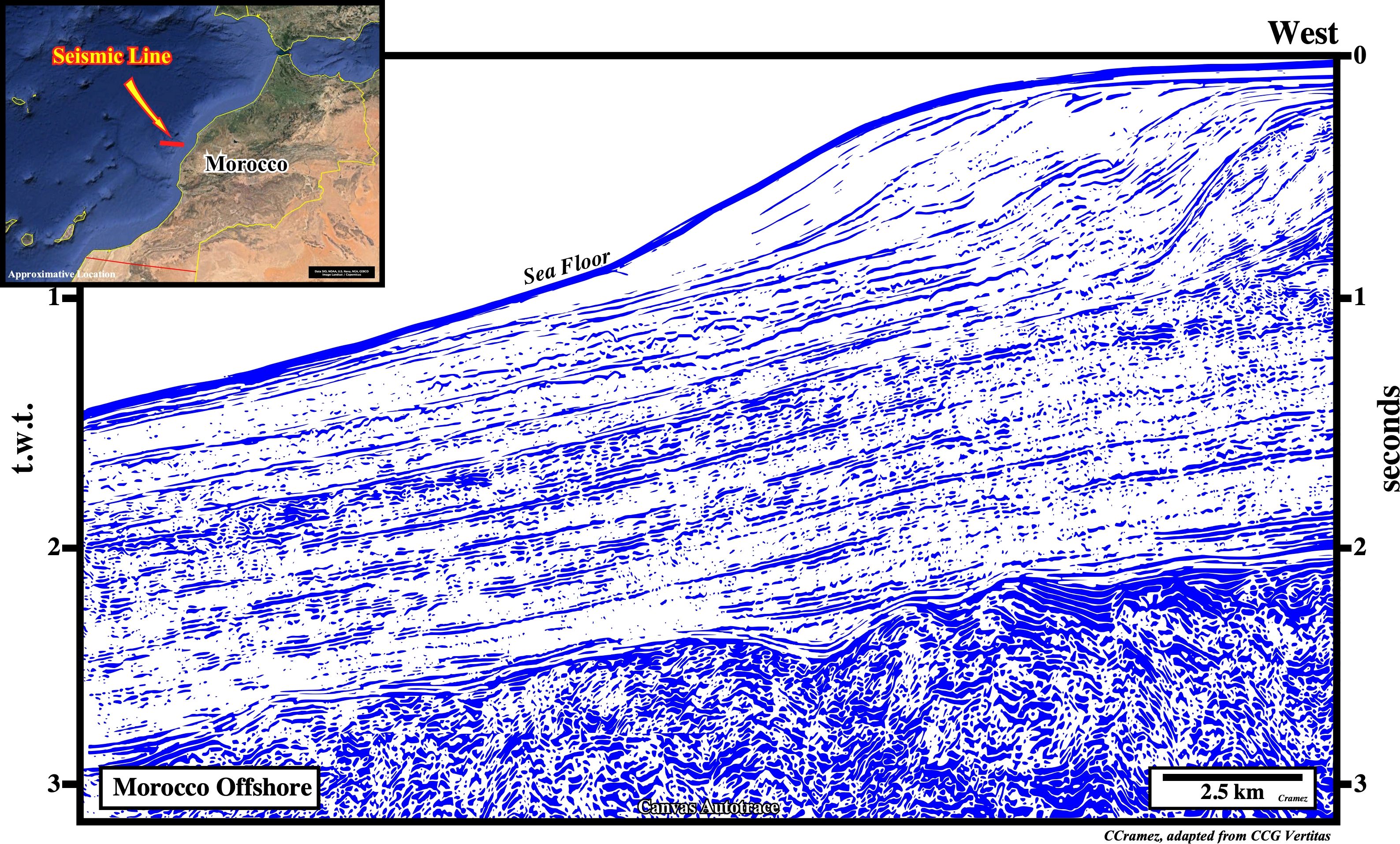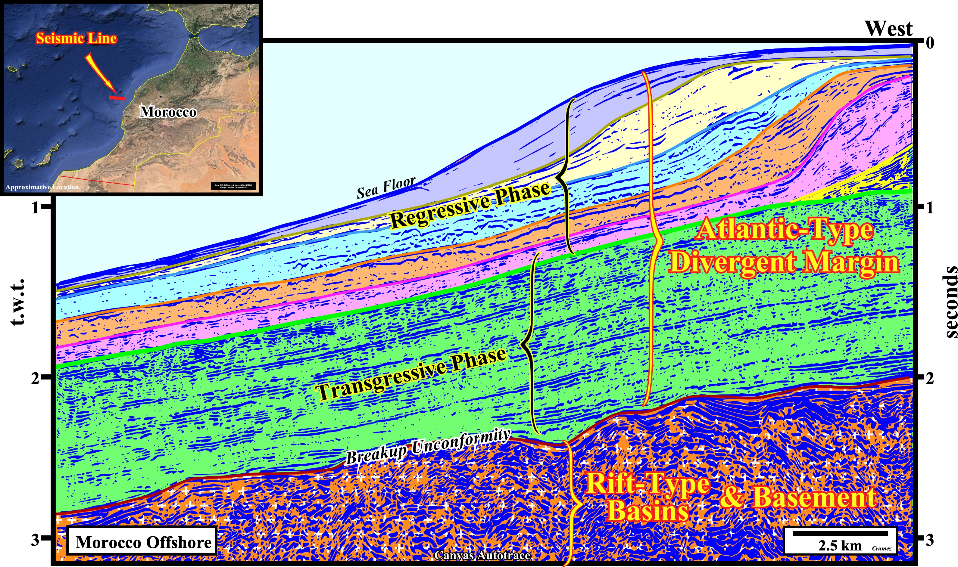 Above a substratum, which top can correspond to the breakup unconformity (bounding rift-type basins or basement rocks)the Atlantic-type divergent margin is here well represented by the two stratigraphic phases: (i) The transgressive phase characterized by a retrogradational geometry, which highlights the successive marine ingression (relative sea level rises) and (ii) The regressive phase characterized by a progradational geometry, which bottom corresponds to a downlap surface with a significant hiatus (geological time interval, which at a given location on a stratigraphic surface, is not represented by strata or represented by a condensed section characterized by a very low sedimentation rate, between 1/10 mm per 1,000 years).