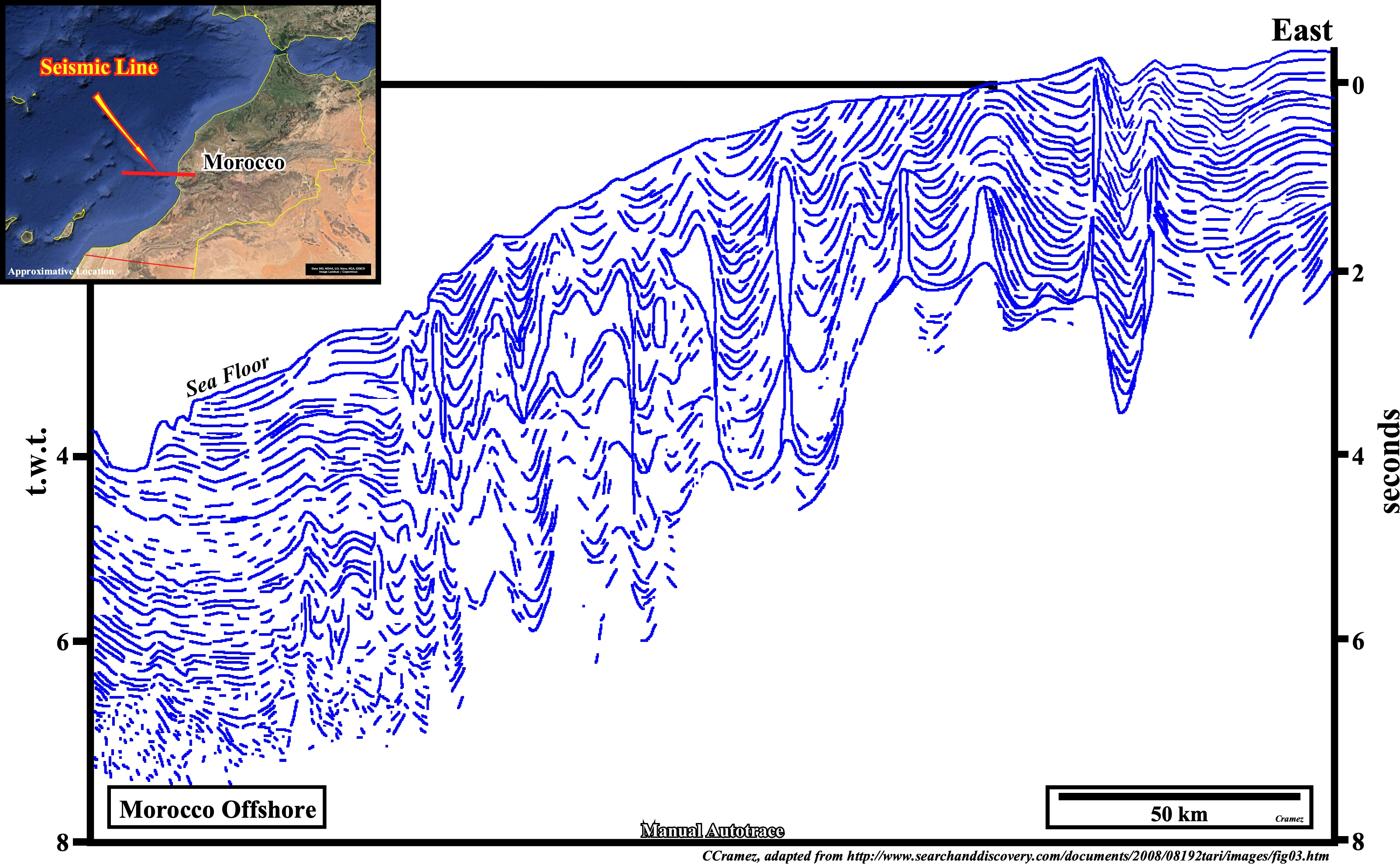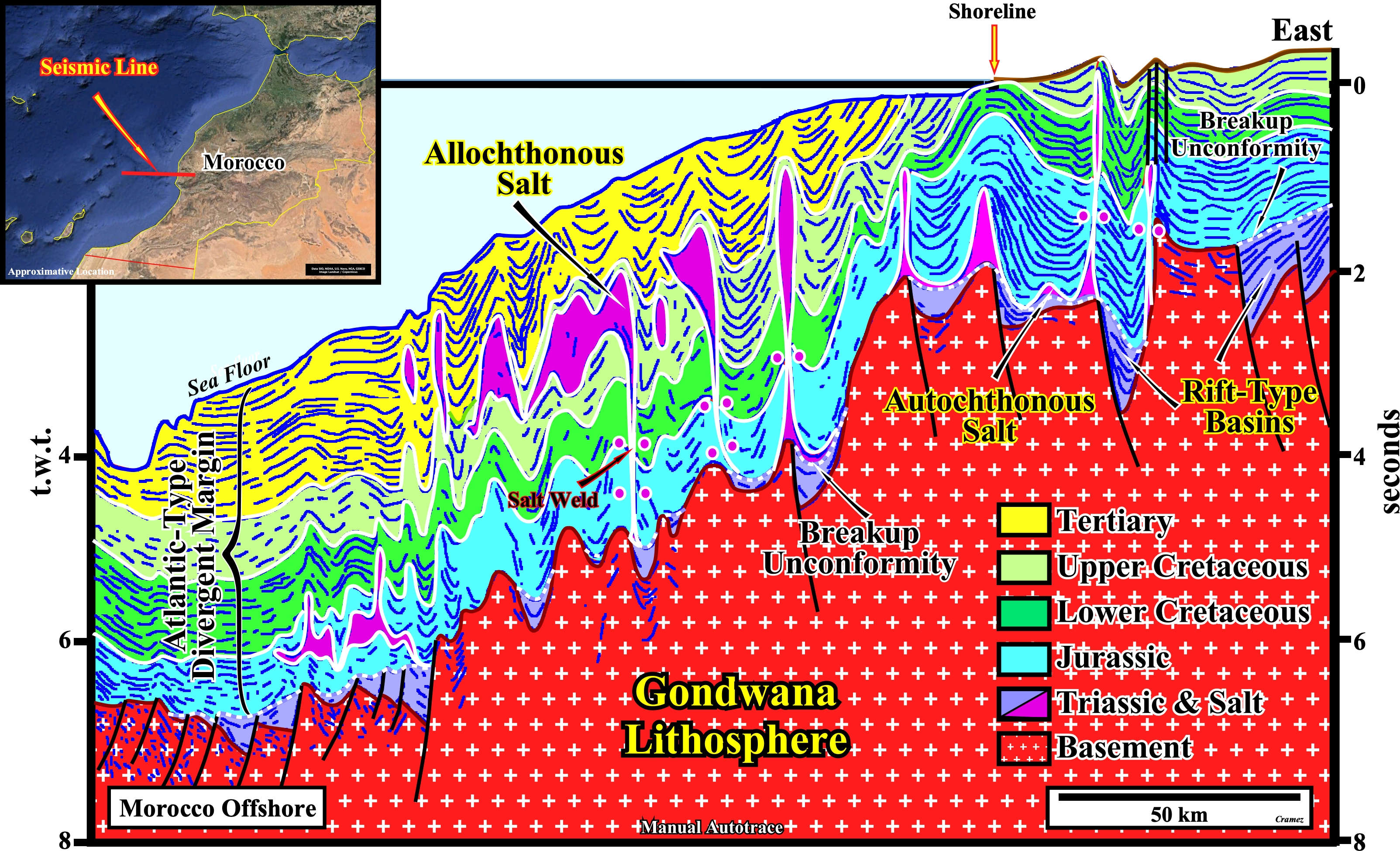On this tentative geological interpretation, the salt layer deposited at the bottom of the Atlantic-Type divergent margin, i.e., after the breakup of the Gondwana lithosphere, which separates the rift-type basins (developed during the lengthening of the Gondwana lithosphere, that predates and announces the breakdown of the lithosphere) is presented not only as autochthonous salt (in its normal stratigraphic position), but as allochthonous salt. Th salt ramps between the autochthonous and allochthonous salt are easy recognized as well as several secondary (vertical) salt welds.