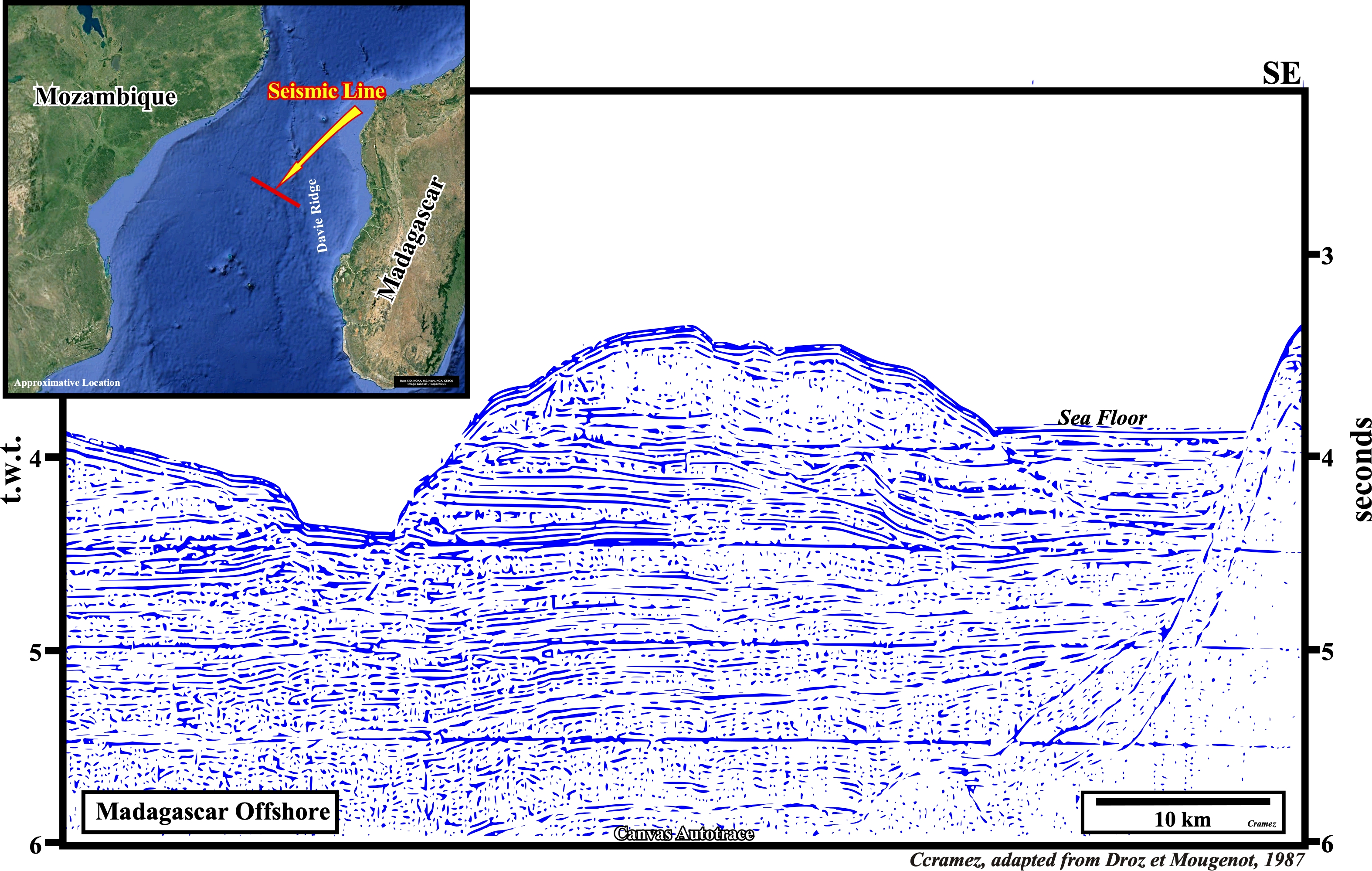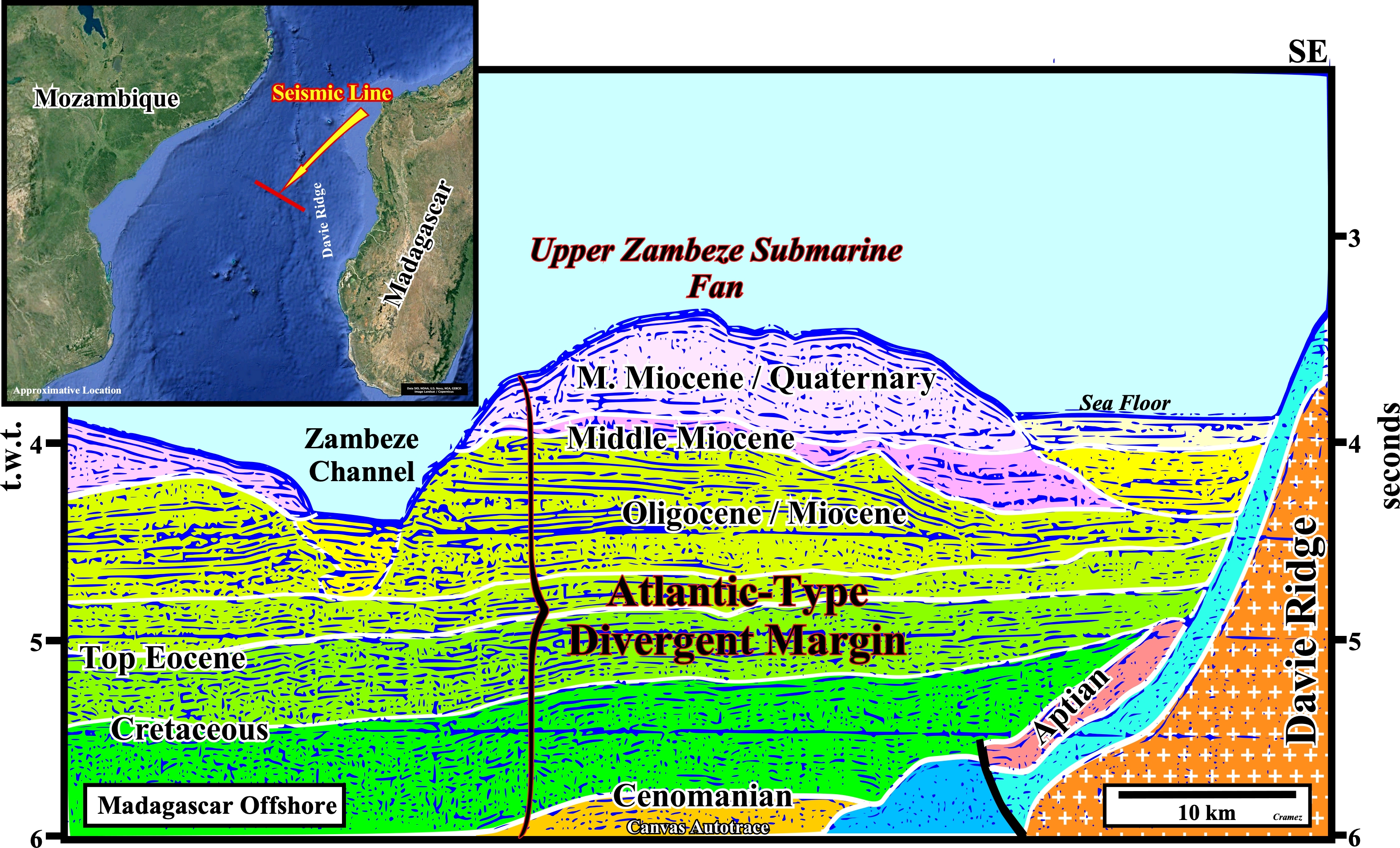 On this highly falsifiable tentative geological interpretation, the Mozambique and Morondava geographic basin are separated by the Davie Ridge, which can be explain by uplift, shortening and volcanic intrusions developed in an overriding plate of a B-type subduction zone (see Page 66). In such hypothesis, the Mozambique geographic basin corresponds to the Atlantic-type divergent margin, in which the Zambeze submarine fan was deposited (near the Davie ridge), while the Morondava geographic basin, westward of Davie ridge can be considered as a kind of backarc basin.