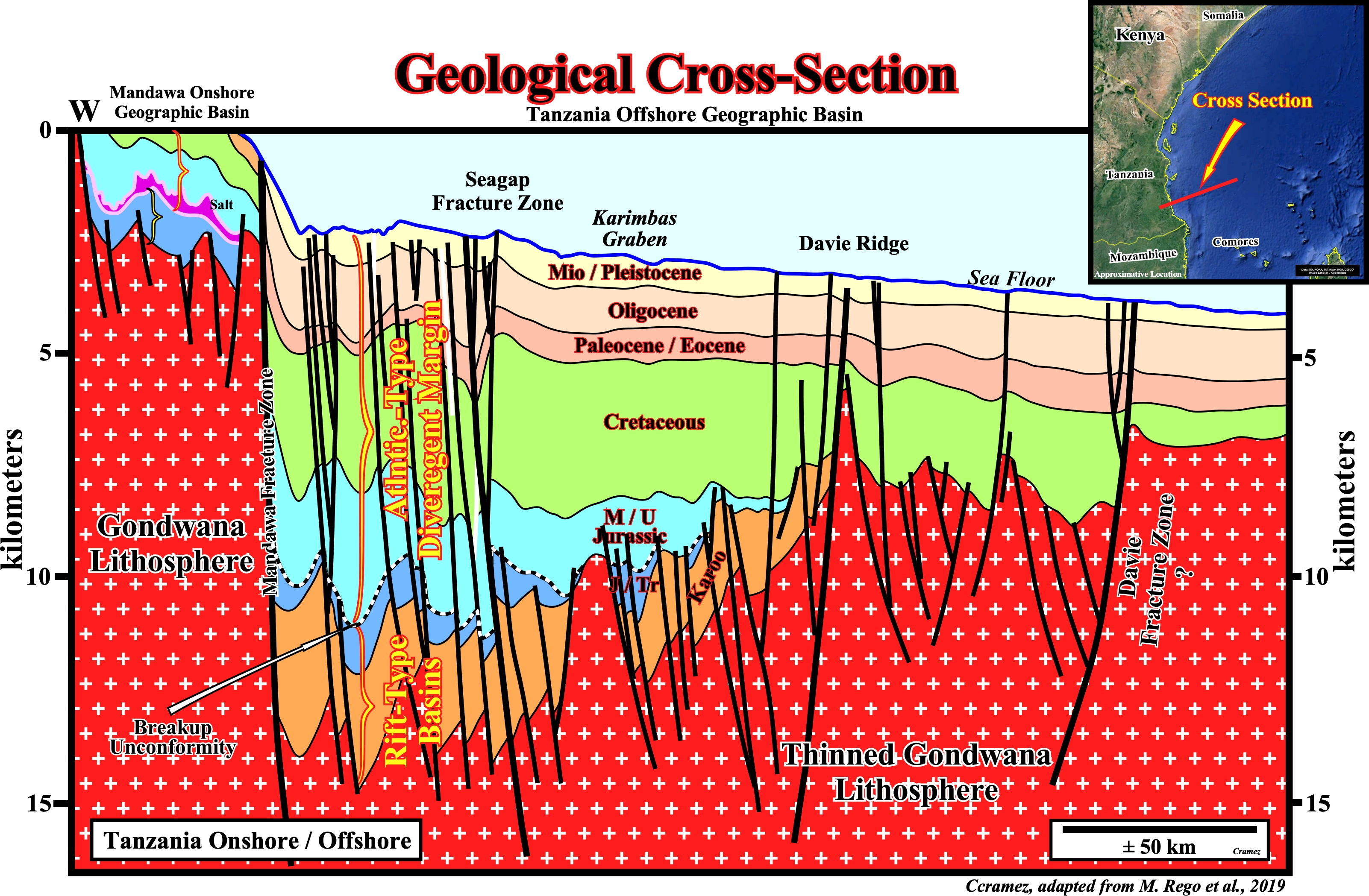 On this West-East geological cross-section of the southern Tanzania through the Mandawa onshore geographic basin and the adjacent offshore several major fracture zones are, easily, recognized : (i) Mandawa Fracture zone, (ii) Seagap Fracture Zone ; (iii) Davie ridge and the Davie Fracture Zone. The Mandawa fracture zone limits, roughly, the onshore from the offshore. It is, probably, the main responsible for the abrupt water depth change between the onshore and offshore environments. In fact, presently, the basin has not shelf, i.e., the shoreline corresponds, practically, to the shelf break. The Seagap fracture zone seems to have a compressional strike-slip movement. Not only the sedimentary packages are, laterally, displaced but those of the eastern faulted are, slightly, shortened as well. The Davie Ridge is, probably, the northward continuation of the subduction zone hypothesized on Mozambique offshore (see Page 35 and 36B). It marks the eastern limit of the Karoo sediments, that is to say, non-marine sediments (shales, red beds, siltstones) and great quantities of volcanics, extending from the Carboniferous and Permian periods to the Late Triassic Epoch. The Davie fracture zone, which is eastern fracture zone of the area, seems to have played with an extensional strike-slip movement, mainly, during the Atlantic-type divergent margin (Cretaceous time). Stratigraphically, the pre-breakup rift-type basins are, easily, recognized. They have a Karroo and Early Jurassic age. The Atlantic-type divergent margin is quite well developed with an important thermal subsidence during the Jurassic and Cretaceous, while during the Tertiary the sedimentary packages are roughly isopachous. In other words, during the Jurassic and Cretaceous the major factor in the creation of the space available for sediments was the subsidence, while during the Tertiary, eustasy was paramount. Notice, in the onshore, the presence a salt deposits at the base of the Atlantic-type margin (Kizimbani-1 well, recognized 750 m of evaporites , which according certain geoscientists seem to emplaced between Bathonian and Late Aptian strata (Balduzzi et al., 1992).