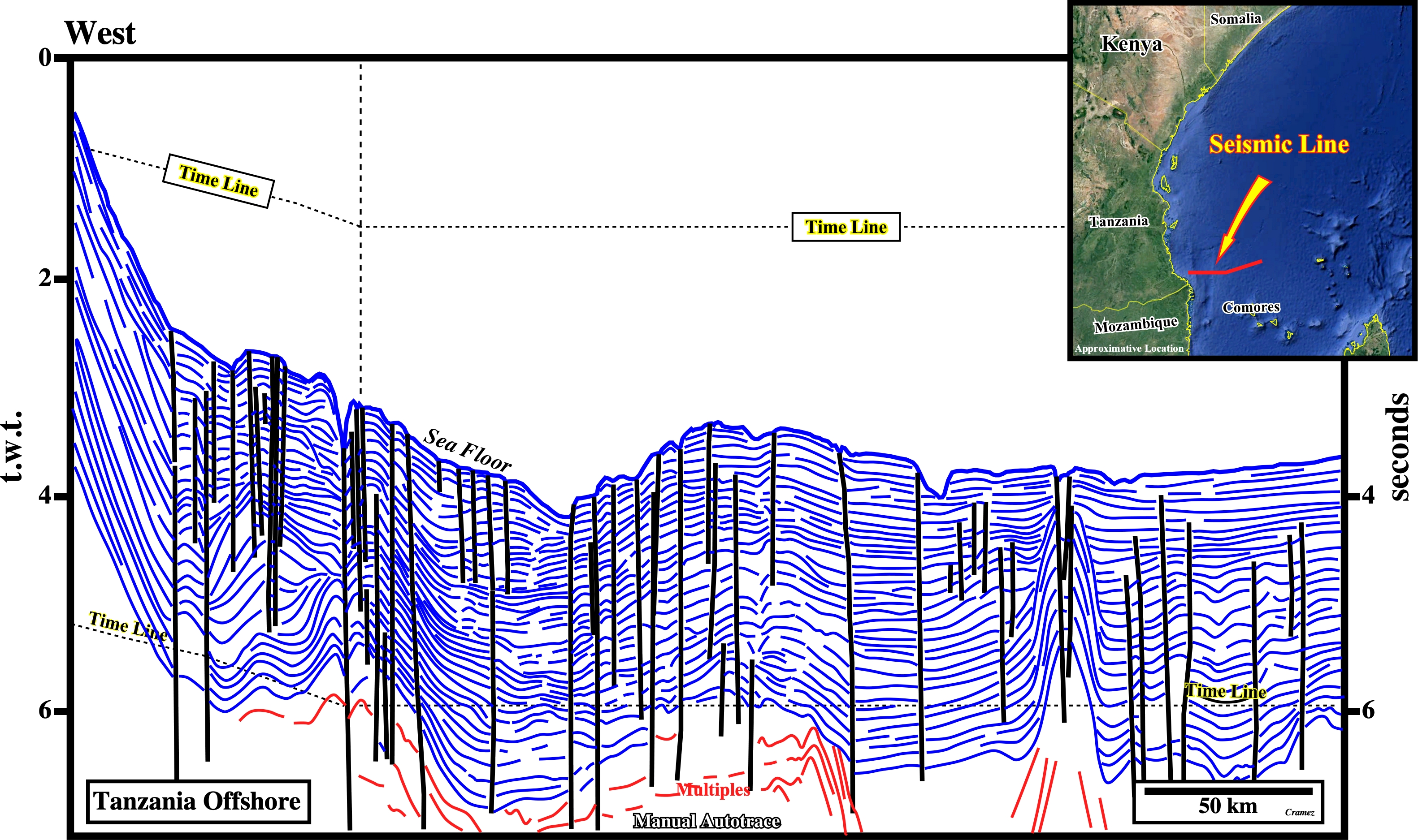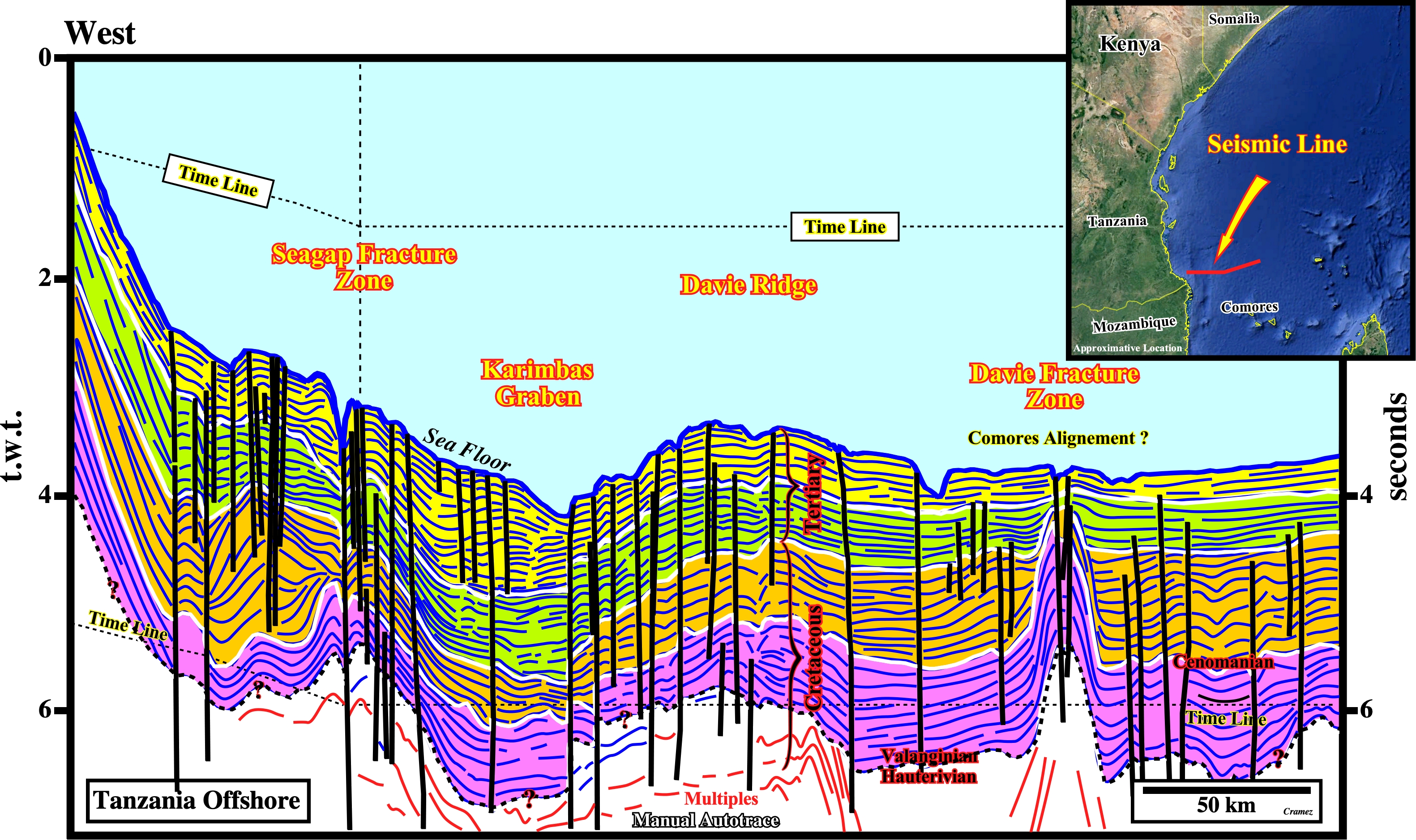 On this manual autotrace of an old unmigrated composite seismic line (too much multiples and diffractions) of Tanzania offshore seismic line, located northward of the offshore Rovuma geographic basin ( Mozambique) and southward of the geological cross-section illustrated on the previous plate, the Seagap Fracture Zone, the Karimbas Graben, the Davie Ridge and the Davie Fracture Zone (?) are quite well recognized. It is important to notice that in this area, the Tertiary gravitary folded belt of the Rovuma geographic basin (Mozambique offshore, see Page 36A) is, totally, absent. Similarly, the Lacerda graben (see Page 41) did not reach this area. At the stratigraphic point of view, just the upper part of the Atlantic-type divergent margin is recognized. Below the Lower Cretaceous sediments (Neocomian, i.e., Valanginian and Hauterivian), the data is very poor and the majority of the seismic reflection are multiples and diffractions.