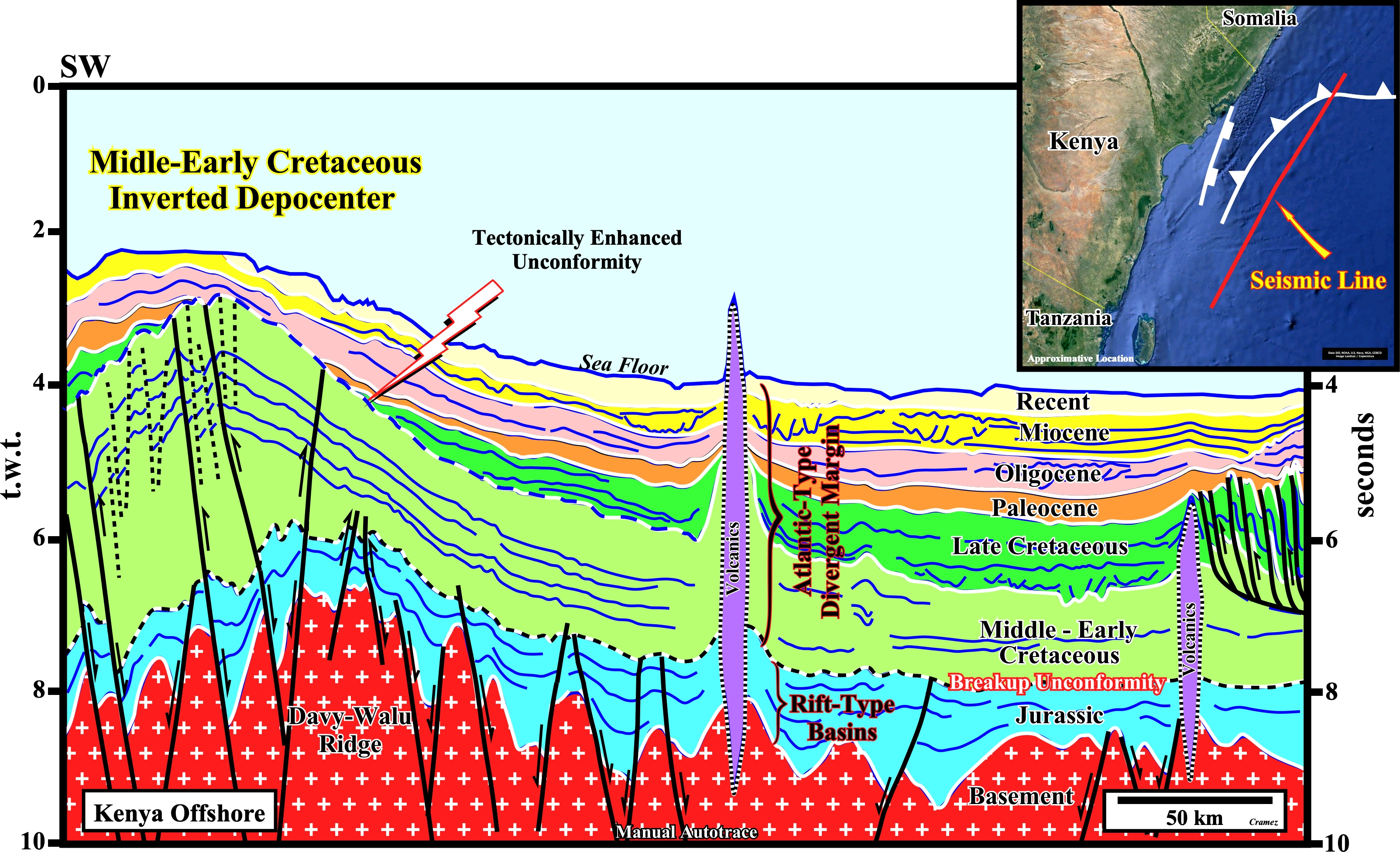 If the southern part of the Kenya offshore is dominated by the Pemba-Simba and Davie Ridges with the Maridadi Trough (depocenter) between them, the northern part is characterized by the reverse reactivation of the normal faults bounding the rift-type basins during the late Middle Cretaceous and by a gravitary folded-belt quite developed in the Somalia offshore (see Page 67 and Page 68). This tentative geological interpretation of a manual autotrace of a strike seismic line, roughly, parallel to the Kenya coastline, illustrated the major geological features of this offshore. The breakup unconformity is, easily, recognized, as well as, the rift-type basins which predating the breakdown of the Gondwana lithosphere, are, basically, Jurassic in age. The Atlantic-type divergent margin is well developed, particularly during the Early -Middle Cretaceous, with the formation of a major depocenter (Maridadi Trough) in the southern part of the offshore. However, by the end of these geological epochs, a compressional tectonic regime reactivated the normal faults bounding the rift-type basins with reverse faulting movement, creating an huge anticlinorium (inverted depocenter) and a local tectonic enhanced unconformity, i.e., a local relative sea level fall since the sediments were shortened and uplifted (generally, to have a significant erosion, a substantial relative sea level fall is necessary because the sediments must be to exhumed). The anticlines of the anticlinorium are elongated along the axial direction by compressional strike-slip, which, often, certain geoscientists, erroneously, interpreted them as normal (it is impossible to short and to length the sediments at same time in same place). This kind of faults, on the top of the anticline, was, perfectly described, in the 60's, on the Swiss Jura by my professor C.E. Wegman. A lateral ramp of the gravitary folded-belt is, barely, viable on the northern part of the autotrace. Such a folded-belt is obvious on dip seismic lines as illustrated on the manual autotrace of Page 41.
