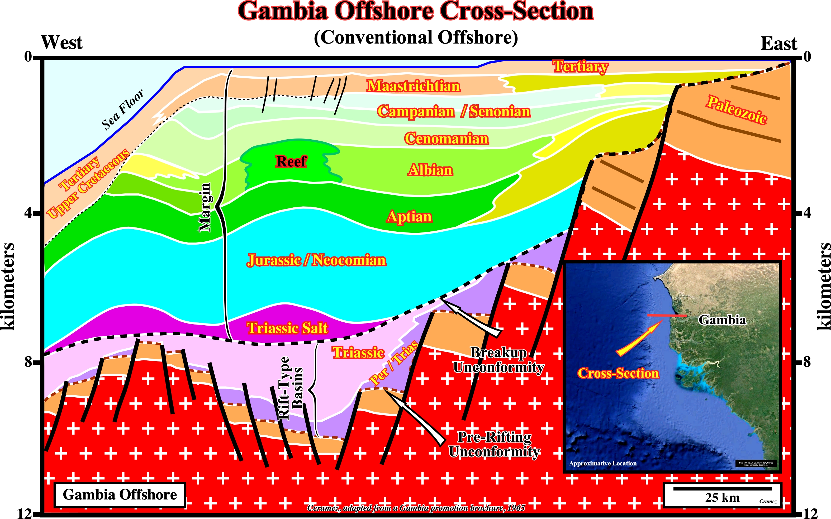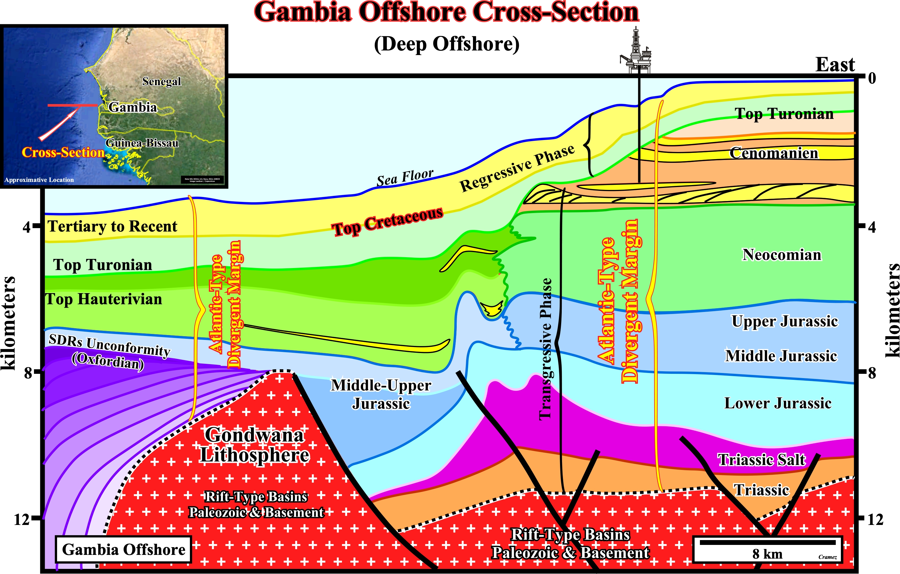 As depicted on this geological cross-section of Gambia geographic basins, the geology of Gambia conventional offshore is very similar to that of the Guinea Bissau and Senegal offshores (see Page 23 & 23A). This seems to be true also to the deep offshore (see next plate), since an abrupt deepwater geological setting was always present since the beginning of a Atlantic-type divergent margin, which developed above typical Permo-Triassic and Triassic rift-type basins. This basins, which predate the breakup unconformity, developed in a lengthened Gondwana lithosphere formed, mainly, by a Precambrian basement with a Paleozoic infrastructure. The Triassic salt layer postdates the break unconformity. It seems the salt was deposited in small ponds of an epicontinental sea (proto-ocean phase of some geoscientists) that later coalesce. On the other hand, its chemical composition, strongly, suggest the brine was enriched in potash by spilitization of the volcanic material, probably, lava-flows that pour or ooze from an erupting expansion centers (SDRs) immediately after the breakup of the Gondwana lithosphere (see below).