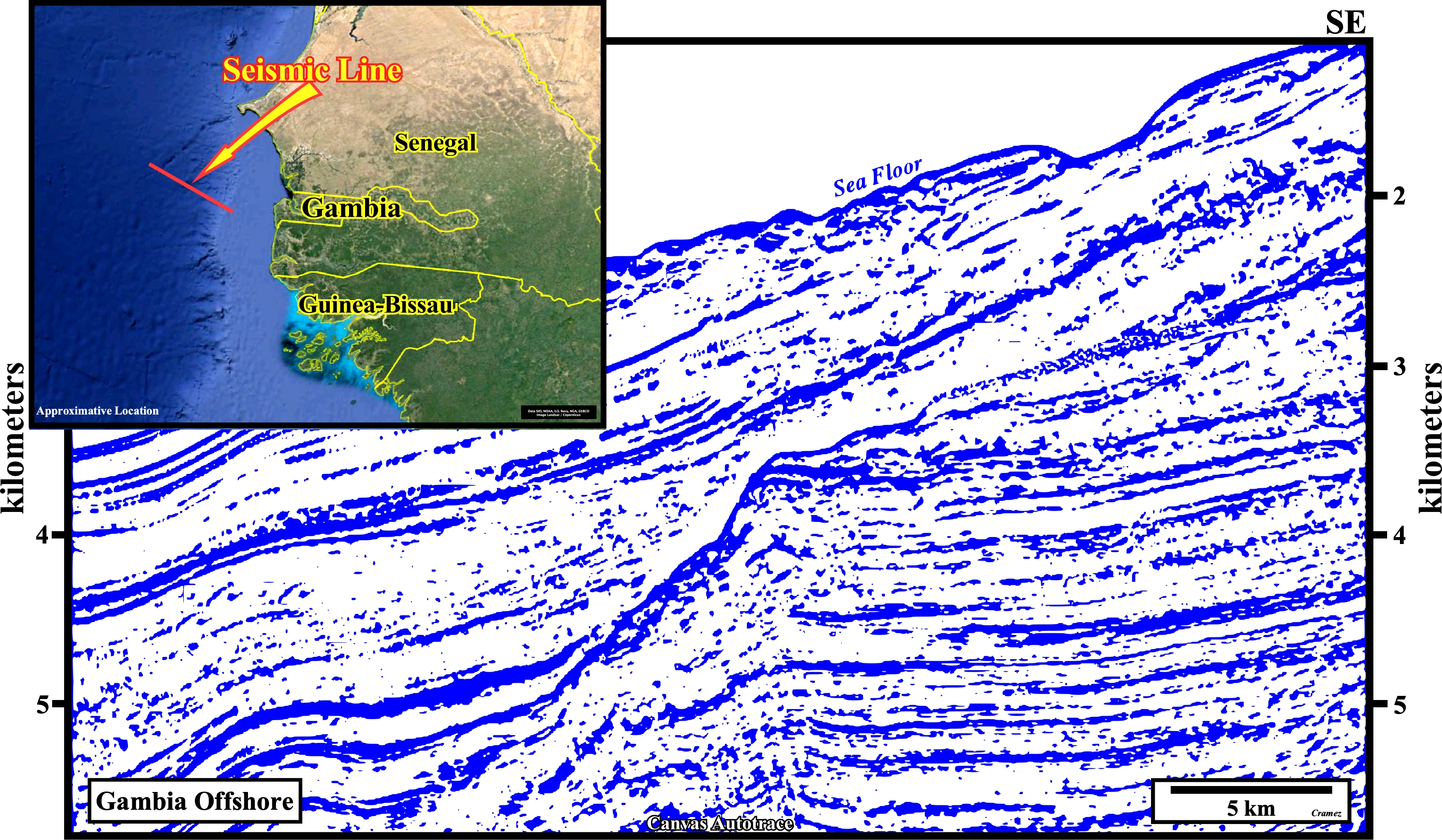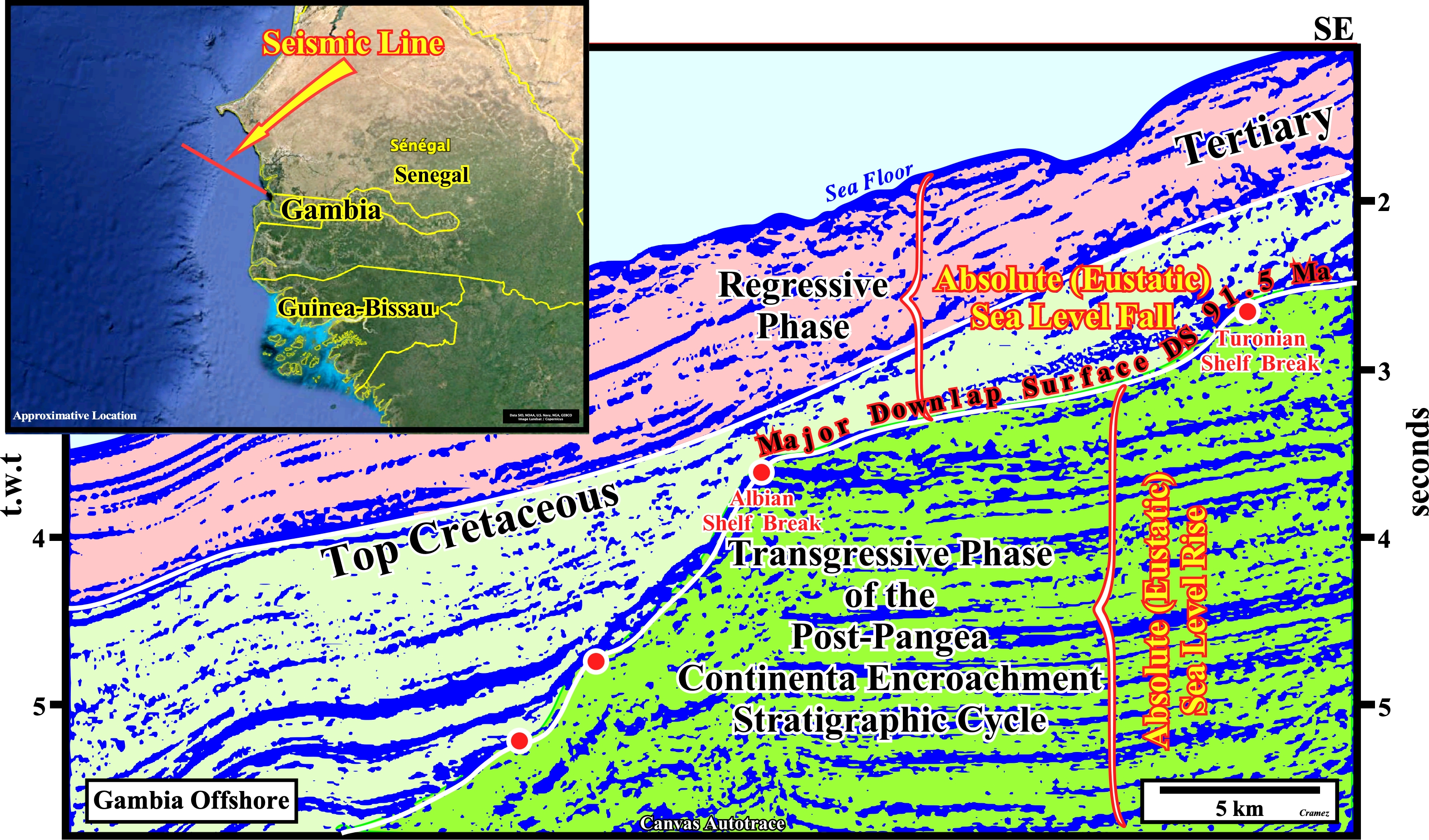 On this Canvas autotrace of a seismic line of Gambia offshore, the limit between the transgressive and regressive phases of the post-Pangea continental encroachment stratigraphic cycle, induced by the 1st order post-Pangea eustatic cycle, is clearly, visible. It corresponds to a major downlap surface (DS. 91,5 Ma) along which the successive shelf-breaks show a striking backstepping with condensed stratigraphic sections seaward (potential marine source-rocks). The transgressive phase has a retrogradational geometry, while the regressive phase has a forestepping or progradational geometry. During the transgressive phase, the basin, seismically speaking; has always a shelf (the distance between the shoreline and the shelf-break and the water depth increases, progressively, upward)- Contrariwise, during regressive phase, the basin, seismically speaking, generally, has no shelf. Highstand geological conditions (sea level higher than the basin edge, which in a sequence-cycle corresponds, more or less, to the outer limit of the coastal plain) are, always, present in the transgressive phase. Lowstand geological conditions, characterized by a sea level lower that the basin edge, are frequent during the regressive phase favoring the deposition of turbidite systems, in which potential entrapment-migration petroleum sub-systems can be found.
