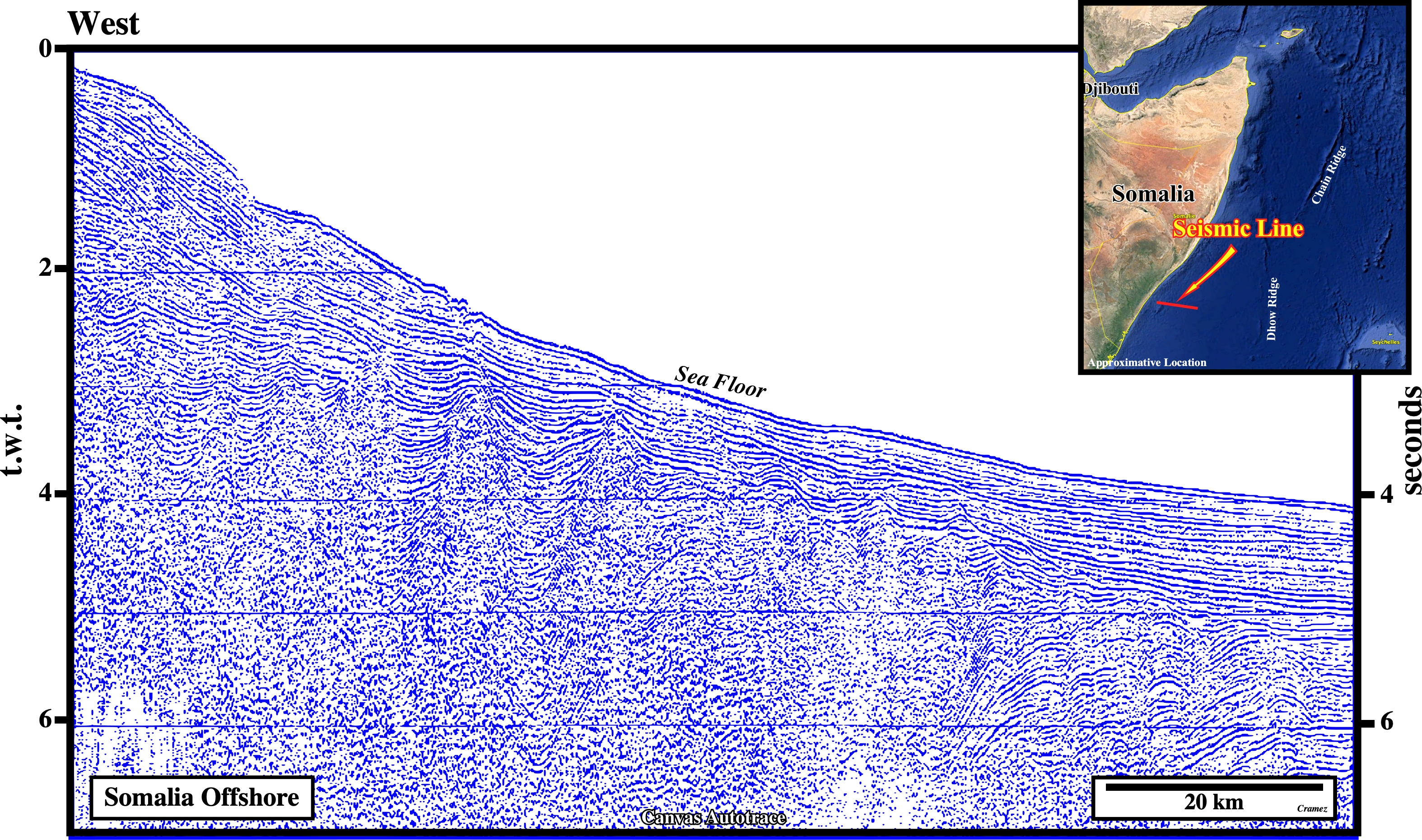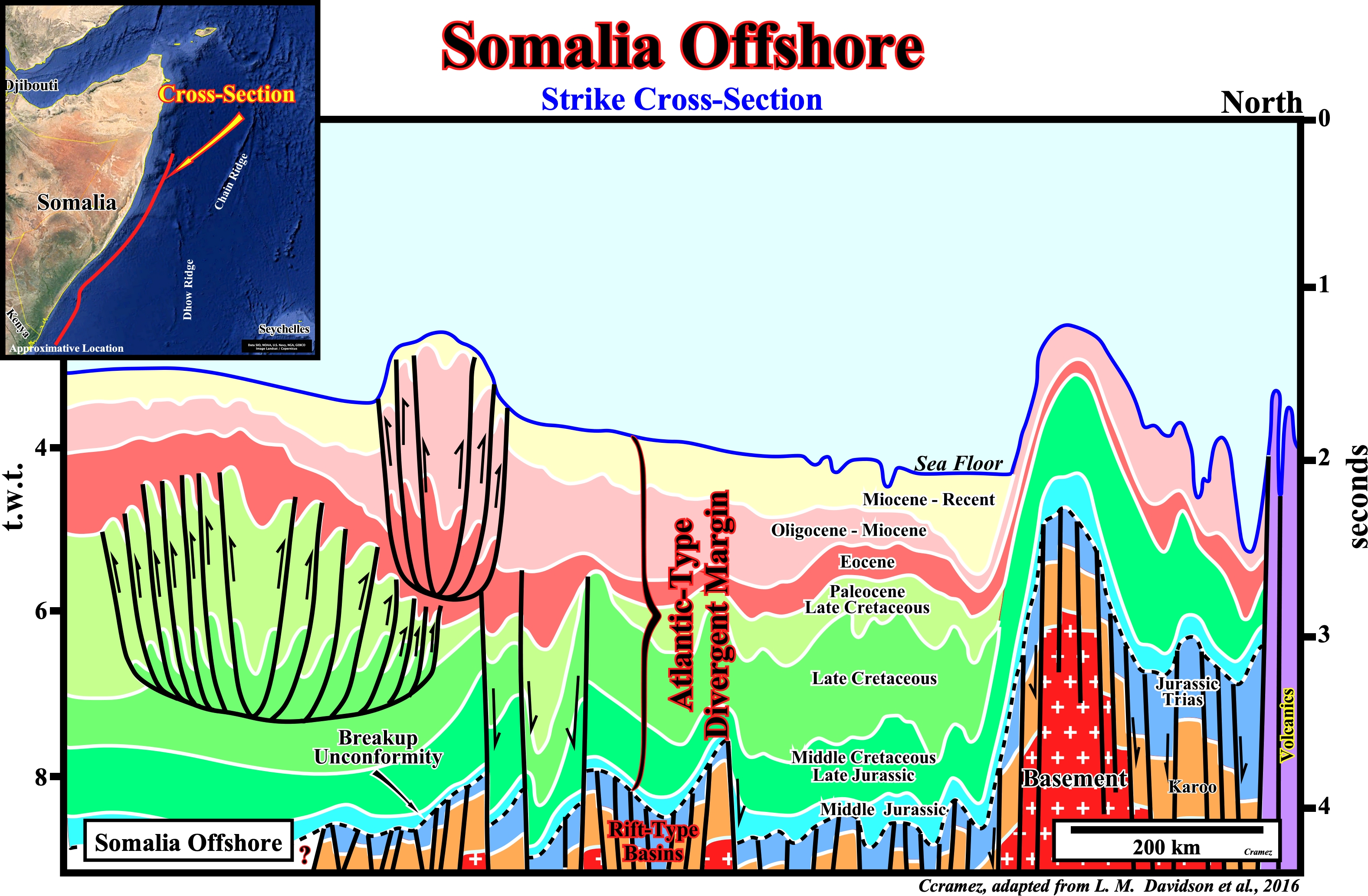 On this time geological cross-section of the Somalia offshore, based on a tentative geological interpretation of a composite strike seismic line, the breakup unconformity, which emphasizes the breakdown of the thinned Gondwana lithosphere, is recognized, quite well, by the abrupt change in the subsidence mechanism: differential subsidence, during the formation of the rift-type basins, which age ranges from Permo-Trias to Early Jurassic and thermal subsidence, during the overlying Atlantic -type divergent margin. Two complex set of listric faults (gravity collapse up-dip and local compressional folded belt down-dip) at different levels are also, easily, recognized on the southern part of the cross-section. The lower level folded belt is know as Kismaayo folded-belt and the upper one as Baraawe folded-belt (see also Page 41 of Kenya offshore). A basement structural high is, also recognized easily, in the northern part of the cross-section. These geological features allow geoscientists two subdivide this offshore int three sectors: (i) Jubba Deep in southern part ; (ii) Middle Mogadishu Deep in the central part and (iii) Middle Somalia high in the northern area. A rifted controlled Karoo (non-marine sediments mainly shales, red beds, silt-stones and great quantities of volcanics, appearing to record a gradual climatic shift toward ever-increasing aridity (www.britannica.com/place/Karoo-System) and Early Jurassic rift-type basins developed during the rifting (lengthening) of the Gondwana small supercontinent that seem to begin in Late Carboniferous and continued until Early Jurassic. The breakup of the Gondwana lithosphere induced the separation of East Antarctica from East India and a coeval development of an oblique rift valley between Somalia and the Madagascar- Seychelles-India, which western sector is illustrated by the next Canvas autotrace.