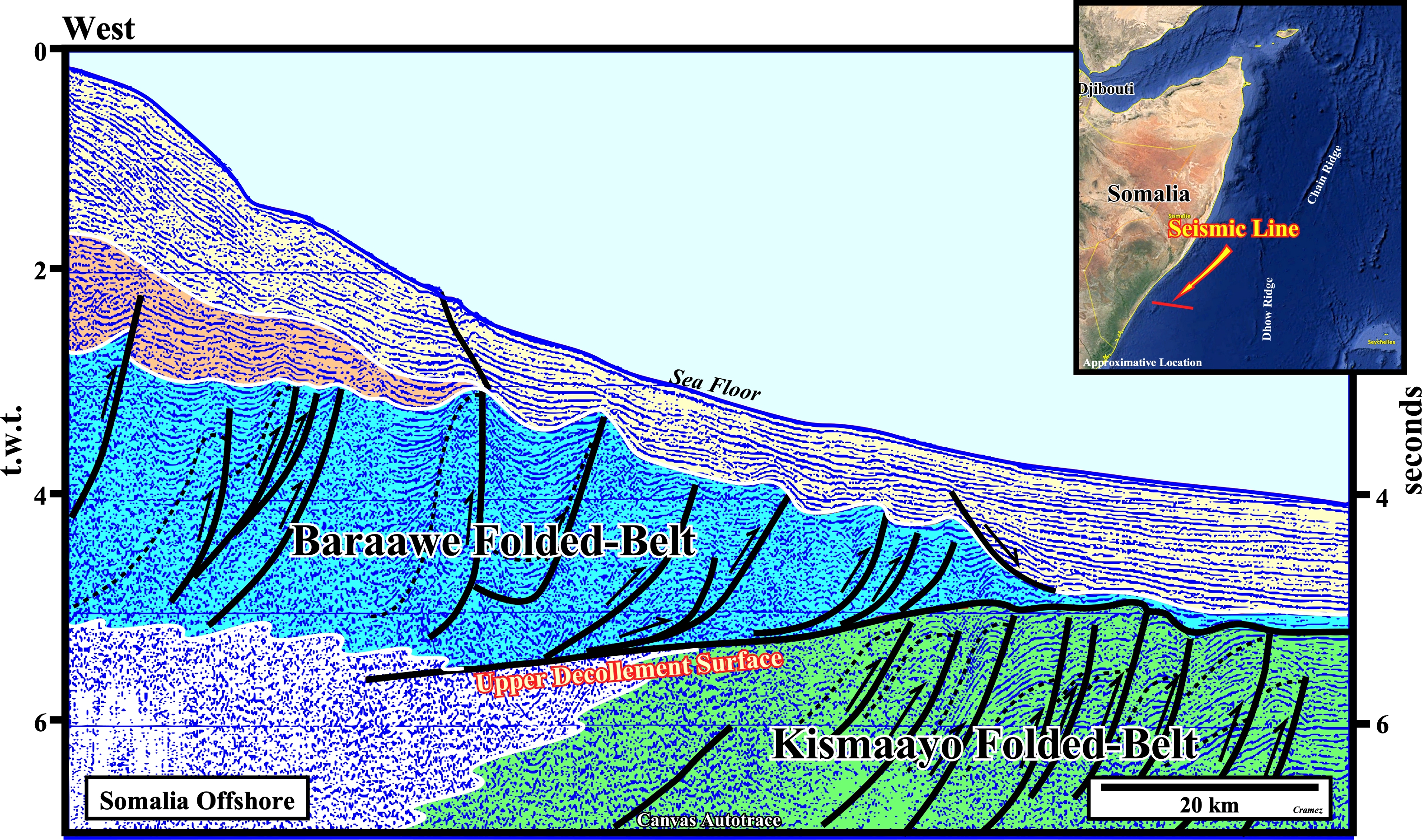 The two gravitational fold belts well visible on this Canvas autotraces. The upper decollementt plane, well recognized, is the lower limit of the the Baraawe folded-belt. The lower decollement plane is not visible on this autotrace by its predicatively is quit simple, in other words the base of the Kismaayo folded-belt is not visible. Notice than in both folded-belts just the distal sectors, i.e the compressional sectors (shortening) are visible. The central (translation plus diapirism) and proximal (lengthening) sectors lie westward of the autotrace.