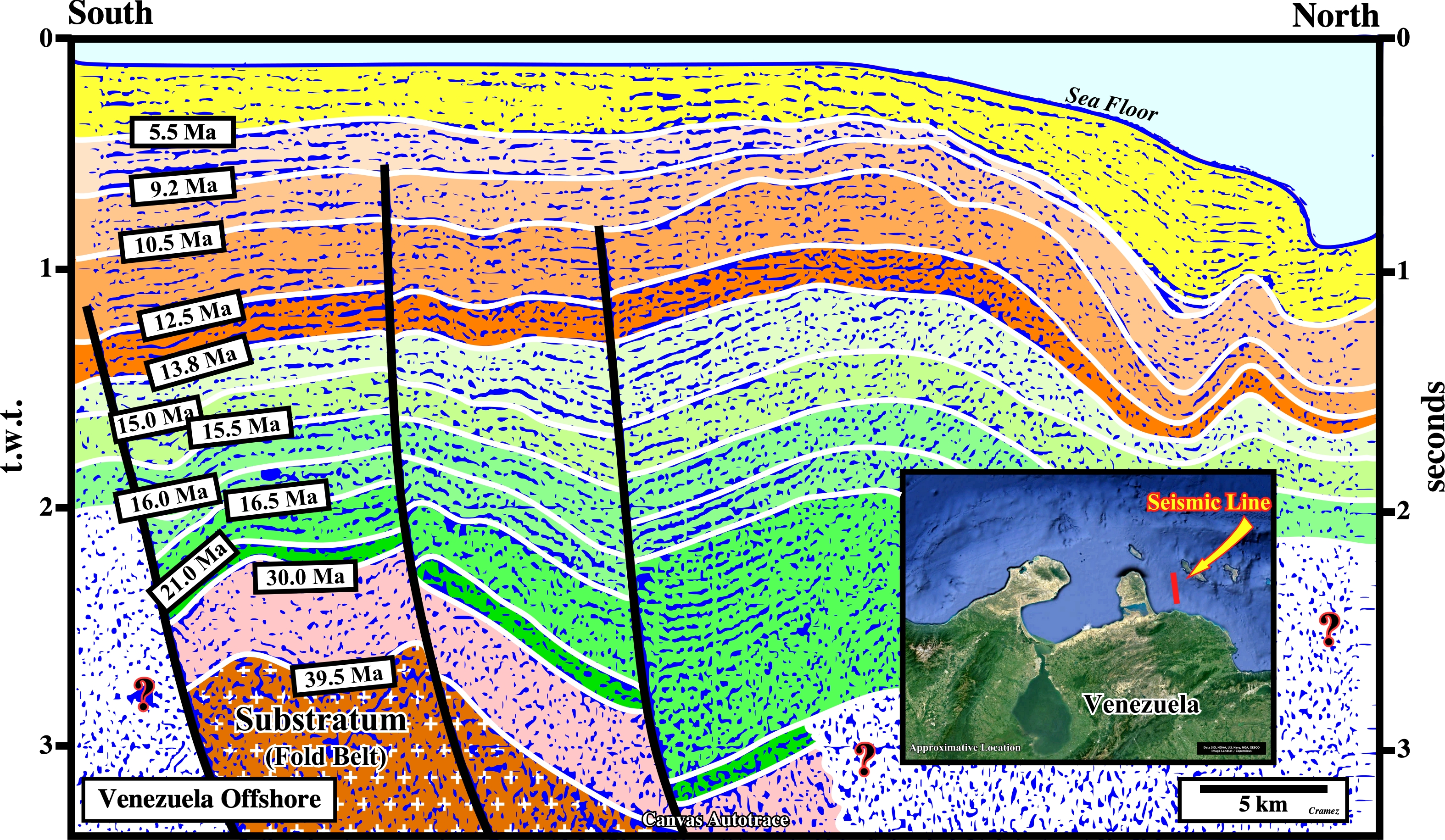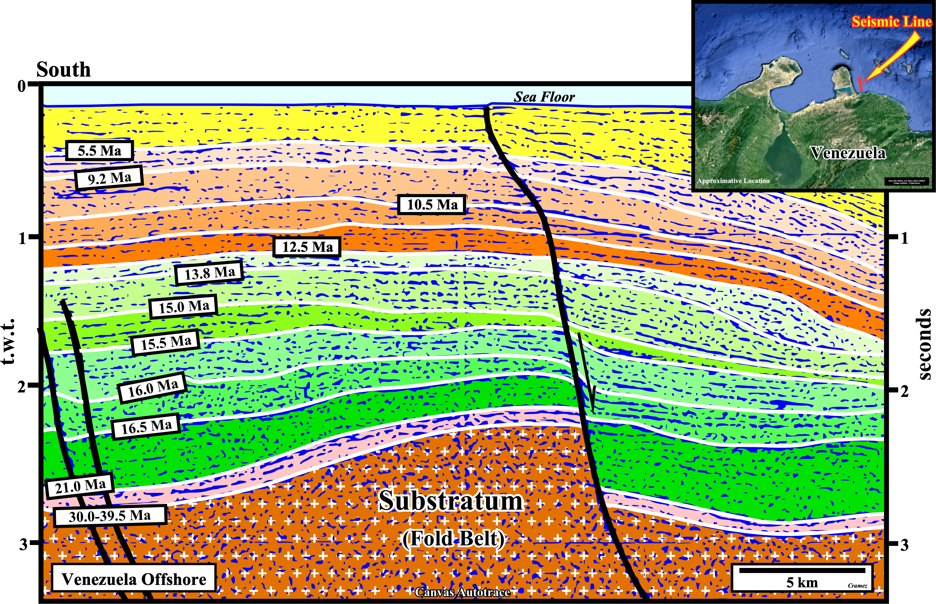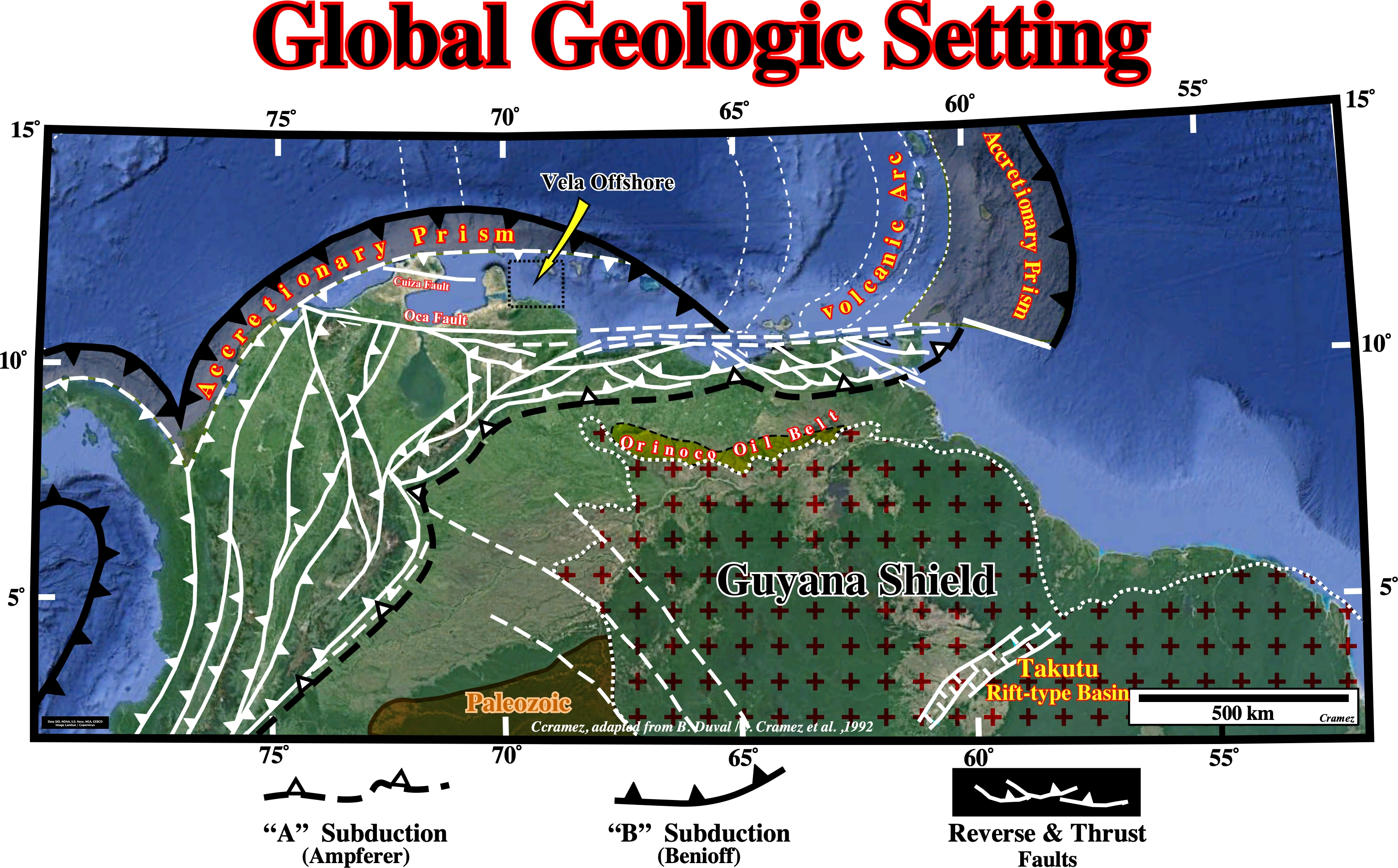 This tectonic sketch is a tentative representation of the global geological setting of the South America lithospheric plate, in which two main subduction zones are clearly visible, which bound the Meso-Cenozoic megasuture. The northern subduction zone is a B-Type subduction (Benioff type), in which the descending plate is oceanic. B-type subductions are highlighted by an: (i) Oceanic trench ; (ii) Alignment of volcanoes and (iii) Deformation in the overriding plate, which often causes the formation of mountains. The southern subduction zone is A-type subduction zone (Ampferer type), in which the descending plate is continental. A-type subduction are characterized by a foreland basin (foredeep). The area of interest (Cariaco /Margarita Platform), located westward of Trinidad, lies within the Meso-Cenozoic megasuture. It is highly shortened, as depicted on the N-S geological cross-section illustrated on the next plate. The presence of W-E strike-slip faults, as El Polar fault, creates, mainly, two types of sedimentary basins : (i) "Great Basin" Type and (ii) California-Type. The "Great Basin"-Type Basins are dominated by a complex tectonics linked to a pair of mega-shears where tilted blocks individualize a large number of small basins (e.g., Vela geographic basin in North Venezuela Offshore). This tilting geometry contrasts with that of Californian-type basins which are most often uniform and very flat. The substratum of basins of the "Great Basin" type consists of folded belts with their procession of folds, thrusts and granite remobilizations. Californian-type basins are generally filled with marine sedimentary sequences, most often of great water depth. Basins of the "Great Basins" type are, rather, filled with predominantly continental or shallow water sediments. From the tectonic point of view, Californian-type basins are dominated by compressive structures (folds, reverse faults and thrusts), while the deformations linked to "Great Basin" -type basins are rather deformations in extension (tilted blocks).