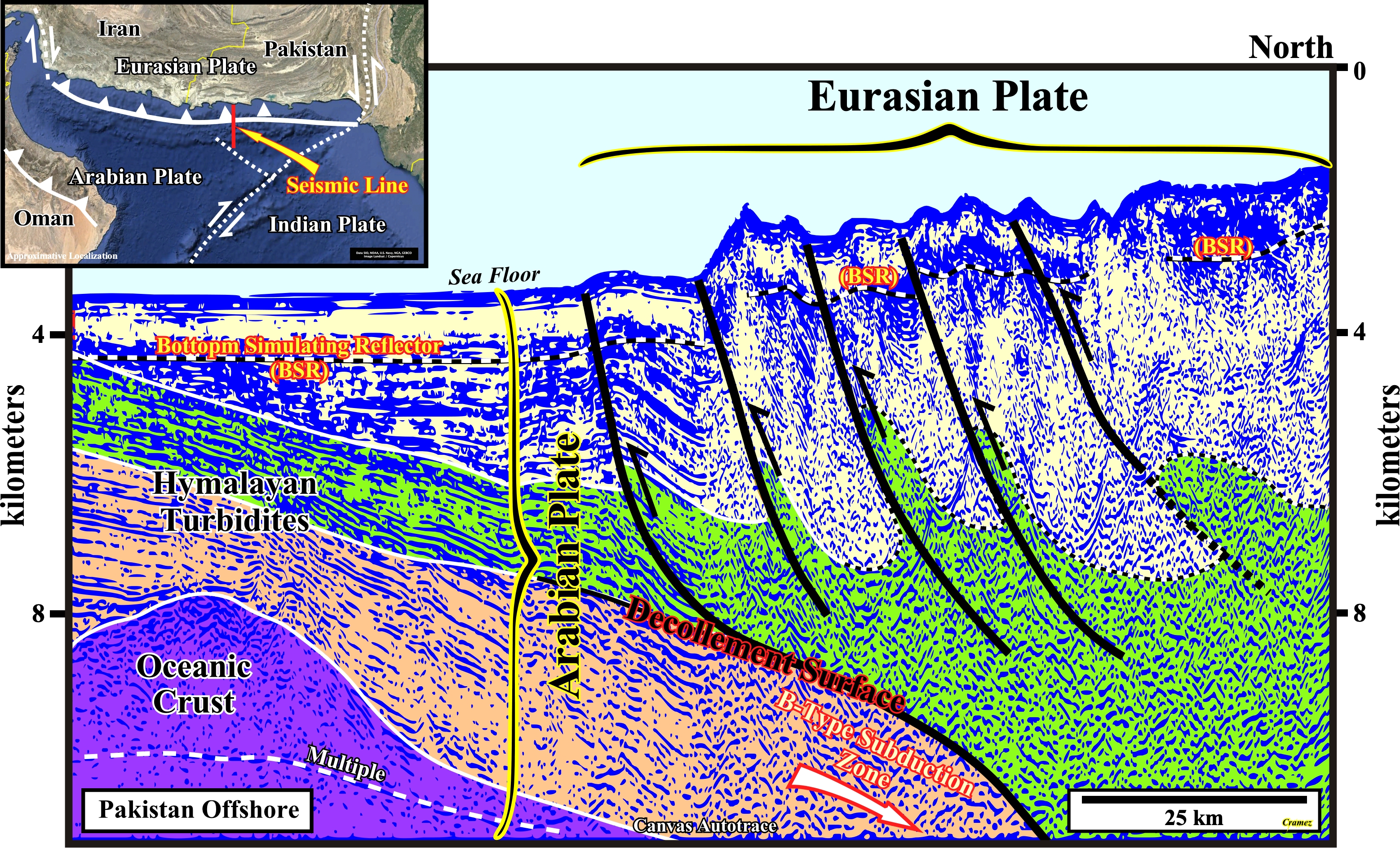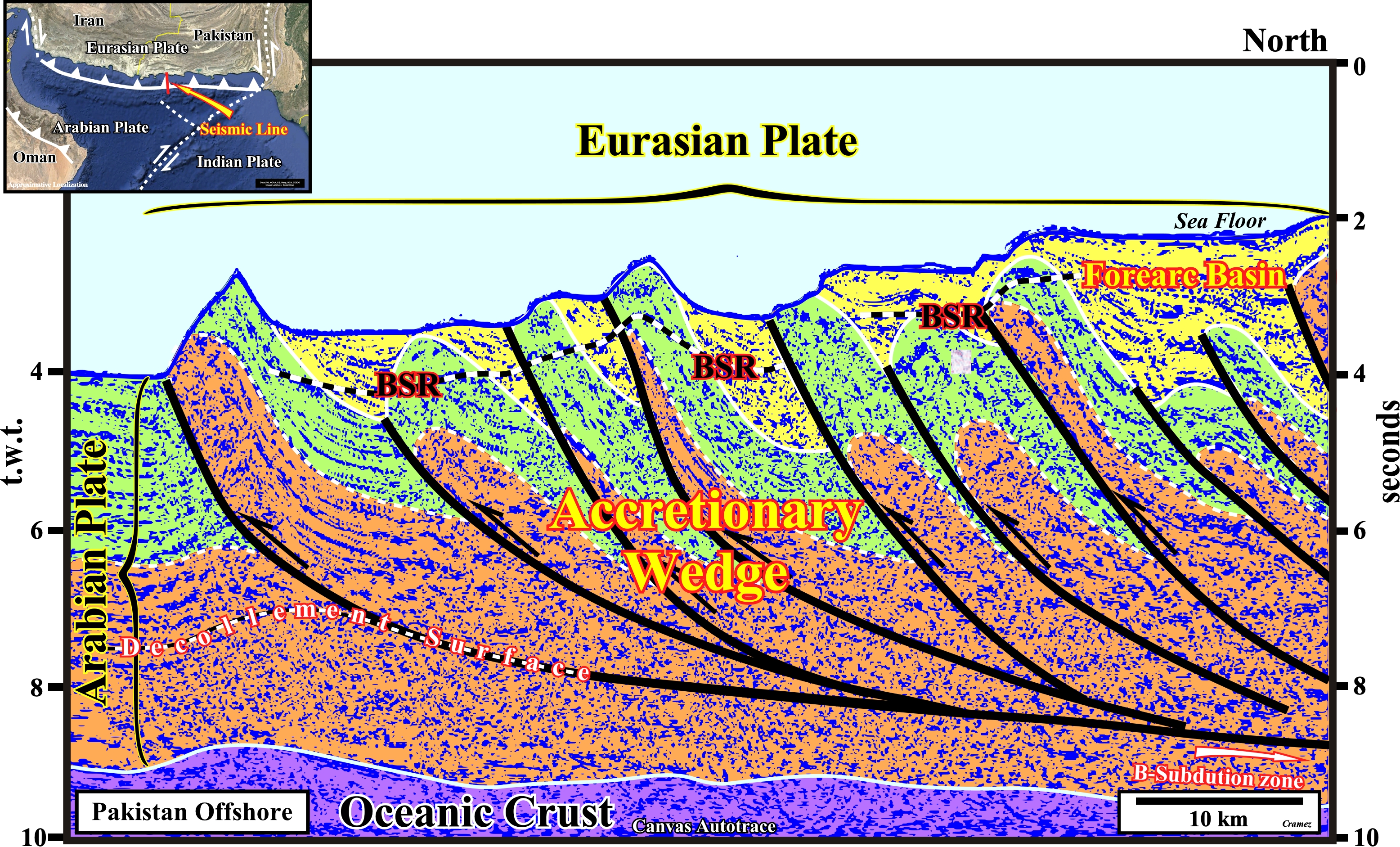 The two lithospheric plates forming the Makran subduction zone (B-type subduction or Benioff zone), i.e., the descending Arabian plate and the overriding Eurasian plate are, easily, recognized on this tentative interpretation of a Pakistan offshore seismic line. The accretionary wedge of the overriding plate is recognized by the characteristic sedimentary shortening by thrusting above a decollement surface. A BSR (bottom simulating reflector), allowing to predict a possible gas hydrate section, can be followed all along of the autotrace. A BSR is a high contrast reflector caused by a significant acoustic impedance contrast between an underlying free gas zone and overlaying gay hydrate, which tends BSR to be roughly parallel to the seafloor topography as illustrated on this tentative interpretation. A forearc basin associated with the accretionary wedge seems to be masked, partially, by the presence of the BRS and by sea floor multiple, which is not the case on the next autotrace.