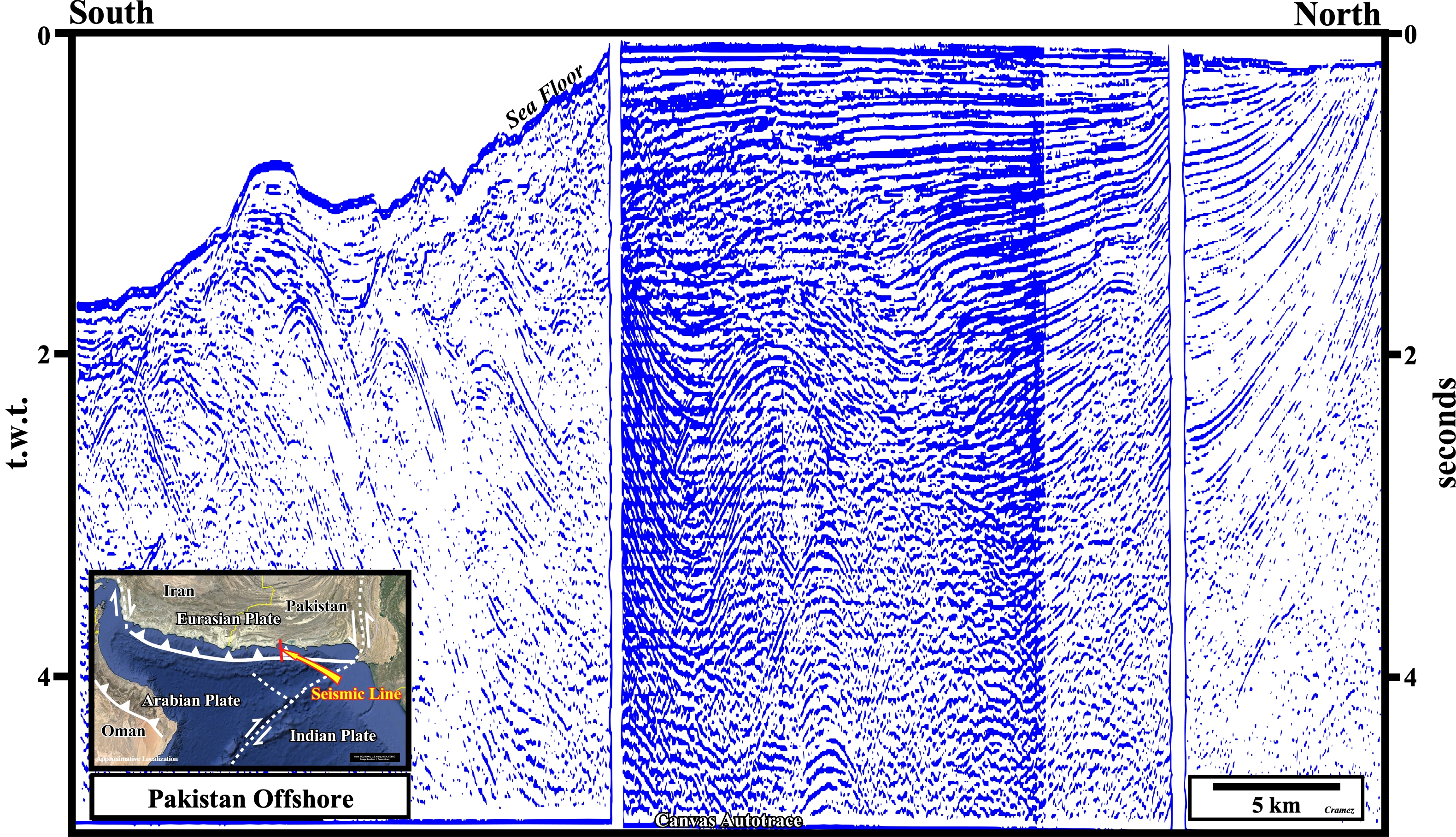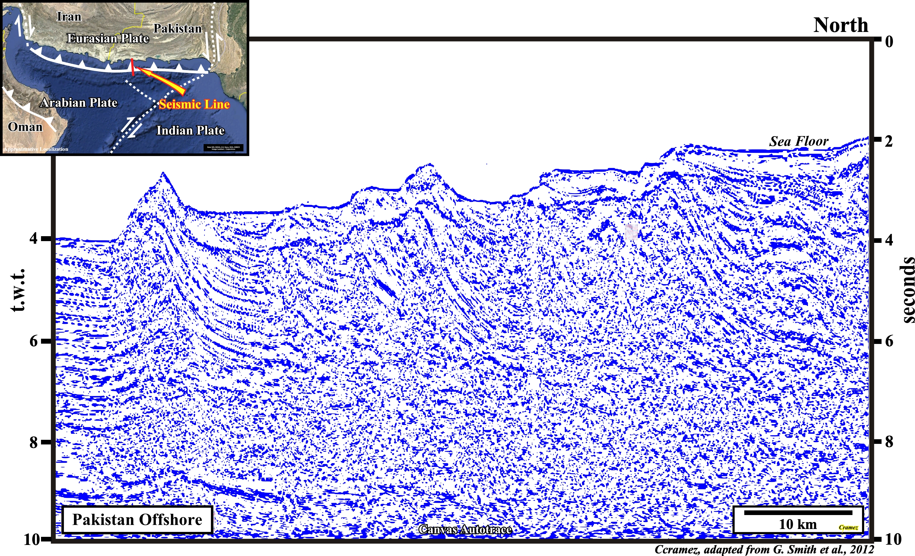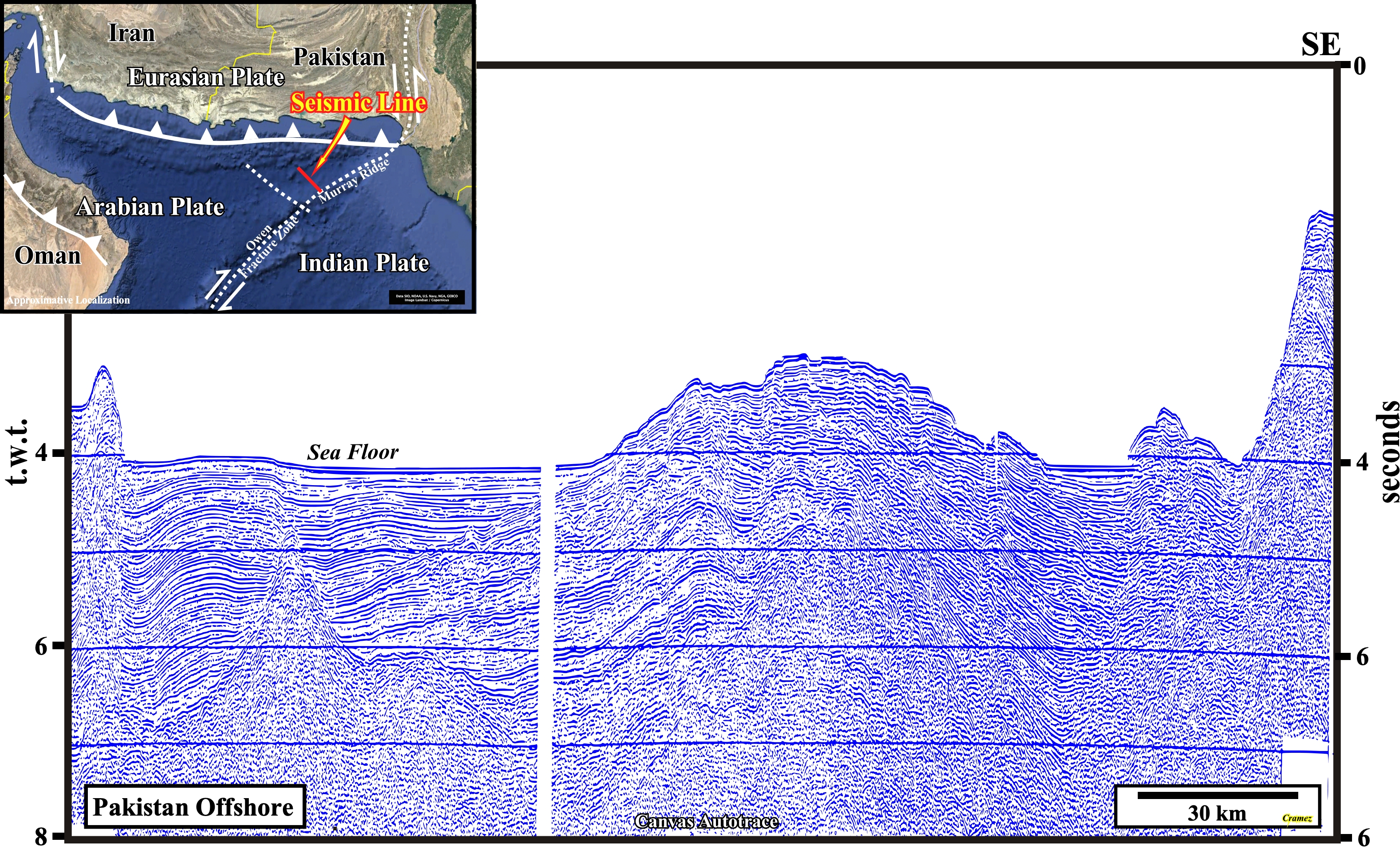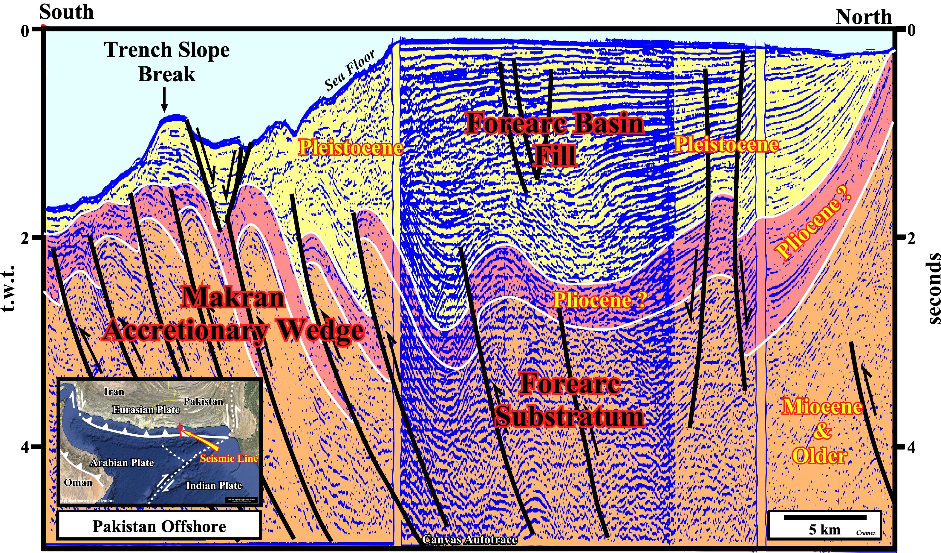 On this tentative interpretation of a Canvas autotrace of a composite seismic line of Pakistan offshore recognizing the upper continental slope and the conventional offshore, i.e., on the southern part of the Eurasian plate (overriding plate of the Makran subduction zone), the Makran accretionary prism or accretionary wedge, as well as, the forearc basin, are recognized, readily . The forearc basin is developed in the arc-trench gap, which is limited between the volcanic arc and the trench slope break (well visible on the left part of this autotrace) and filled with sediments derived from the volcanic arc or with remain of oceanic crust. The arc-trench gap depends on the angle of subduction. It can be quite narrow in steep subduction zones have relatively narrow arc-trench gaps.