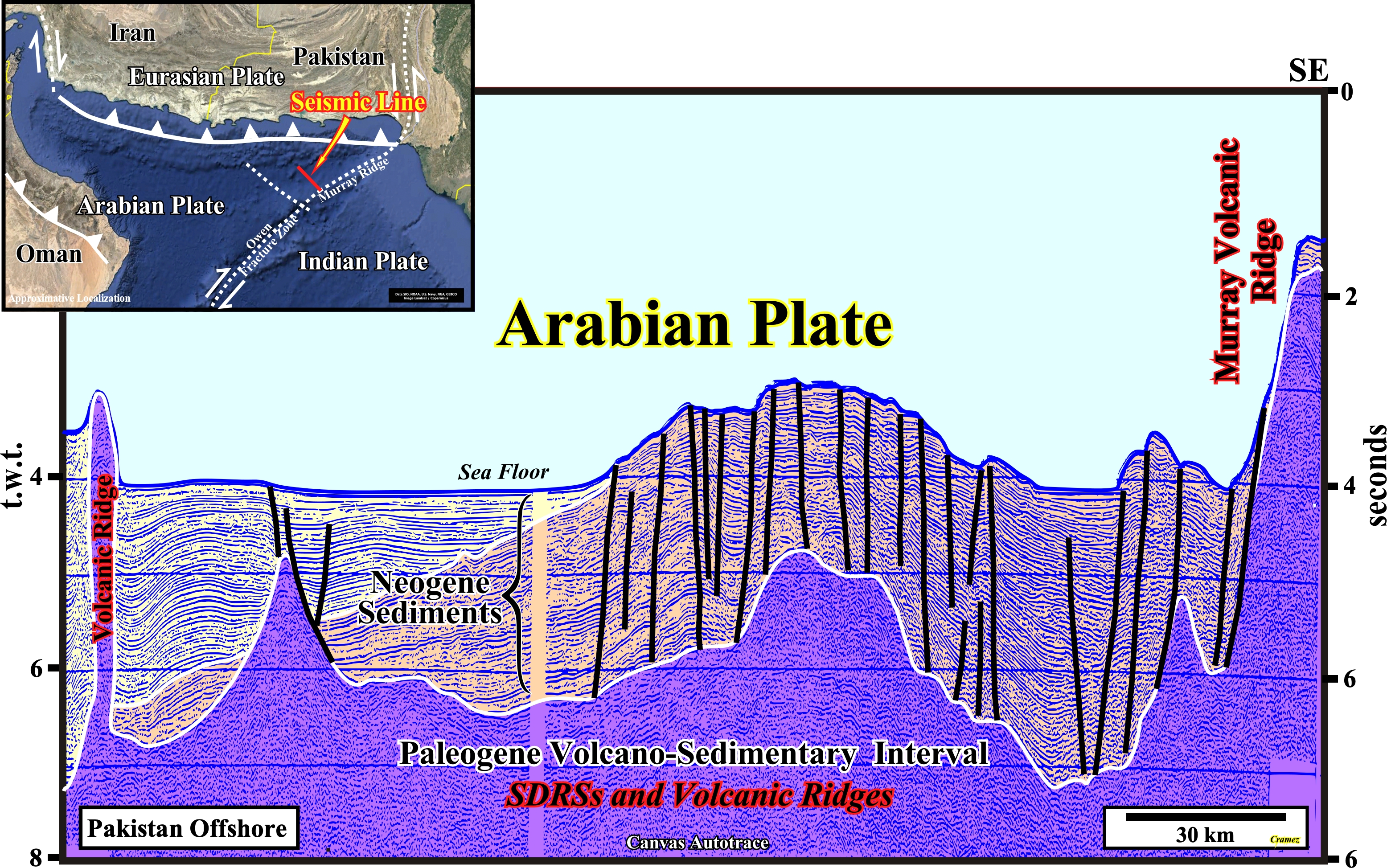 This autotrace illustrates the Neogene sediments of Arabian plate NW of the Murray ridge system, which seems to correspond to an active transform margin of the Indian plate since the Upper Cretaceous. In fact, along this transform fault (fault in which two tectonic plates slide past one another) negative and positive structures are formed in association with transpression and transtension tectonic regimes, as, for instance, the NE-SW trending Dalrymple trough where more than 8 km of clastic sediments have been accumulated in the Neogene. The rifted (lengthened) Gondwana continental crust, in which rift-type basins are developed, is covered by Paleocene volcano-sedimentary section correlated with seaward dipping reflectors (SDRs) recognized along the northern Murray Ridge, where the west oceanic crust of the Arabian Plate is subducted below the continental Eurasian Plate (Gaedicke, C. et al., 2002).