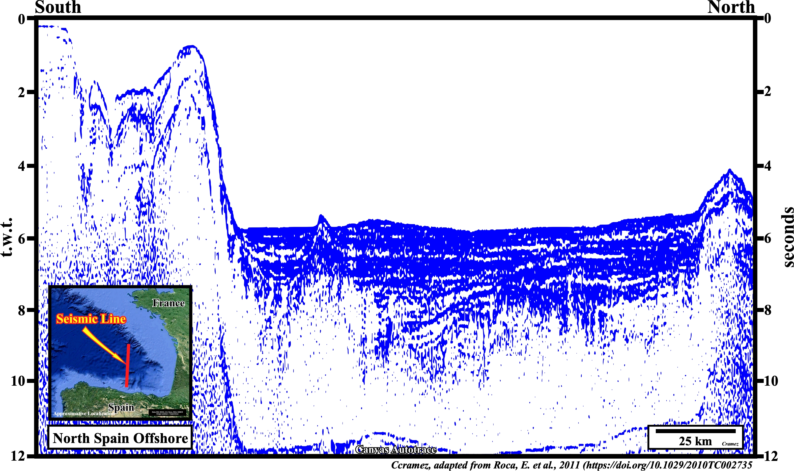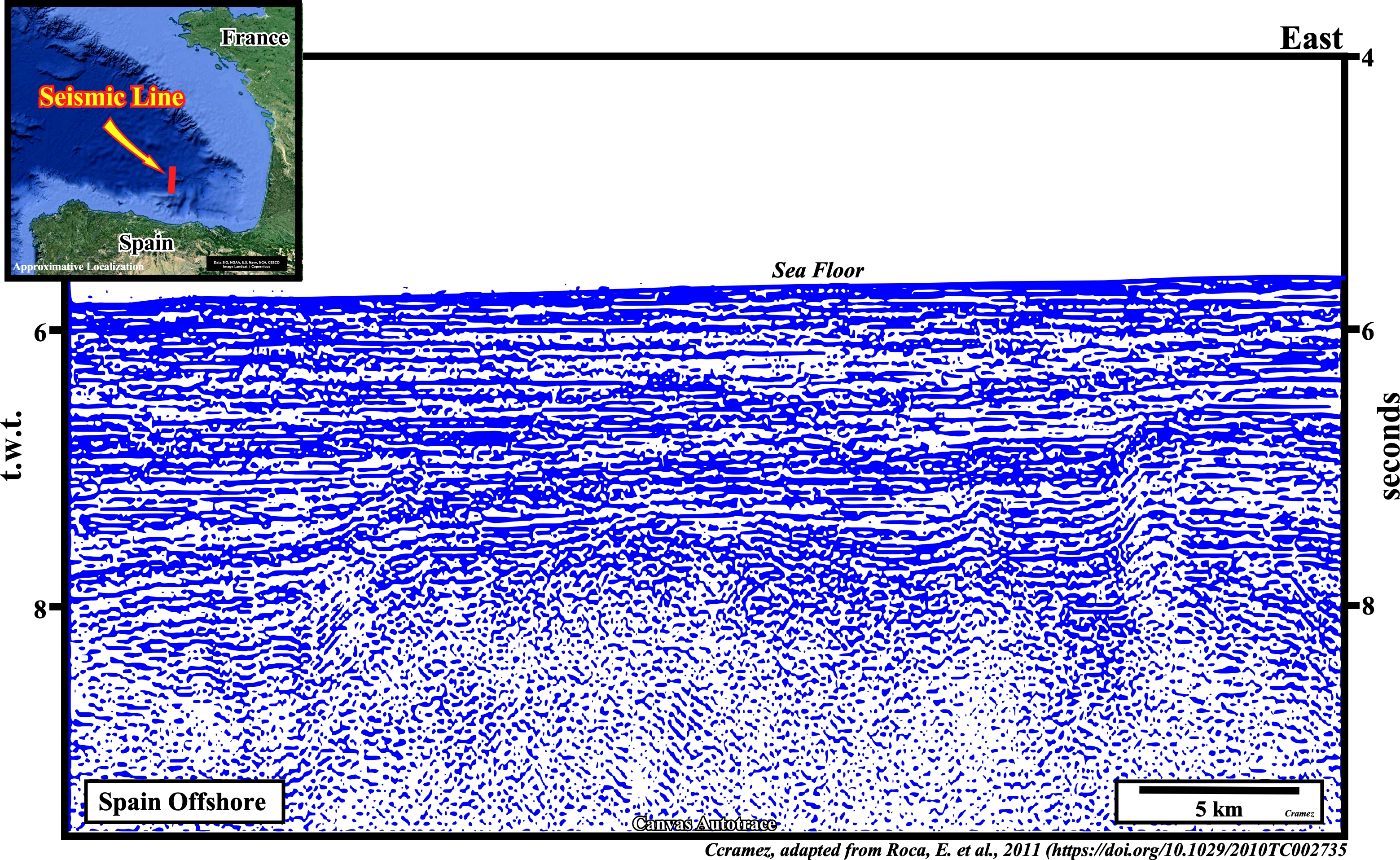 The Parentis geographic basin illustrated by this autotrace, located between an A-type subduction (continental collision boundary) at the south and the Armorican margin in the north, can be considered, in the Bally and Snelson basins' classification, as a Mesozoic perisutural basin fossilized by Paleocene to Holocene sediments. The particularity of this basin, as illustrated on this Canvas autotrace is the presence, at the bottom of the basin, of a Triassic evaporitic layer, which halokinesis creates in the Cretaceous overburden a lot of extensional structures.