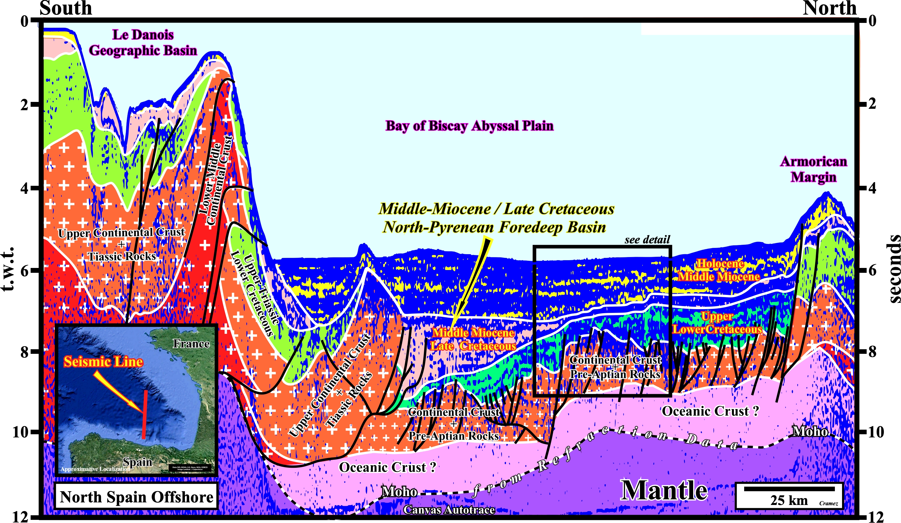On this tentative geological interpretation of a N-S seismic line shot in Gulf of Gascogne, between the "Le Danois" geographic basin and the Armorican Margin, recognizes the Bay of Biscay abyssal plain, below which is developed a Middle Miocene / Late Cretaceous North Pyrenean Foredeep basin in onlapping above Lower-Upper Cretaceous sediments as illustrated below on the autotrace of a seismic detail.