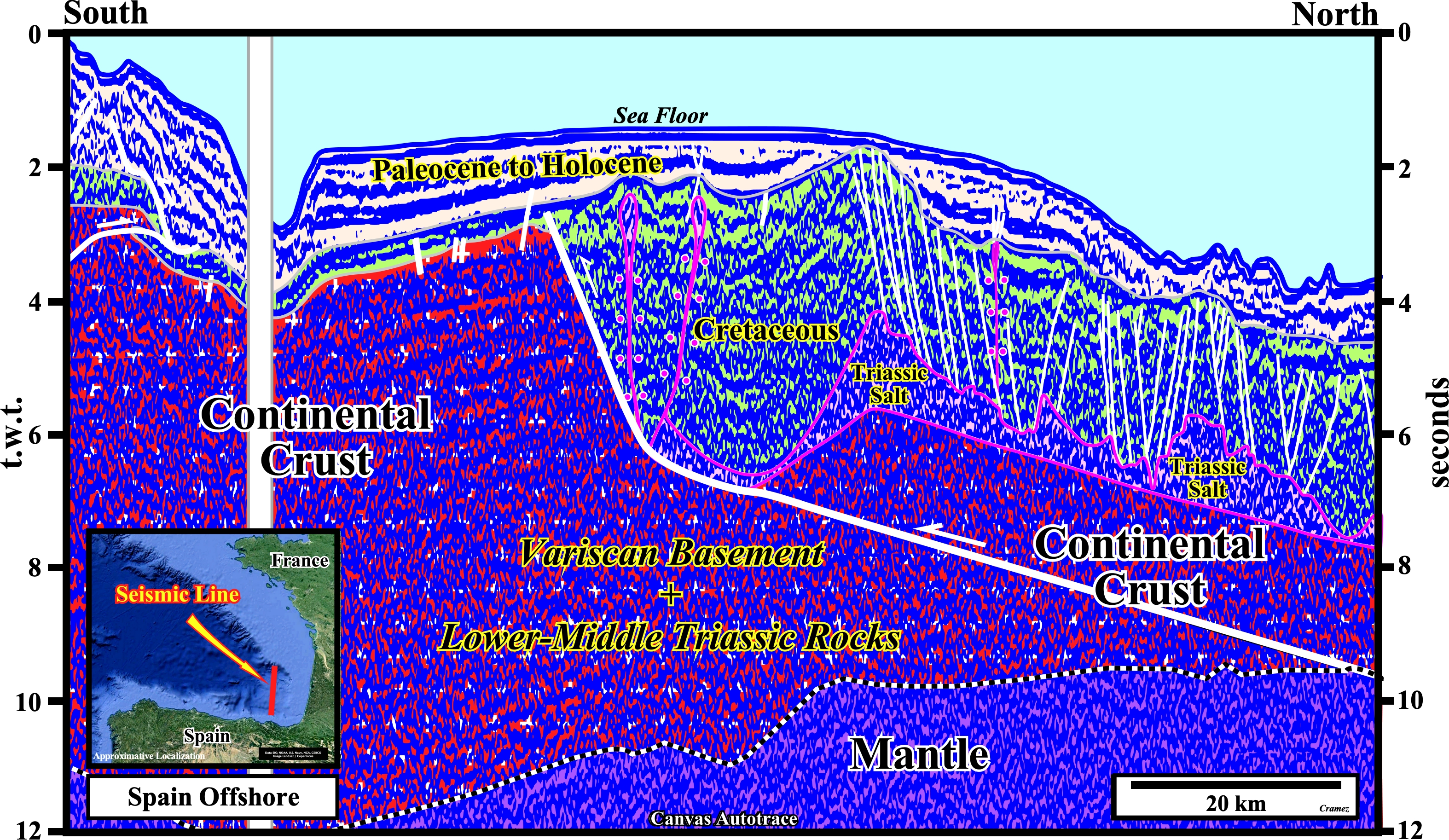 The geological context of the present Iberia-France offshore has nothing to see with a typical that of an Atlantic-type divergent margin. An A-type (Ampferer) subduction zone is, easily, recognized below the Basque-Cantabrian geographic basin. The plunging lithospheric plate (southern plate or Iberian plate) and the overriding lithospheric plate (northern plate are, easily, recognized on this schematic geological cross section. Similarly, northward of the Landes High, an evaporitic depocenter (Parentis geographic basin) is also recognized without difficulty. An advocate of volcanic continental margins can always advance the hypothesis that there are not SDRs (post breakup lava-flows) in this area because they had been sucked down by the subduction zone, what it is difficult to refute, but refutation is not synonym of validation. In fact, taking into account the tectonic context, one cannot refute the conjecture that SDRs were present, as it seems to be the case in the Armorican offshore (see Page 45), but disappeared (sucked down) along the A-subduction, in which associated folded belt and foredeep are recognized on the majority of the seismic lines of North Iberian Margin.