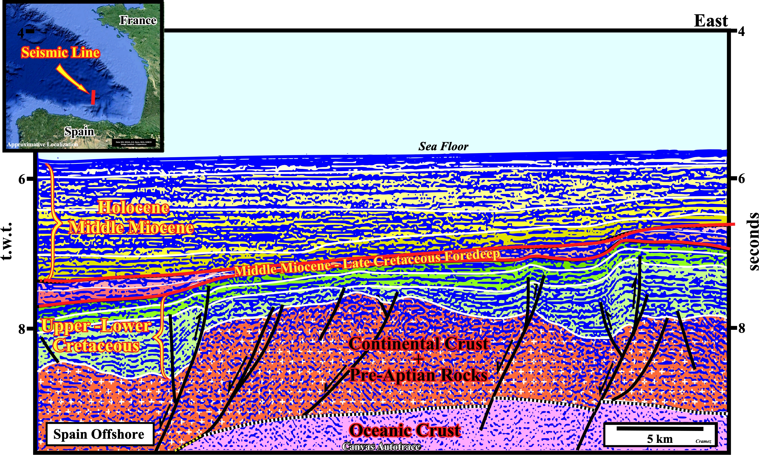 On this tentative interpretation, the onlapping of the foredeep basin sediments (Middle Miocene to Late Cretaceous) is, clearly, visible between the abyssal plain Holocene/Middle Miocene sediments and the Upper-Lower Cretaceous sediments, on the middle left part of the autotrace. The foredeep sediments are bounded by two unconformities (erosional surfaces) highlighted by an onlap (lower unconformity) and a toplap (upper unconformity) seismic surfaces.
