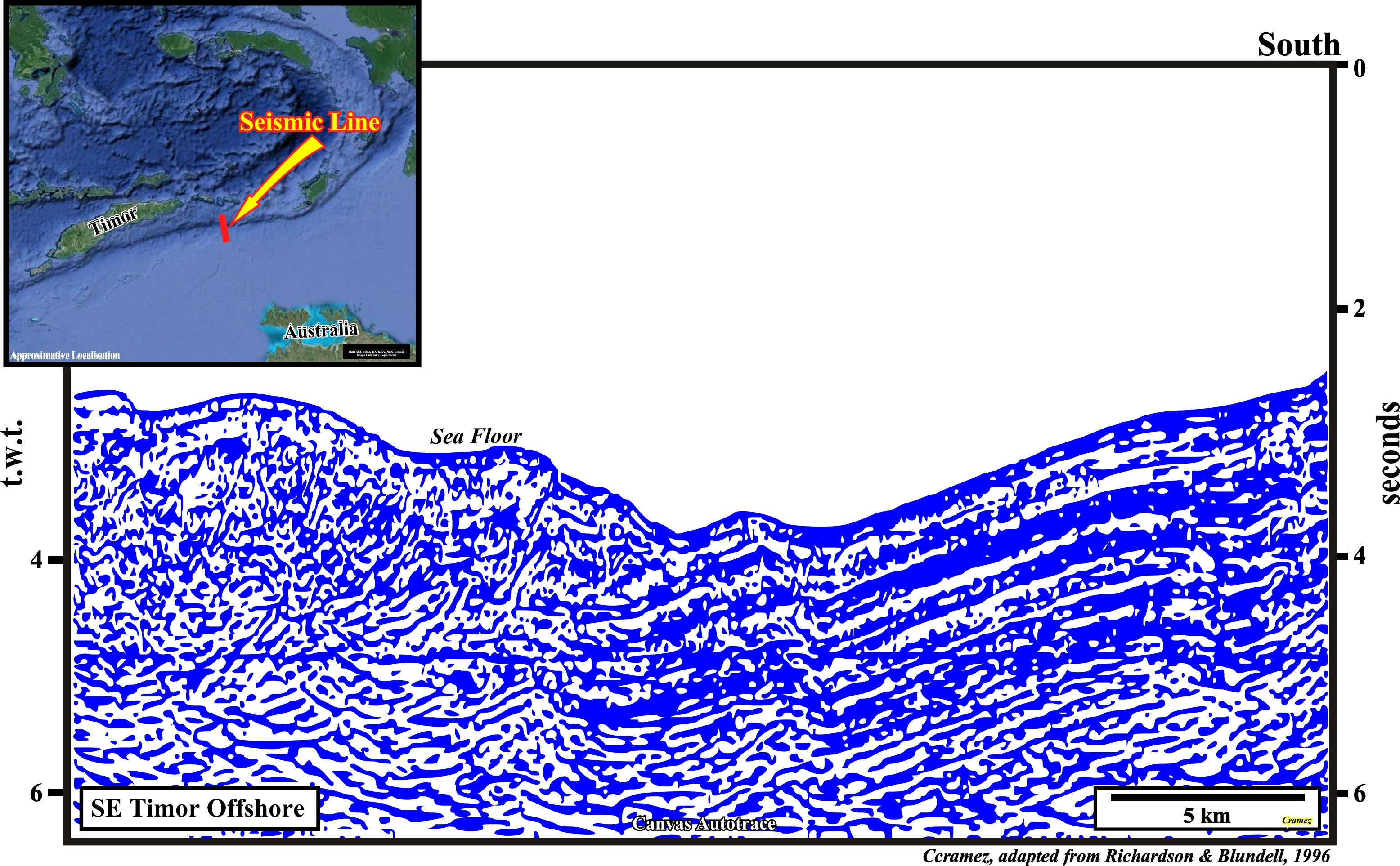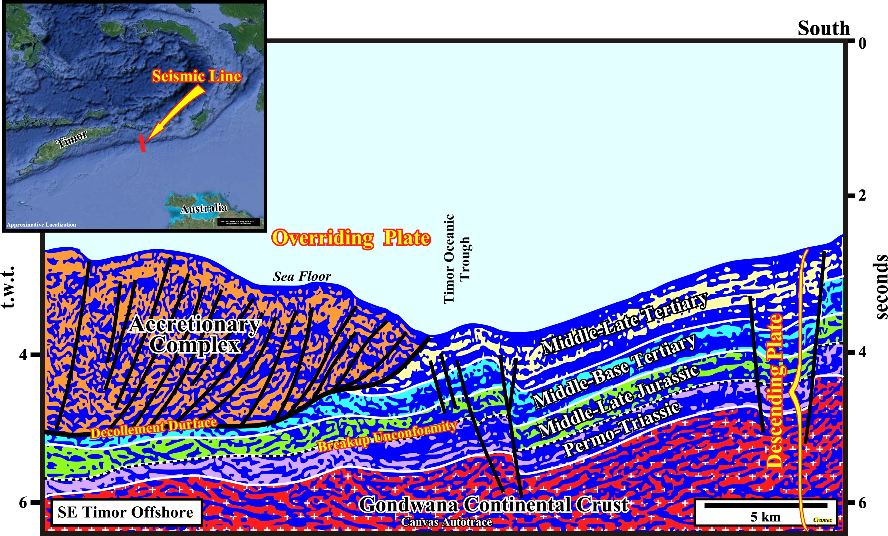 This schematic interpretation of a North-South cross-section, between the Northern Australian Shelf and the Banda Volcanic arc, explains the global tectonic context of the region, in which two convergent subduction zones seem more than likely, one explaining the Wetar volcanic arc and the other the plunging of the Australian lithospheric plate under the Wetar volcanic arc with formation of the Timor accretionary complex, as illustrated below.
