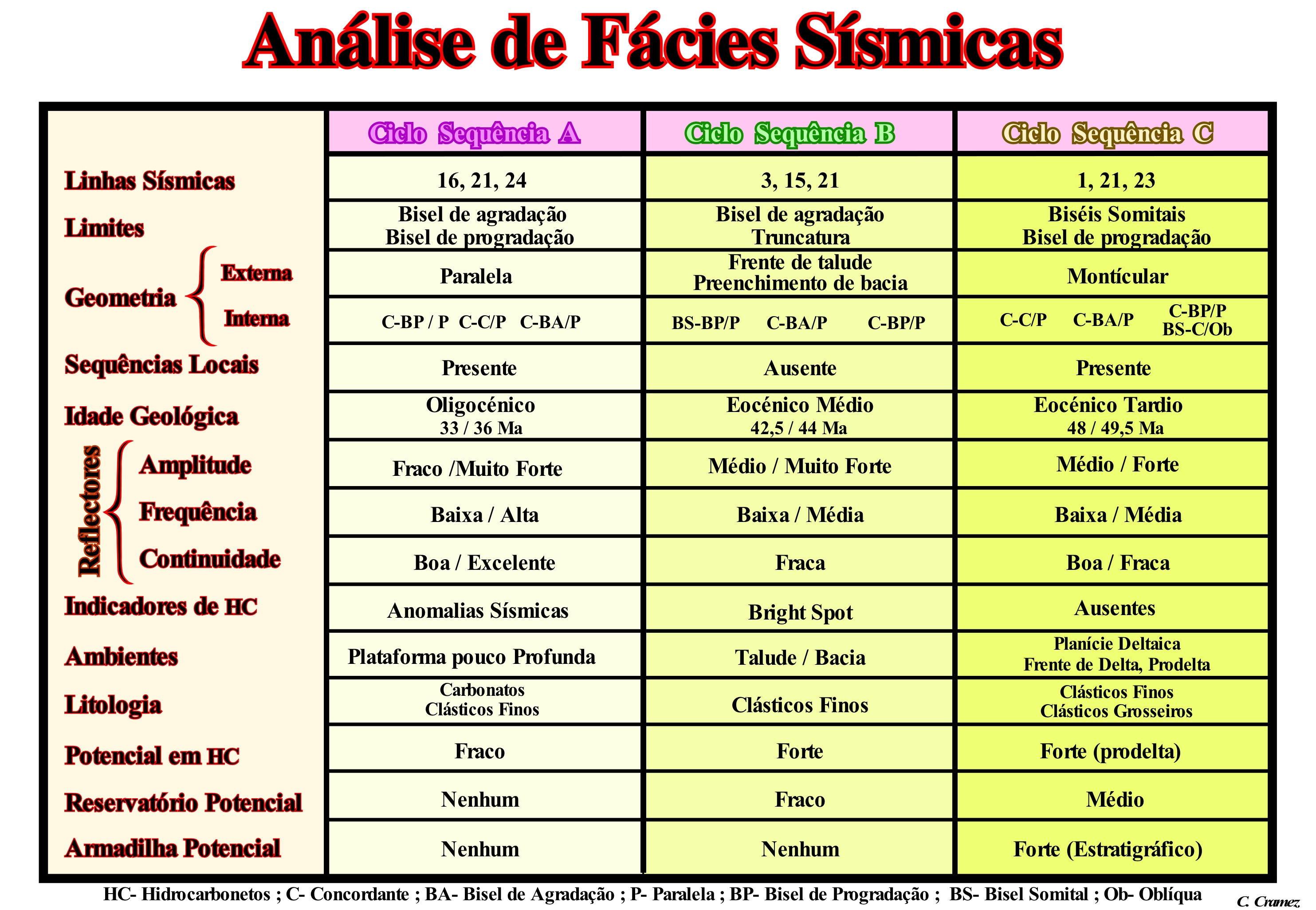 Nesta figura está ilustrado um exemplo de uma análise de parâmetros sísmicos e estratigráficos de um conjunto de linhas sísmicas do offshore profundo (lâmina de água >200 metros) de Angola (margem divergente tipo Atlântico de idade Mesozóico - Cenozóico sobrejacente a bacias de tipo rifte de idade Jurássico Tardio - Cretácico Inicial que se formaram quer por alongamento do substrato que pode ser um soco Pré-Câmbrico ou uma cadeia de montanhas dobradas e aplanadas de idade Paleozóico), nas quais três ciclos-sequência com um determinado potencial petrolífero, foram reconhecidos. Um ciclo-sequência é um ciclo estratigráfico induzido por um ciclo eustático de 3a ordem, o qual é caracterizado por ter um tempo de duração entre 0,5 e 3-5 My. Isto quer dizer, que a diferença de idade entre as discordâncias (superfícies de erosão induzidas por descidas do nível do mar relativo significativas) que limitam um ciclo-sequência tem que ser inferior 3-5 milhões de anos. Se porventura, a diferença de idade entre as discordâncias que limitam um intervalo sísmico for superior a 3-5 My e inferior a 50 My, o intervalo sísmico tem que ser considerado como um subciclo de invasão continental, o que quer dizer que ele foi induzido por um ciclo eustático de 2a ordem (duração entre 3-5 My e 50 My). Nesta análise: (i) HC, significa hidrocarbonetos ; (ii) C, significa concordante (geometria) ; (iii) BA, significa bisel de agradação ; (iv) P, significa paralelo (geometria) ; (v) BP, quer dizer bisel de progradação ; (vi) BS, bisel somital e (vii) O, quer dizer, oblíquo (configuração interna). Como se pode constatar, a amplitude, frequência e continuidade dos reflectores sísmicos, assim como, as indicações directas de presença de hidrocarbonetos (“DHI” em inglês) foram tomadas em linha de conta. Os “DHI” (“Direct Hydrocarbon Indicator” dos geocientistas de língua inglesa) são atributos sísmicos anómalos cujos padrões podem ser explicados pela presença de hidrocarbonetos numa rocha-reservatório. É, por isso, que actualmente eles são muito utilizado na pesquisa de petróleo, uma vez que eles reduzem, se resistirem a agressivos testes de refutação, de maneira substancial, o risco de fazer poços de pesquisa secos. Os principais indicadores directos de hidrocarbonetos são : (1) Pontos ou manchas brilhantes (“bright spot” em inglês), que são amplitudes, localmente, de maior magnitude que as amplitudes normais ; (2) Manchas subhorizontais brilhantes (“flat spot” em inglês), que correspondem a reflectores, mais ou menos, horizontais que cruzam as linhas cronostratigráficas e que muitas vezes indicam o plano de água ou de petróleo numa rocha-reservatório ; (3) Manchas esbatidas ou atenuadas (“dim spot” em inglês), que sublinham reflectores de fraca amplitude e (4) Inversões de polaridade (“polarity reversals” em inglês), que ocorrem quando a rocha-de-cobertura tem uma velocidade sísmica, ligeiramente, inferior à rocha-reservatório e a reflexão têm um sinal inverso. Os ambientes de deposição, as litologias (fácies) dos diferentes pacotes sedimentares e o potencial petrolífero foram preditos utilizando tentativas de interpretação geológica das linhas sísmicas em ciclos-sequência (análise sequencial). Este tipo de interpretação nunca pode ser considerado definitivo. Uma tentativa de interpretação, quer ela seja feita nas linhas sísmicas originais ou em autotraços (manuais ou automáticos) tem sempre que ser testada (criticada) com novos dados. Isto quer dizer, que um geocientista deve sempre tentar provar que a sua interpretação está errada e não fazer o contrário. O verificacionismo (tentar custe que custe provar que mesmo razão) não é o método a adoptar para fazer progressos na pesquisa geológica e petrolífera. Desde que uma tentativa de interpretação geológica de um conjunto de linhas sísmicas é proposta, o/a geocientista têm, muitas vezes, tendência a procurar, unicamente, os dados de observação que validam a sua interpretação, filtrando ou esquecendo-se dos dados que a refutam. Não há interpretações nem definitivas nem verdadeiras. A melhor interpretação é, provavelmente, aquela que resiste melhor aos testes de refutação (K. Popper, 1934). Nas tentativas de interpretação e de uma maneira geral em geologia, Verificação, Validação e Confirmação não são sinónimos. Uma hipótese geológica nunca pode ser verificada. A verdade não existe em Ciência. Certos dados podem refutar uma conjectura e outros podem corrobora-la, mas nunca verificá-la. O conceito de validação não diz respeito, directamente, à avaliação de uma conjectura em relação aos factos, mas apenas ao estudo da sua estrutura lógica. Uma hipótese científica tem toda a forma lógica de uma afirmação universal. Em sentido estrito, ela é, logicamente, impossível de verificar com certeza, mas ela é falsificável empiricamente. A análise sísmica, ilustrada nesta figura sugere, fortemente, que o ciclo-sequência que parece mais interessante ao ponto de vista da pesquisa petrolífera é, provavelmente, o ciclo sequência C, embora o parâmetro petrolífero rocha-reservatório não seja excelente.