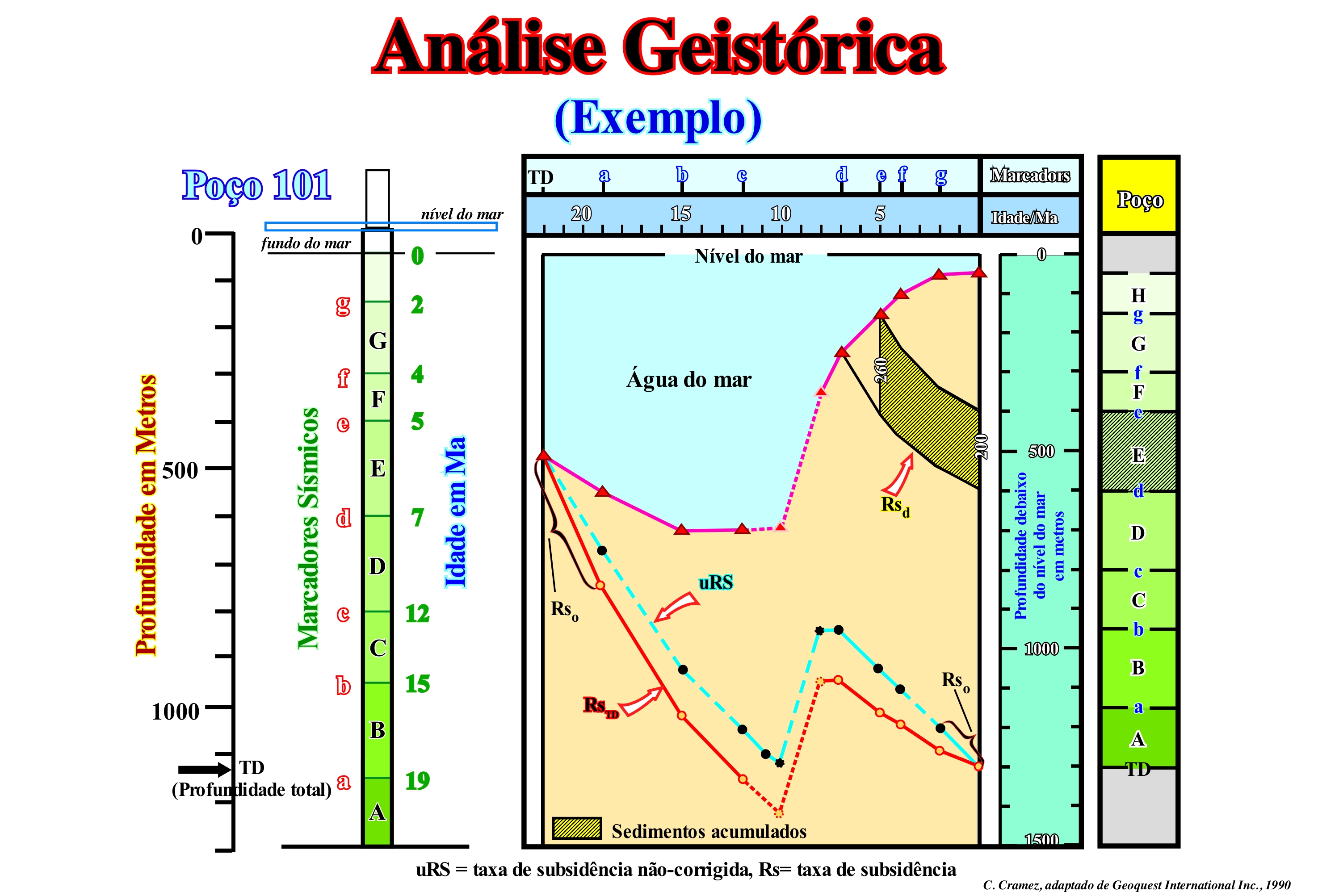 Neste poço de pesquisa petrolífera hipotético, os marcadores de referência são os fósseis encontrados nos detritos de perfuração e testemunhos, assim como, os picos dos registos eléctricos ou qualquer outro horizonte sedimentar com um valor cronostratigráfico. A espessura e a velocidade de acumulação dos sedimentos foram calculadas para cada unidade sedimentar tendo em linha de conta a completude* dos depósitos sedimentares. Os triângulos (vermelhos) são estimativas da profundidade de água de deposição. A idade dos sedimentos do funddo poço e as discordâncias** foram determinadas por extrapolação das velocidades de sedimentação. A paleobatimetria (profundidade de água de deposição) é representada pelos triângulos. A espessura cumulativa, para cada nível, está ilustrada pelos círculos negros e alaranjados. As linhas tracejadas, que ligam os círculos, representam a espessura actual e as linhas contínuas representam as espessuras restauradas. A inclinação das linhas dá a velocidade da subsidência não-corrigida (uRs) e a velocidade da subsidência corrigida (Rs). A história da subsidência de uma unidade (com correcção da compactação) pode ser apresentada como indicado pela área riscada, como, por exemplo, a do intervalo E. A redução vertical é devida à compactação. Como as flutuações do nível do mar (variações do nível do mar relativo ou seja do nível do mar resultante da combinação da nível do mar absoluto ou eustático*** e da tectónica) afectam a paleobatimetria, a curva global das mudanças aparentes dos biséis de agradação é a parte horizontal do eixo no topo do diagrama. Numa análise da geistória de uma bacia, quando as taxas de deposição e subsidência são calculadas, é possível prever em que altura a matéria orgânica das rochas-mãe potenciais atingiu a maturação, quer isto dizer, quando elas geraram hidrocarbonetos (petróleo ou gás). Os intervalos de erosão ou de sem deposição, determinam quando a diagénese produziu uma porosidade secundária num determinado intervalo ou quando esta desapareceu, por erosão, de uma parte dos registos sedimentares. Um levantamento geológico (encurtamento) reactiva não só evolução da curva de subsidência, mas também a maturação da matéria orgânica, formação de armadilhas (estruturais) e migração dos hidrocarbonetos.