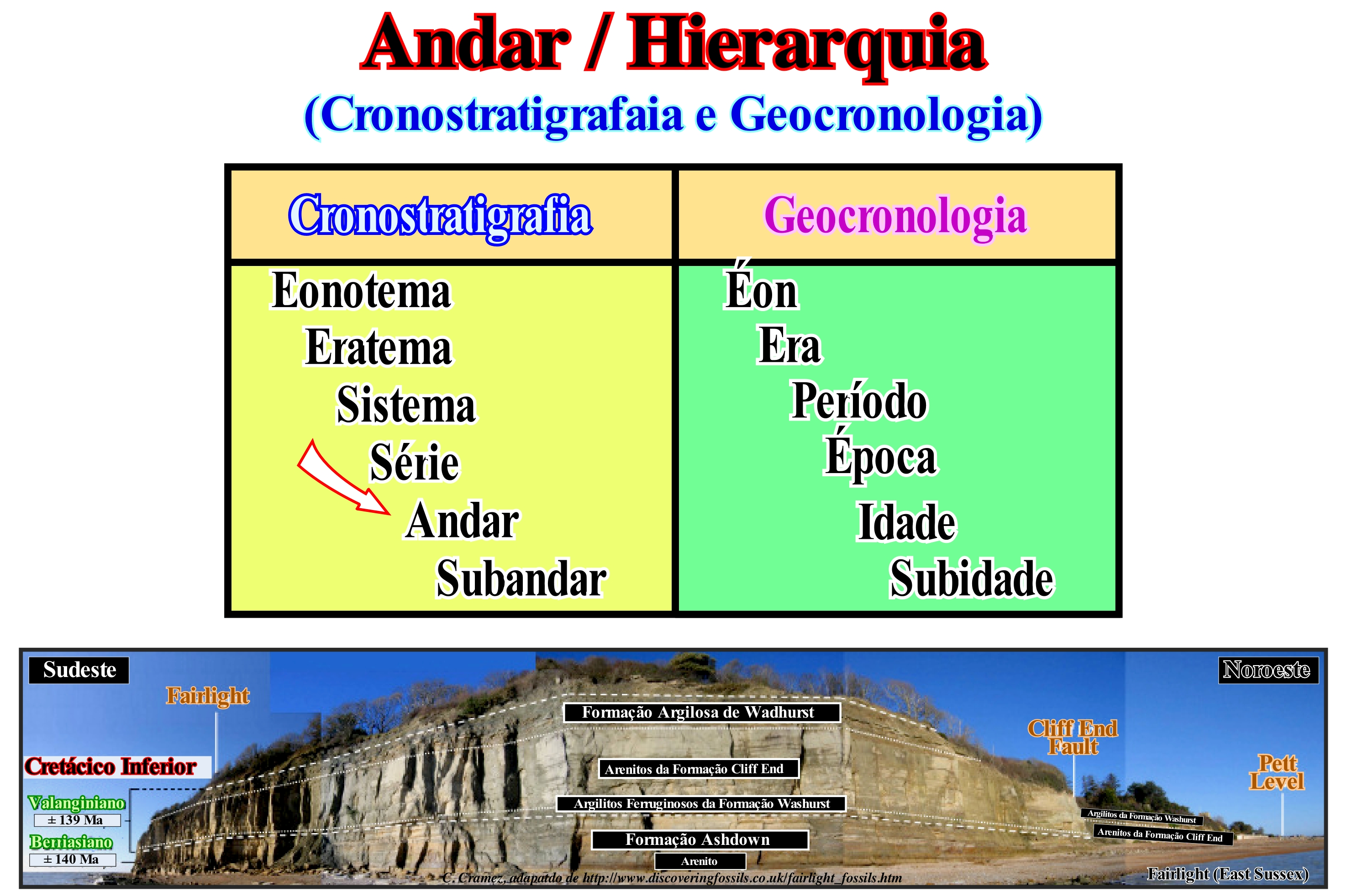 O andar é o equivalente cronostratigráfico (conjunto de rochas) de uma idade, a qual é uma unidade geocronológica (tempo). Esta diferenciação é muito importante, mas ela é, muitas vezes, esquecidas por muitos geocientistas que continuam a utilizar termos, completamente, diferentes como sinónimos. Em certas cartas geológica oficiais, pode constatar-se, por exemplo, que os termos Cretácico Superior e Cretácico Tardio são utilizados como sinónimos, quando na realidade eles designam coisas, completamente, diferentes. O Cretácico Superior refere-se às rochas que se depositaram durante o Cretácico Tardio, o qual é um intervalo tempo. Ademais, o período de tempo geológico do Cretácico Tardio não corresponde à soma do tempo de deposição das rochas do Cretácico Superior. O tempo efectivo de deposição das rochas de uma unidade cronostratigráfica é sempre muito mais pequeno do que o tempo da unidade geocronológica. Isto quer dizer, que durante a maior parte do tempo geológico nada se passa. Imagine um andar (intervalo cronostratigráfico, isto é, um conjunto de rochas) limitado por duas discordâncias (superfícies de erosão induzidas por descidas significativas do nível do mar relativo). A discordância inferior é de idade 10,5 Ma (milhões de anos atrás), enquanto que a discordância superior é de idade 8,2 Ma, Os sistemas de deposição que o formam esse intervalo sedimentar são cones submarinos de bacia (CSB). O intervalo geocronológico é de 2,3 My (milhões de anos) e, em termos de estratigrafia sequencial, ele corresponde a um ciclo estratigráfico induzido por um ciclo eustático de 3a ordem (tempo de duração entre 0,5 e 3-5 My) chamado ciclo-sequência*. Contudo, a soma dos tempos de deposição efectiva desse intervalo cronostratigráfico correspondem talvez a menos de 100 ky. O tempo de deposição de cada corrente turbidítica é, geologicamente, instantâneo, enquanto que o tempo entre cada corrente pode ser superior a 1000 anos e que durante todo esse tempo, praticamente, nada se passa ao ponto de vista estratigráfico, o que quer dizer que não há deposição.