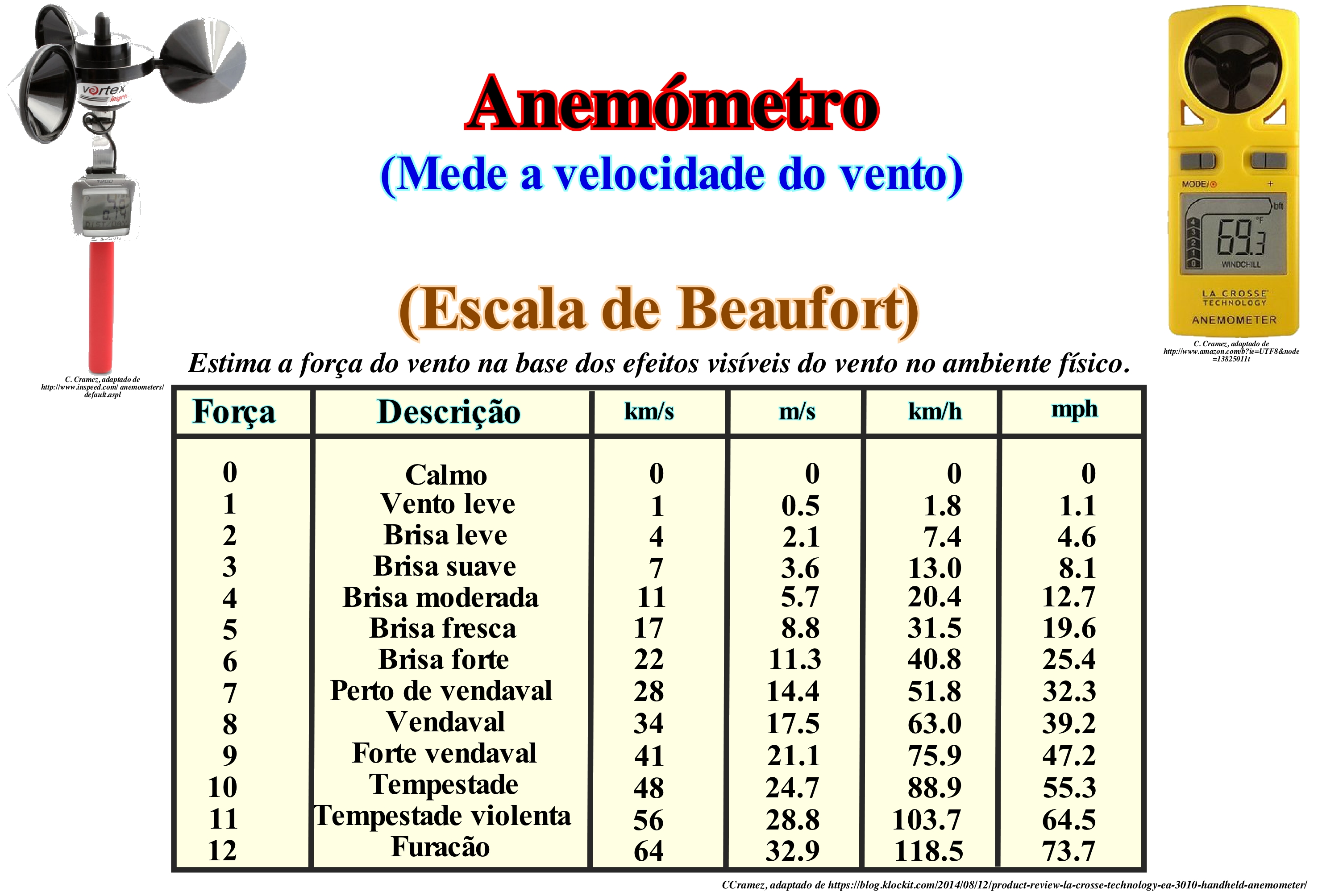 Aparelho que mede a velocidade do vento. Existem dois tipos de anemómetros: (i) Os que medem directamente a velocidade do vento e (ii) Os anemómetros que medem também a pressão do vento.