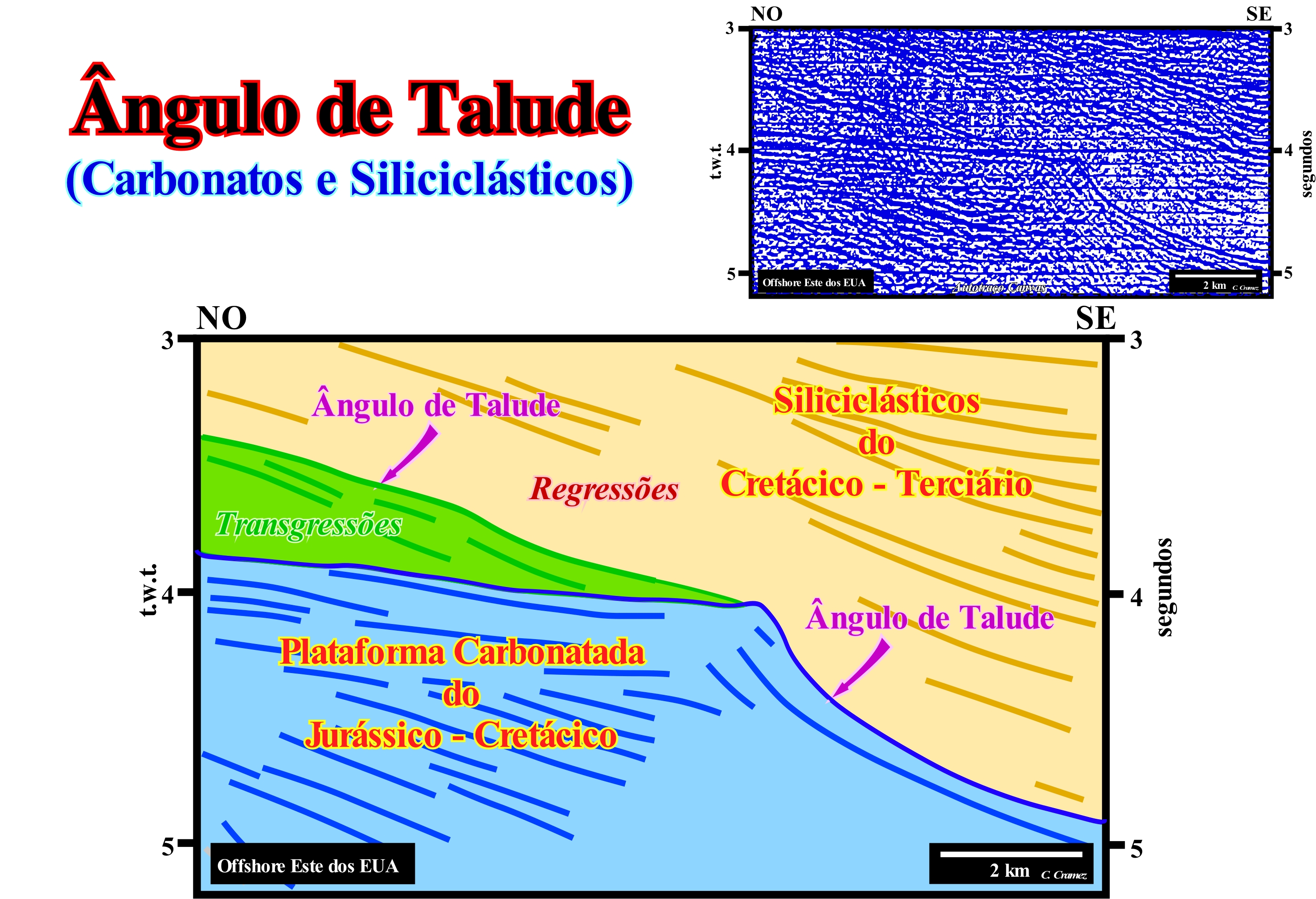 Como ilustrado nesta figura, os rios anastomosados ou entrelaçados, como dizem certos geocientistas, ocorrem a montante da linha de baía, a qual corresponde à ruptura de inclinação de uma linha cronostratigráfica que delimita os aluviais (a jusante) e os depósitos fluviais (a montante). Na realidade, ao longo de uma linha cronostratigráfica, que, por definição, sublinha uma superfície de deposição, existem várias rupturas de inclinação. Rio abaixo ou seja de montante para jusante, elas são: (i) Ruptura la linha de baía ; (ii) Ruptura costeira ; (iii) Ruptura deltaica ; (iv) Ruptura continental e (v) Ruptura da planície abissal. A primeira ruptura limita os depósitos fluviais, nos quais a influência das variações do nível do mar relativo é, praticamente, inexistente, dos depósitos aluviais (a jusante), os quais são influenciados, parcialmente, pelas variações do nível do mar relativo. Não esqueça que na estratigrafia sequencial é imperativo considerar dois tipos de nível do mar: (i) Nível do Mar Absoluto ou Eustático, que é global e referenciado ao centro da Terra ou a um satélite e (ii) Nível do Mar Relativo que é local e referenciado quer ao topo da crusta continental (base dos sedimentos, quer ao fundo do mar, quer a qualquer outro ponto fixo da superfície terrestre. O nível do mar absoluto é dependente da tectonicoeustasia (controlada pela variação do volume das bacias oceânicas), da glacioeustasia (controlada pela variação de volume de água dos oceanos), da geoidaleustasia (controlada pela distribuição da água dos oceanos causada pelas variações do campo da gravidade terrestre) e da dilatação térmica dos oceanos ou aumento estérico do nível do mar. O nível do mar relativo é o resultado da combinação do nível do absoluto e da tectónica (subsidência, quando o regime tectónico predominante é de alargamento ou levantamento, quando o regime tectónico é de encurtamento). A ruptura costeira corresponde, mais ou menos, a linha da costa e assim, pode dizer-se que ela separa os depósitos marinhos dos depósitos não-marinhos. A ruptura deltaica corresponde, mais ou menos, ao limite entre os sedimentos de frente do delta e os argilitos do prodelta (não diga argilas do prodelta uma vez que argila, em português, corresponde, para a maior parte dos geocientista, a uma granulometria e não a uma rocha). A ruptura continental, correspondem a ruptura da plataforma, quando a bacia tem uma plataforma, ou à ruptura da planície costeira quando a bacia não tem plataforma continental (condições geológicas de nível baixo do mar) e marca a passagem dos depósitos de água pouco profunda a depósito profundos. A ruptura abissal marca o início da planície abissal. É a partir desta ruptura que se depositam os cones submarinos profundos (de bacia e de talude).