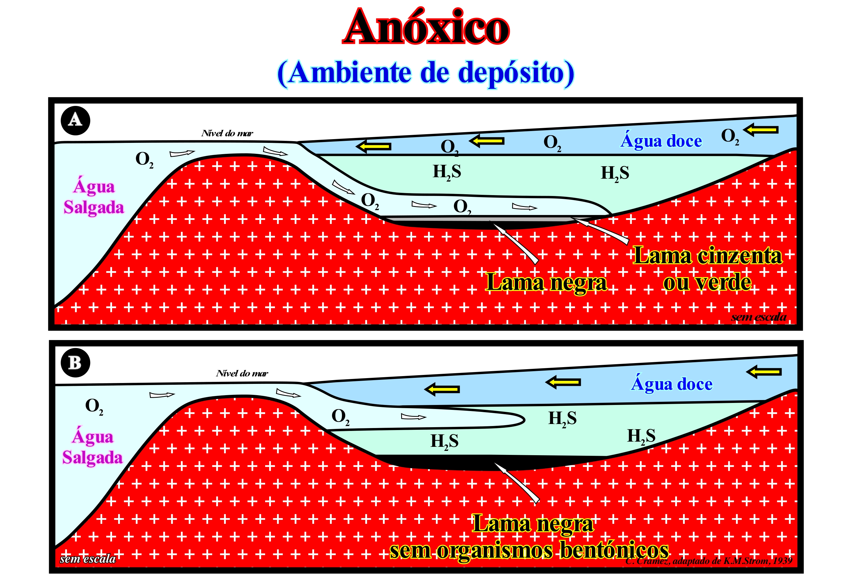 Nesta figura, dois ambientes aquáticos, com saturações em oxigénio dissolvido diferentes e com um nível letal, entre eles, são, facilmente, reconhecidos. A existência de ambientes anaeróbicos, debaixo de ambientes aeróbicos, favorece e permite a formação de intervalos sedimentares ricos em matéria orgânica, o que é a condição sina qua non para a formação de rochas-mãe potenciais. Estas condições ambientais são muito frequentes em corpos de água, mais ou menos fechados, e em determinadas plataformas continentais, sobretudo quando elas são invadidas por correntes ascendentes. Neste tipo de plataformas, a invasão de correntes ascendentes frias (ricas em oxigénio e em nutrientes) permite um grande desenvolvimento da fauna e flora na zona fótica, sobretudo na parte distal da plataforma, em condições geológicas de nível alto do mar*. Quanto mais fria é uma corrente ascendente, mais rica ela é em oxigénio e em nutrientes, o que favorece a cadeia alimentar: (i) Fitoplâncton ☛ (ii) Zooplâncton ☛ (iii) Zooplâncton predador ☛ (iv) Animais com alimentação por filtragem (e.g., esponjas, baleias, etc.) ☛ (v) Peixes e Animais predadores ☛ (vi) Homem. Lembremos que uma corrente ascendente é um processo pelo qual água fria e profunda do oceano vem à superfície. Quando o vento sopra sob uma área do oceano, o vento empurra, na direcção do vento, a água do oceano, o que provoca uma ascensão da água profunda para a superfície afim substituir a água deslocada pelo vento. A aparição destas correntes ascendentes ocorre no oceano aberto e ao longo dos litorais. O processo inverso, ou seja a formação de correntes descendentes, ocorre quando o vento faz com que as águas superficiais se acumulem ao longo de um litoral e a água de superfície mergulha em direcção ao fundo do mar. No mundo, existem cinco grandes correntes ascendentes : (a) Corrente das Canárias ; (b) Corrente de Benguela ; (c) Corrente da Califórnia ; (d) Corrente de Humboldt (Peru e Chile) e (e) Corrente da Somália. A água de uma corrente ascendente é, geralmente, mais fria e é rica em nutrientes, o que fertiliza, localmente, as águas superficiais que, geralmente, possuem alta produtividade biológica. Taxas de sedimentação muito fracas ocorrem na parte distal das plataformas continentais, durante as subidas em aceleração do nível do mar relativo, isto é, durante ingressões marinhas, cada vez mais importantes, entre as quais se depositam regressões sedimentares cada vez mais pequenas que, colectivamente, formam o intervalo transgressivo (IT) dos ciclos-sequência**. A grande explosão da fauna e flora, que ocorre na parte distal das plataformas afectadas por uma corrente ascendente, consome muito oxigénio, o que, pouco a pouco, empobrece a parte inferior da coluna de água em oxigénio tornando-a anaeróbica. A formação de uma zona anaeróbica inferior permite a preservação da matéria orgânica morta que se deposita no fundo do mar, antes que ela seja fossilizada pelo depósito dos sistemas regressivos.