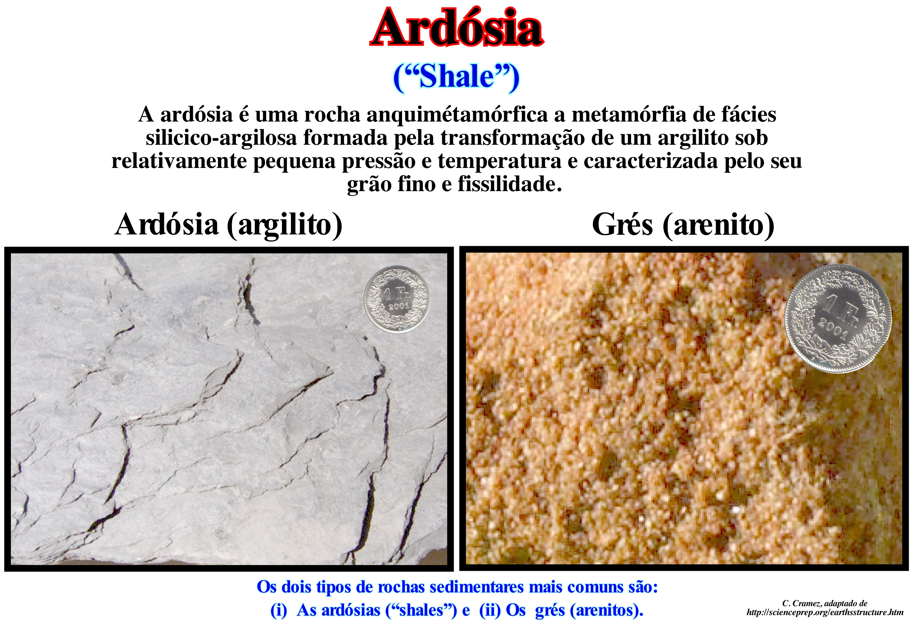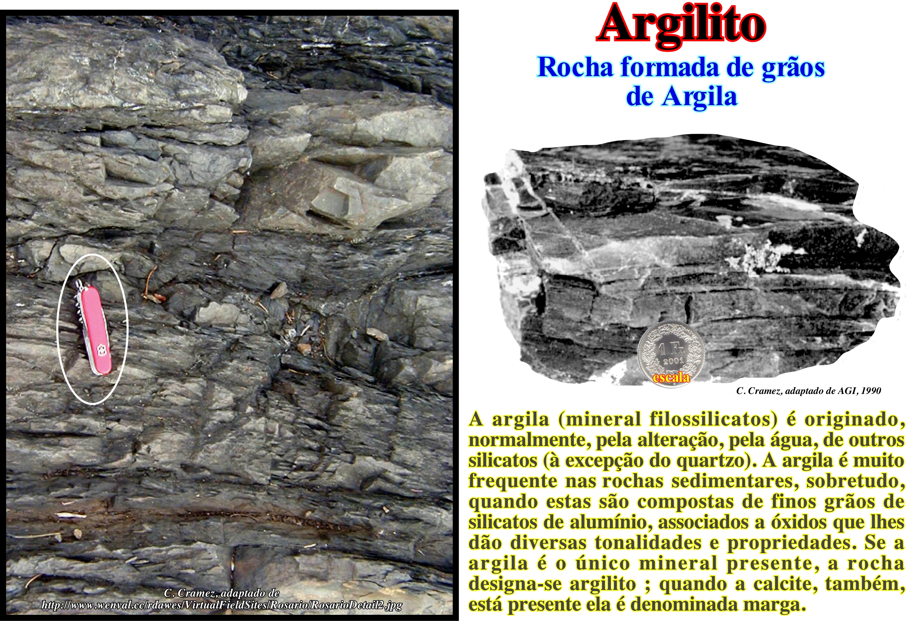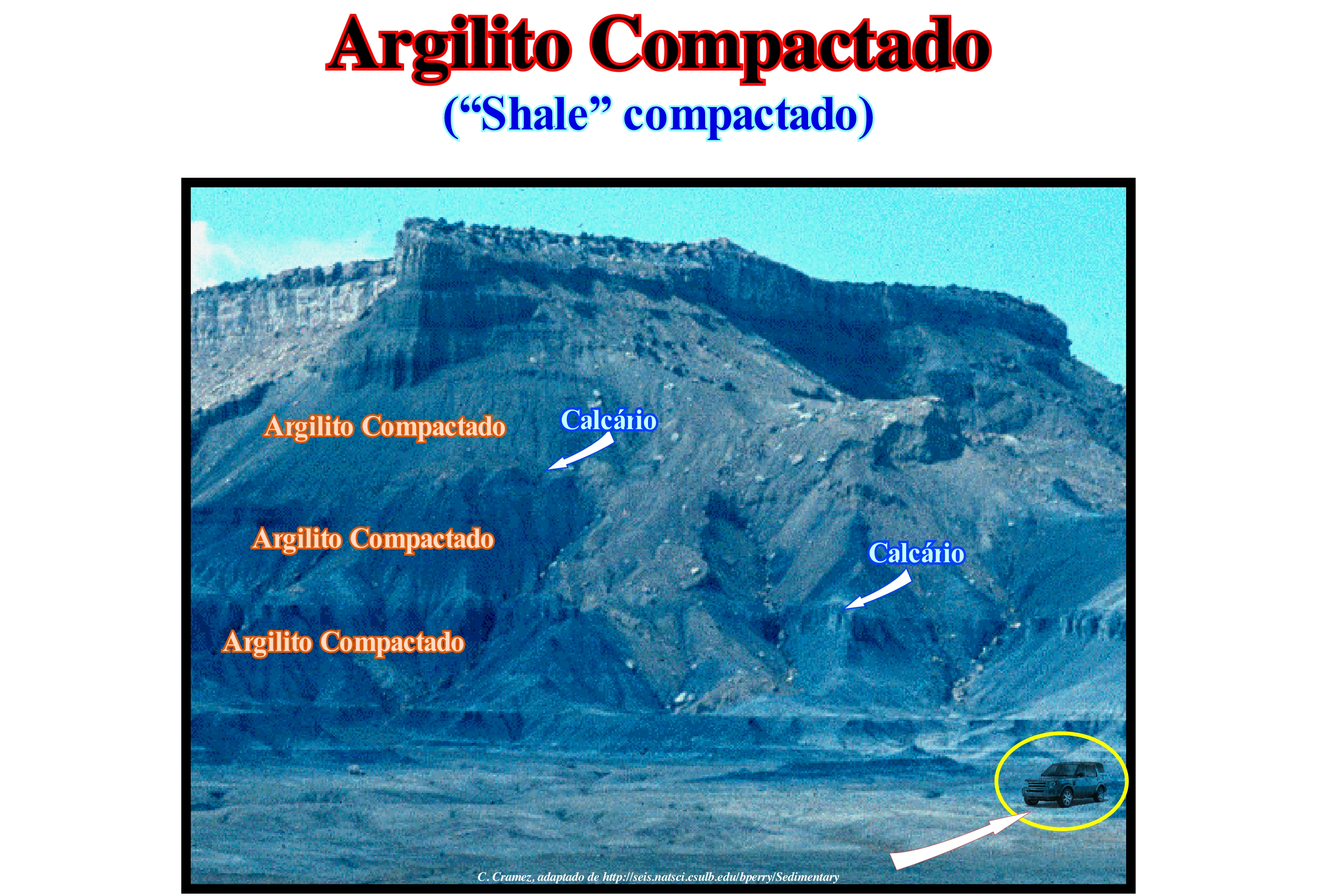 (*) Para a grande maioria dos geocientistas anglo-saxões um “shale” é uma rocha sedimentar clástica, de grão fino, composta de lama, ou seja, de uma mistura de flocos de minerais de argila e minúsculos fragmentos de outros minerais, especialmente quartzo e calcite (a proporção de argila para outros minerais é variável), caracterizado por apresentar rupturas ao longo de lâminas finas, folhas paralelas ou camadas com menos de um centímetro de espessura, denominada fissilidade. Os "mudstones", por outro lado, são semelhantes em composição, mas não mostram a fissilidade.