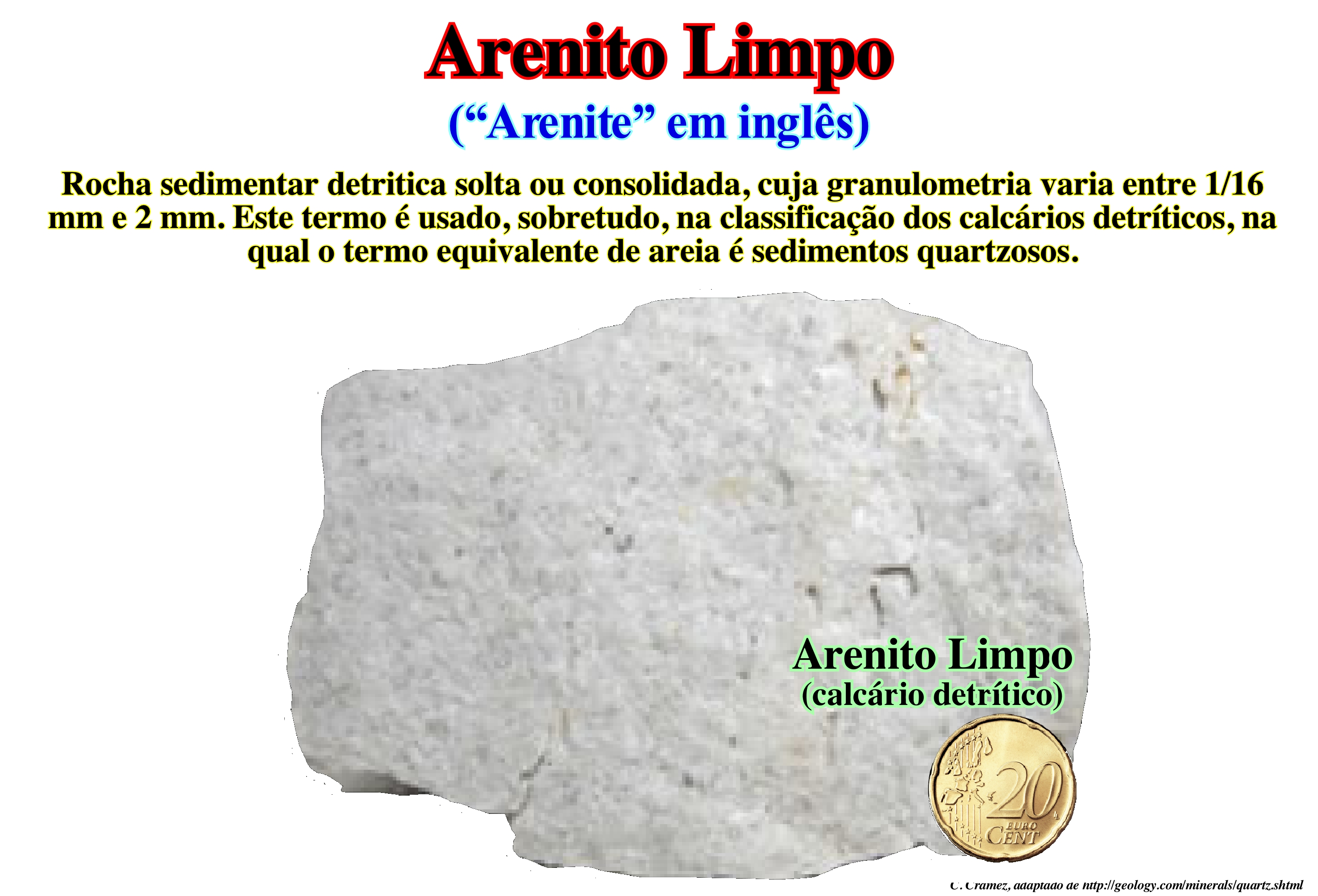 Esta amostra (arenito limpo de Oriskany, Oeste Virginia, EUA) é, praticamente, constituído a 99% de quartzo puro. Este tipo de arenito é utilizado na fabricação de recipientes de vidro e, muitas vezes, na fabricação de lentes para telescópios. Os cristais de quartzo de mais alta qualidade são os cristais de sílica que têm propriedades ópticas e electrónicas*. Segundo USGS (Serviços Geológicos dos Estados Unidos) cerca de dez mil milhões de cristais de quartzo são utilizados todos os anos na industria. Os cristais de quartzo com propriedades electrónicas são utilizados como filtros, controladores de frequência, temporizadores, circuitos electrónicos, que se tornam indispensáveis nos componentes de telefones celulares, relógios, jogos, televisão, computadores, instrumentos de navegação e outros produtos. Os cristais de quarto com propriedades ópticas são utilizados na fabricação de lentes e janelas de lasers e outros dispositivos especializados. Actualmente, a grande maioria dos cristais de quarto utilizados na industria não são cristais naturais, tirados dos arenitos limpos, mas cristais fabricados. Este tipo de arenito tem excelentes características petrofísicas. Com uma forte permeabilidade, induzida pela presença de grandes poros perfeitamente conectados uns com os outros, os arenitos limpos formam excelentes rochas-reservatório para os hidrocarbonetos, embora, por vezes a porosidade seja, relativamente, pequena. O grande tamanho dos poros pode criar problemas de perfuração, em particular perdas da lama de perfuração importantes. A formação Mirador, no campo petrolífero de Cusiana (Colômbia) pode ser considerada como uma arenito limpo (teor de argila muito baixo). A mineralogia típica desta formação é de 78% de grãos de quartzo, 14% de cimento de quartzo e uma porosidade de cerca de 8%. Apesar da baixa porosidade, a permeabilidade é elevada. A uma porosidade de 8% corresponde uma permeabilidade de 100 mD (ou 100 milidarcis**. Para uma porosidade de 10%, a permeabilidade é de 400 mD. A permeabilidade é função da granulometria. Quando a rocha-reservatório é um arenito limpo grosseiro com uma porosidade de 10%, a permeabilidade é 800 mD. Um arenito limpo fino de 10% de porosidade tem uma permeabilidade de 90 mD.