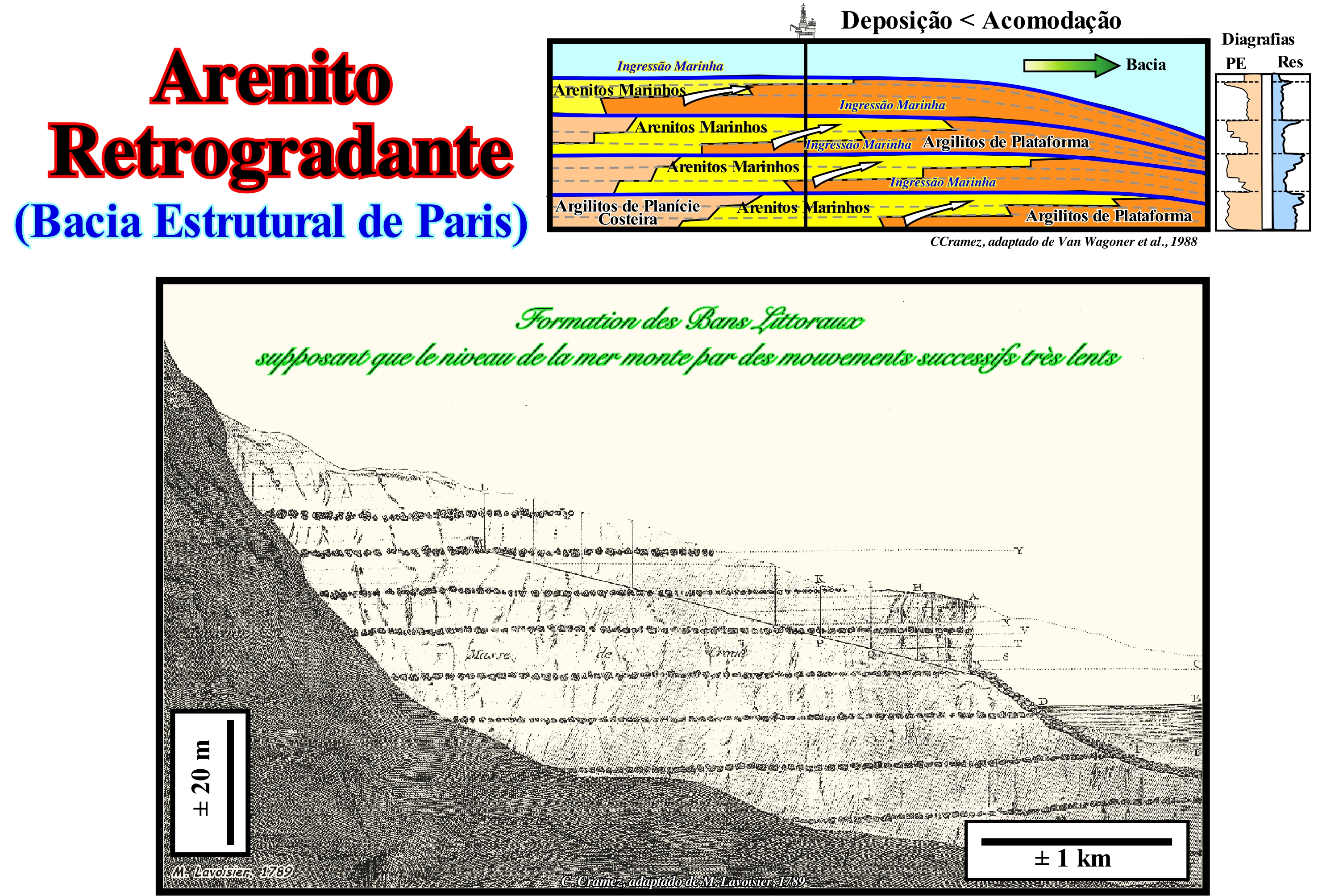 Antoine Laurent de Lavoisier (1789) foi, depois do embaixador francês no Egipto, De Maillet*, um dos primeiros cientistas a considerar, o que hoje se chama eustasia (variações do nível do mar absoluto ou eustático, ou seja, as variações do nível do mar global referenciado ao centro da Terra ou a um satélite), como o factor principal da ciclicidade dos depósitos sedimentares. Lavoisier interpretou os arenitos litorais da bacia geográfica de Paris, como arenitos retrogradantes, depositados em associação com sucessivas subidas do nível do mar relativo que hoje se chamam ingressões ou transgressões marinhas. Como ilustrado nesta figura, a geometria do conjunto destes arenitos sugere, fortemente, um deslocamento, em direcção do continente, da ruptura costeira de inclinação da superfície de deposição (mais ou menos, a linha da costa, nas linhas sísmicas) a cada subida do nível do mar relativo. Na estratigrafia sequencial, subida do nível do mar relativo, subida relativa do nível do mar, ingressão marinha ou paraciclo-eustático são sinónimos. Os sedimentos depositados entre duas subidas consecutivas do nível do mar relativo (sem que haja uma descida do nível do mar relativo entre elas), isto é, durante o período de estabilidade do nível do mar relativo, que ocorre depois de cada paraciclo eustático, são limitados por duas superfícies de ravinamento. Eles formam o que se chama um paraciclo-sequência que, em geral, tem uma configuração interna progradante e é formado por um ou vários cortejos sedimentares (associação lateral de diferentes sistemas de deposição, isto é, uma litologia e uma fauna característica, que são, mais ou menos, equivalentes a uma fácies**, síncronos e geneticamente ligados entre eles. A cada ingressão marinha, isto é, a cada deslocamento da linha da costa para o continente, induzido por uma subida do nível do mar relativo, forma-se, sobre a topografia pré-existente, uma pequena superfície de erosão que os geocientistas chamam superfície de ravinamento. Aquilo que muitos geocientistas chamam, de maneira um pouco abusiva, uma “transgressão” *** corresponde, ao conjunto das ingressões marinhas cada vez mais importantes (subidas do nível do mar relativo em aceleração) e das regressões sedimentares associadas cada vezes mais pequenas, as quais são depositadas durante o período de estabilidade do nível do mar relativo entre as ingressões marinhas. Foi a um tal conjunto de ingressões marinhas cada vez mais importantes e regressões sedimentares cada vez mais pequenas que, globalmente, tem uma geometria retrogradante, que Ceasare Emiliani (1992) chamou transgressões e não transgressão. Como ilustrado no esquema geológico, nunca se pode dizer que um paraciclo-sequência é uma transgressão, uma vez que são necessários vários paraciclos-sequência, para que, colectivamente, se desenvolva uma a geometria, globalmente, retrogradante se a taxa de deposição for inferior à taxa de acomodação. É a sucessão vertical de regressões sedimentares, cada vez menos importantes, por deficiência de acarreio terrígeno, que cria, a morfologia global retrogradante característica dos depósitos transgressivos. A cada subida do nível do mar relativo, a ruptura costeira da superfície de deposição desloca-se para montante, o que aumenta a área da plataforma continental. Durante o período de estabilidade do nível do mar relativo, que segue uma subida do nível do mar relativo, o acarreio terrígeno desloca a ruptura da superfície de deposição para jusante. Todavia, devido a uma deficiência do acarreio terrígeno, a linha da costa não atinge a posição, que ela tinha antes da subida do nível do mar relativo. Esta progradação insuficiente da linha da costa repete-se a cada período de estabilidade do nível do mar relativo. Há muitos anos atrás, na Universidade que os autores frequentaram, era nos ensinado que : “Quando o mar transgride, as areias regridem, e é por isso, que uma transgressão sedimentar é, simplesmente, um conjunto de regressões sedimentares”.