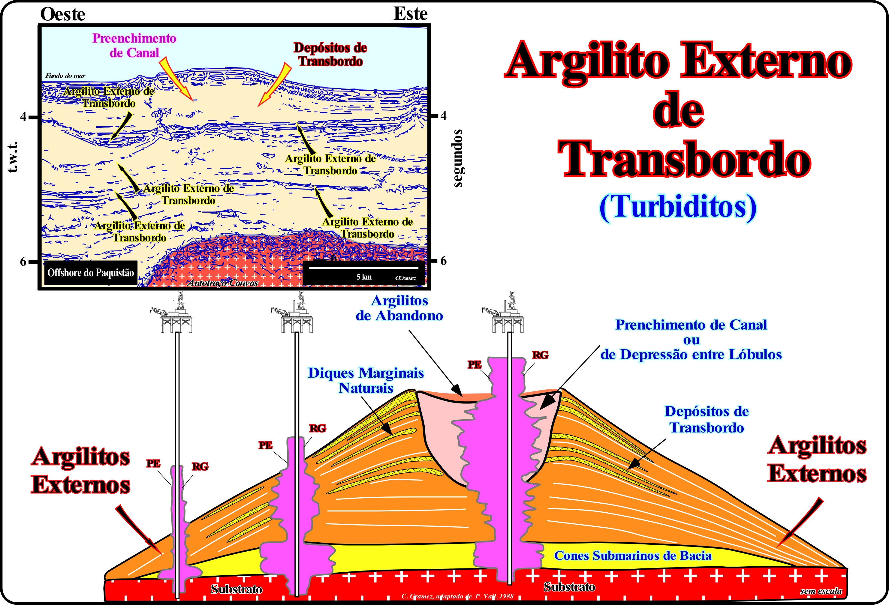 O termo argilito é, aqui, utilizado para designar uma rocha sedimentar composta de argila e lodo, mais ou menos, laminar, sem fissilidade e, sobretudo, não anquimetamórfica (o anquimetamorfismo é a primeira fase do metamorfismo com recristalização da ilite, por exemplo). Quando um argilito é compactado e adquire uma fissilidade significativa, muitos geocientistas chamam-lhe “shale*”. Assim pode falar-se de argilitos externo de transbordo para designar as rochas argilosas distais do apron de um cone submarino de talude (CST) que terminam por biséis de progradação (com vergência oposta) quer sobre os cones submarinos de bacia (CSB) quer contra a discordância inferior do ciclo-sequência ao qual os cones submarinos pertencem. Na realidade, dentro de um ciclo-sequência, que é um ciclo estratigráfico induzido por um ciclo eustático de 3a ordem**, caracterizado por ter uma duração entre 0,5 My e 3-5 My, os cones submarinos de bacia (CSB) podem estar, completamente, desconectados da base do talude continental e não ser cobertos pelos cones submarinos de talude (CST). Eles podem ser fossilizados pelos segmentos distais das progradações do prisma de nível baixo (PNB) ou mesmo, em casos extremos, pelas progradações distais do prisma de nível alto (PNA). Como ilustrado neste esquema, na maioria dos casos, os argilitos externos de transbordo, assim como os diques marginais naturais turbidíticos, não são contemporâneos, mas mais antigos, do que os sedimentos que preenchem a depressão (ou o canal, quando há erosão), por onde passaram as correntes que em transbordando os depositaram. A fácies (litologia e fauna associada) dos diques marginais naturais é, basicamente, argilosa. O teor de areia é, geralmente, baixo e a espessura dos horizontes arenosos, raramente, atinge um metro, mesmo na parte mais grossa, perto da depressão central. Em casos muito particulares, os horizontes de areia podem ser considerados, como rochas-reservatório secundárias. Todavia, eles podem aumentar, ligeiramente, as reservas de um campo petrolífero, mas, raramente, por si só, formam acumulações, economicamente, viáveis. Quando os níveis de areia dos diques marginais naturais turbidíticos são saturados de petróleo, eles correspondem, na maioria dos casos, a recursos (quantidade de um mineral ou de uma rocha existente, ou por descobrir, que pode, eventualmente, ser um dia extraída, mas que actualmente, por razões económicas ou técnicas, não pode ser extraída) e não a reservas (parte dos recursos de um determinado mineral ou rocha, como petróleo, que pode ser, actualmente, extraída da terra com lucro). As partículas mais finas dos depósitos de transbordo depositam-se mais longe da depressão entre os diques marginais naturais turbidíticos. Esta depressão, que aumenta, gradualmente, à medida que as correntes turbidíticas transbordam pode, mais tarde (quando o nível do mar relativo começa a subir) ser preenchida, em retrogradação, quer por areia (morfologia biconvexa depois da compactação) quer por argila (morfologia convexa / côncava), função da composição das correntes. Quando o preenchimento é de areia, ele forma rochas-reservatório, como é o caso no offshore profundo de Angola e do Golfo do México. Argilitos externos de transbordo, como ilustrado nesta figura, são bem visíveis nos autotraços das linhas sísmicas no offshore do Paquistão (margem divergente tipo Atlântico sobrejacente a bacias de tipo rifte que alongaram o pequeno supercontinente Gondwana antes que este se fracturasse) em associação com os cones submarinos de talude, cuja dimensões são, extremamente, importantes, como ilustrado nesta figura (ver também a figura seguinte). A linha sísmica do autotraço Canvas aqui ilustrado é muito distal (offshore profundo com uma profundidade de água de cerca de 4 segundos t.w.t.). É por isso que não só as bacias de tipo rifte não são visíveis, e que os cones submarinos de talude repousam directamente sob a crusta vulcânica (que elas seja subaérea ou oceânica).