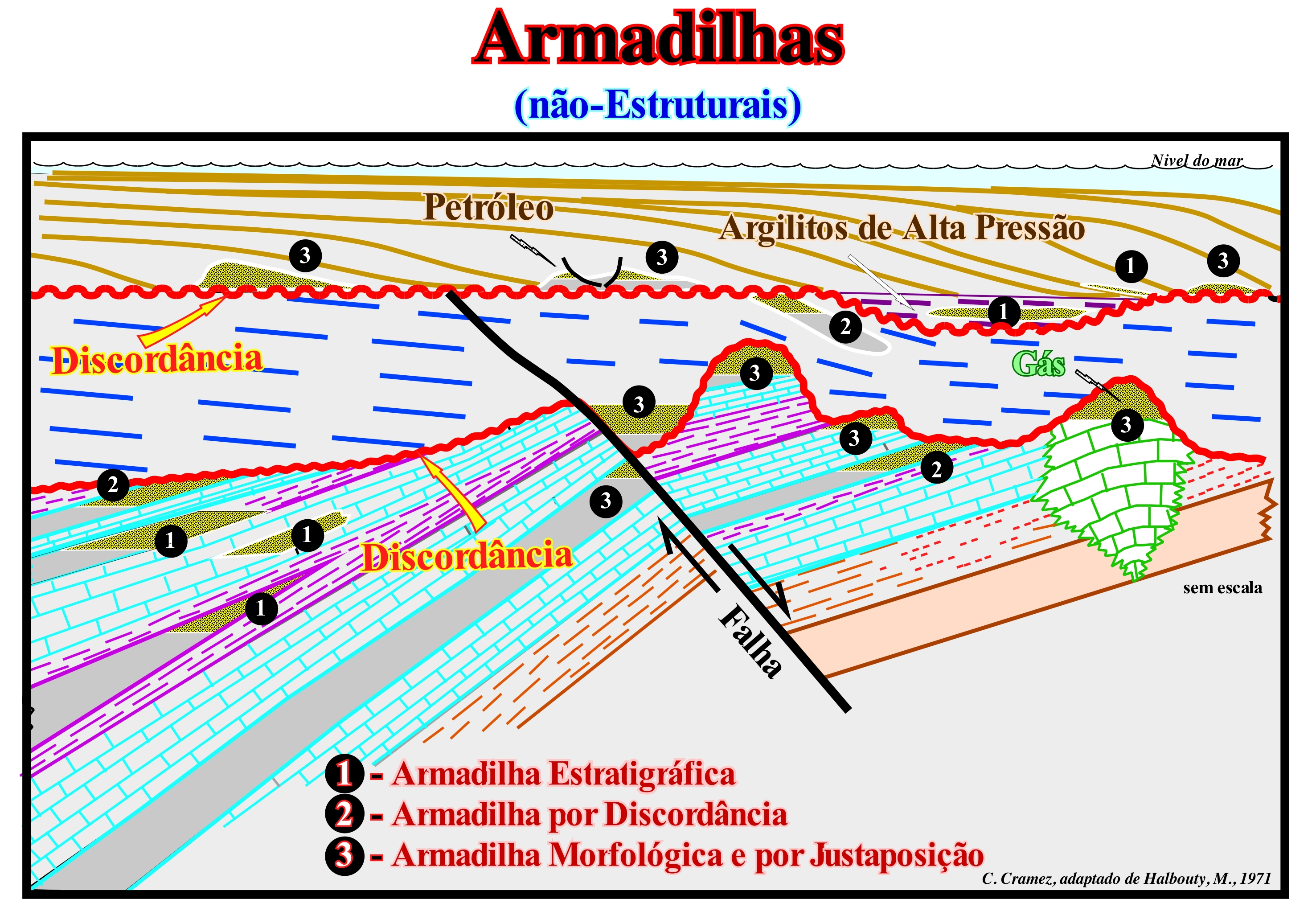 Além das armadilhas estruturais, as quais são caracterizadas por uma rocha-reservatório com um fecho próprio (em todas as direcções, como uma estrutura anticlinal) e paralelo ao fecho da rocha-de-cobertura (vertical)*, é importante distinguir as armadilhas não-estruturais. Neste tipo de armadilha, como a carta estrutural do topo da rocha-reservatório não semelhante a carta estrutural do topo da rocha-de-cobertura, a definição da armadilha implica necessariamente a cartografia estrutural da rochas-de-cobertura, o que muitas vezes é esquecido pelos geocientistas encarregados da pesquiza petrolífera. É por isso que a classificação rigorosa do tipo de armadilha é imperativa. As armadilhas não-Estruturais podem ser: (i) Estratigráficas ; (ii) Por Discordância ; (iii) Morfológicas e (iv) Morfológicas por Justaposição. As armadilhas estratigráficas estão associadas às variações litológicas durante a deposição, enquanto que armadilhas por discordância estão associadas à superfície de erosão (discordância) induzida por uma descida significativa do nível do mar relativo, que pôs o nível do mar mais baixo do que o rebordo da bacia. As armadilhas morfológicas são criadas pelas anomalias sedimentares, como, por exemplo, os recifes e cones submarinos de bacia e de talude. Nas armadilhas não-estruturais e, particularmente, nas armadilhas morfológicas por justaposição, o fecho da rocha-reservatório não é paralelo ao fecho da rocha-de-cobertura, o que quer dizer, que a geometria do topo da rocha-reservatório não for criada por um encurtamento das rochas (regime tectónico compressivo). As armadilhas morfológicas por justaposição são criadas por movimentos tectónicos, em geral, extensivos, que põem em justaposição a rocha-reservatório e a rocha-de-cobertura (lateral). Contrariamente a uma ideia muito aceite, não há armadilhas contra falha (que certos geocientistas consideram mesmo como armadilhas estruturais). Embora elas tenham uma componente estrutural, criada pelo movimento diferencial dos blocos falhados, uma falha (normal ou inversa) nunca fecha uma rocha-reservatório. O que fecha uma rocha-reservatório é a rocha-de-cobertura (lateral) que está justaposta à rocha-reservatório, do outro lado da falha ou, mais raramente, a argila de falha quando presente entre os blocos falhados.