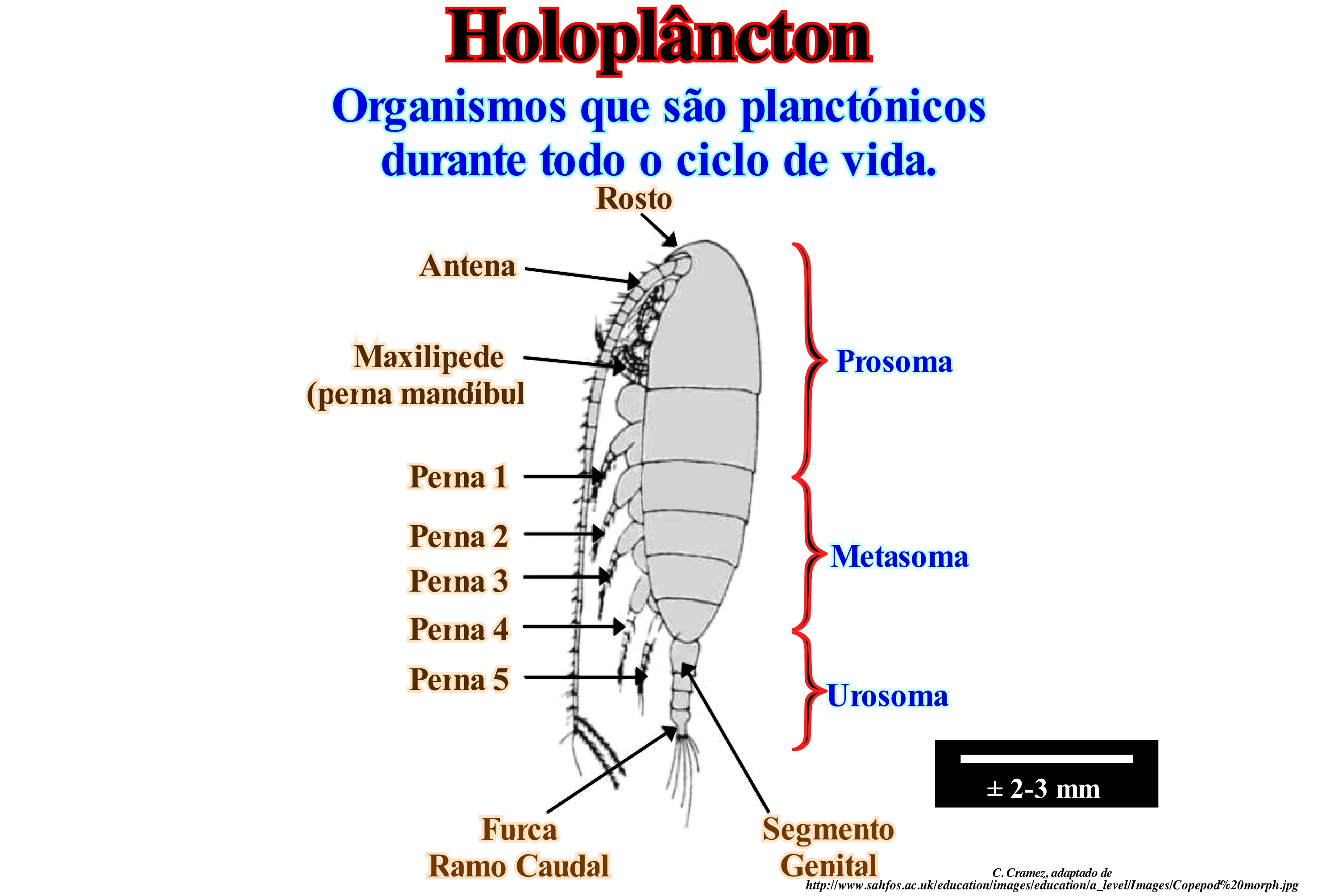 O holoplâncton é uma parte do plâncton animal ou zooplâncton. Chama-se holoplâncton ou plâncton verdadeiro aos corpos que permanecem no estado de plâncton ao longo do seu ciclo de vida. Ele é contrasta com o meroplâncton ou plâncton temporário, que é composto de organismos que passam apenas parte de suas vidas, habitualmente o estado larval, sob a forma de plâncton (medusas, crustáceos, larvas, vermes, etc.). O holoplâncton consiste, principalmente, de microalgas, animais unicelulares e alguns crustáceos como os copépodes, que representam cerca de 70% do zooplâncton. Os copépodos, como ilustrado nesta figura, são organismos planctónicos vivos livres (semelhante a uma pequena cochinilha, variedade de pulgões) que variam entre 1 e 10 milímetros de comprimento. Eles são capazes de circular livremente, sob pequenas distâncias, sacudindo os membros articulados e as antenas. Isto é interpretado como sendo um mecanismo para evitar predadores. As suas antenas ajudam, também, a evitar que eles se afundem através da coluna de água. Existem milhares de espécies de copépodos que formam o holoplâncton. Algumas vivem em água doce, mas a maioria são organismos marinhos, que têm uma morfologia básica. Os copépodos são, provavelmente, os organismos multicelulares mais abundantes na Terra. Certos autores pensam que existem cerca de 11500 espécies de copépodos divididos em aproximadamente 200 famílias e 1650 géneros. Os copépodos são um grupo diverso e, embora alguns sejam carnívoros ou onívoros, a maioria são herbívoros alimentando-se de fitoplâncton. Eles alimentam-se por meio de um sistema de filtragem ou utilizando os apêndices para manipular a célula. A emergência de populações de copépodos durante todo o ano afecta os ciclos de fitoplâncton no oceano. No holoplâncton entram-se, igualmente, cnidários (animais aquáticos conhecidos como celenterados, como as hidras de água doce, medusas, alforrecas, corais, anémonas-do-mar e as caravelas), quetognatas (pequenos animais marinhos com cerca de 15 cm de comprimento, de corpo alongado e não segmentado, com barbatanas laterais e caudais que são extensões da ectoderme), ostracodos (pequenos crustáceos dotados de uma carapaça calcária, composta por duas valvas que se articulam-se através de uma estrutura denominada charneira, localizada na região dorsal do animal), etc.