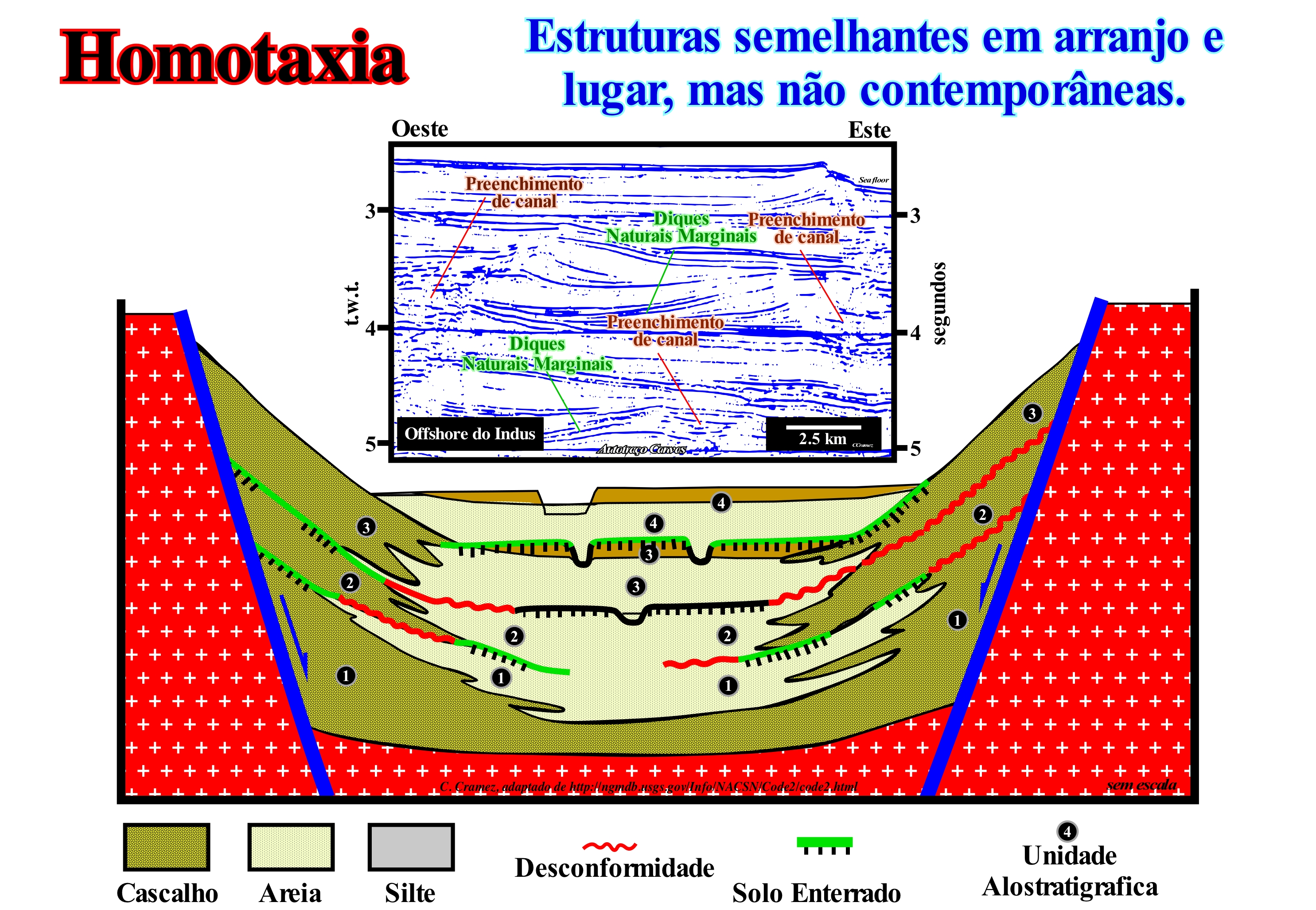 Homotaxia foi, inicialmente, proposto por Huxley (1982) para evitar a falácia de confundir uma semelhança taxonómica (com os mesmo grupos de organismos biológicos) com sincronismo. Assim, actualmente a homotaxia é muitas vezes definida como a similaridade taxonómica entre sequências estratigráficas ou fósseis em regiões separadas (Bates & Jackson, 1987), ou o facto que de estratos caracterizados por fósseis ocupem semelhantes posições em diferentes sequências verticais sem no entanto terem, necessariamente, a mesma idade. O termo homotaxia pode, também, ser utilizado par exprimir o facto que estratos ou camadas não contemporâneas (muitas vezes porque são muito afastadas uma das outras) possam conter os mesmos fósseis. Demonstrar que uma sucessão de fauna, flora ou taxa (plural de táxon) se pode confirmar de um corte geológico para outro, de uma bacia sedimentar para outra ou de um continente a outro, não é fácil e constitui o que, normalmente, muitos geocientistas chamam homotaxia. Observar os mesmo fósseis em dois afloramentos de bacias sedimentares diferentes não mostra, de maneira nenhuma, que esses afloramentos são síncronos. Na realidade, isto é, o grande problema dos fósseis guias (com uma grande distribuição espacial e que ocorrem durante um breve espaço de tempo) e a questão principal é de saber como é que se passa de eventos geológicos ordenados para a eventos geológicos datados. Este problema constitui o grande impasse da biostratigrafia. Os dados paleobiológicos e estratigráficos característicos de um determinado evento geológico não permitem estabelecer o seu sincronismo. Sobre este assunto não se pode esquecer que: (i) Os fósseis significam uma sucessão de eventos irreversíveis e (ii) As correlações biostratigráficas dependem da emergência evolucionária de uma espécie, a partir do seu antepassado, da sua sobrevivência e expansão geográfica. O principio das correlações assume que as comunidades biológicas, em diferentes lugares, são sincronizadas ou que os sinais biológicos são transmitidos, instantaneamente, ou ambos, o que não é, necessariamente, verdade. Scott, G. H. (1985) considerou que o principal problema na biostratigrafia é a justificação do uso de fósseis para identificar horizontes isócronos e propôs uma primeira solução, uma vez que os geocientistas estabelecem sucessões de eventos fósseis, mas não há nenhuma justificação teórica para considerar que a mesma posição estratigráfica (homotaxia) corresponde a um mesmo tempo de deposição. Ele propôs uma primeira solução usando a homotaxia como teste de diacronismo, quer isto dizer, que os eventos que não mantém uma ordem estratigráfica invariante são considerados como diacrónicos. Os eventos que resistem a este teste não são considerados isócronos, mas o diacronismo potencial das suas distribuições individuais é, inversamente, relacionado com o seu espaçamento estratigráfico. Quanto mais perto estão os eventos homotaxiais no espaço estratigráfico, menos eles estão separados no tempo. Assim, um dos principais objectivos da investigação biostratigráfica deve ser o de fazer testes de homotaxia mais rigorosos aumentando a densidade de eventos. O esquema ilustrado nesta figura, que é um bom exemplo de uma interpretação alostratigráfica (unidades estratigráficas cartografáveis definidas e identificadas na base das descontinuidades que as limitam) dos depósitos aluviais e lacustres de uma bacia de tipo rifte, quer a bacia seja do Cretácico ou Neogénico, mostra que o conceito de homotaxia se pode aplicar, igualmente, às correlações litológicas, para designar o facto que estratos caracterizados por relações geométricas e posições semelhantes em diferentes sequências verticais independentemente da sua idade. De facto, neste corte geológico, os depósitos aluviais e lacustres podem ser incluídos numa única formação geológica, ou podem ser separados lateralmente em formações geológicas distintas na base dos contrastes de litologia (cascalho, argila). As mudanças de litologia são abruptas e acentuadas, tanto vertical como lateralmente. A homotaxia não implica, necessariamente, um sincronismo dos depósitos. Os depósitos aluviais e lacustres, por exemplo, podem ser incluídos numa única formação geológica ou ser separados, lateralmente, em formações distintas, na base das relações geométricas ou na base dos seus fósseis. Contudo, quatro unidades alostratigráficas, cada uma incluindo duas ou três fácies, podem ser definidas com base nas descontinuidades lateralmente cartografáveis. Como se pode constatar no autotraço de um detalhe de uma linha sísmica regional do Indus, é evidente a similaridade e o diacronismo dos cones submarinos de talude (estruturas em asas de gaivota de P. Vail) constituem, globalmente, um bom exemplo de homotaxia.