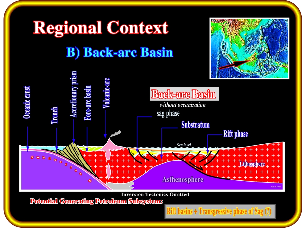 Plate 10- Although quite different individually, back-arc basins show many similarities which allow an a priori assessment of their hydrocarbon potential. The Bally’s classification suggests to consider separately back-arc basin without and with oceanisation. Back-arc basins with oceanisation develop new oceanic crust and non-Atlantic divergent margins. A rifting phase, with differential subsidence starts the formation of a back-arc basin. Then such a subsidence is replaced by a regional thermal subsidence which onset the sag phase.