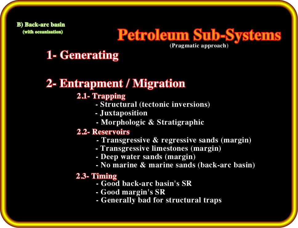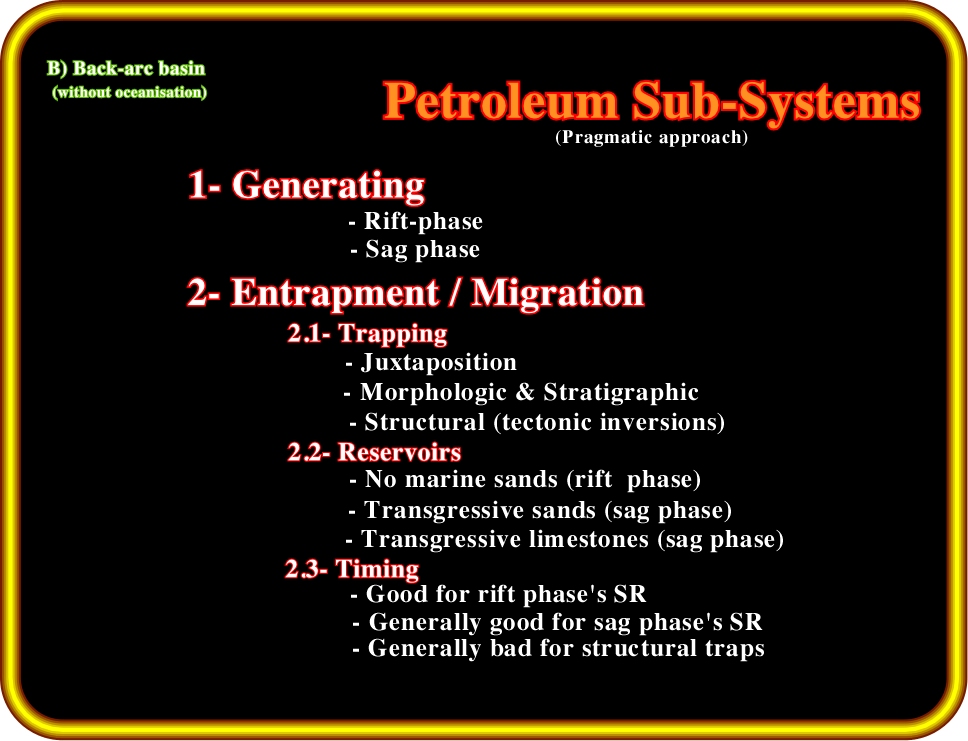 Plate 11- Back-arc basins without oceanisation are characterized by: (i) A generation petroleum sub-system mainly localized in the half-grabens of the rifting phase. However, as will see later, in particular cases, humic source rocks are also be present in the sag phase, (ii) Traps are morphological, as the backstepping carbonates deposited during the sag phase, or morphological by juxtaposition, (iii) Non-marine sandstones of the rift phase constitutes the potential reservoirs as well as regressive sands or carbonates deposited predominantly during the sag phase, (iv) Migration timing is favorable except when the basin is tectonically inverted.