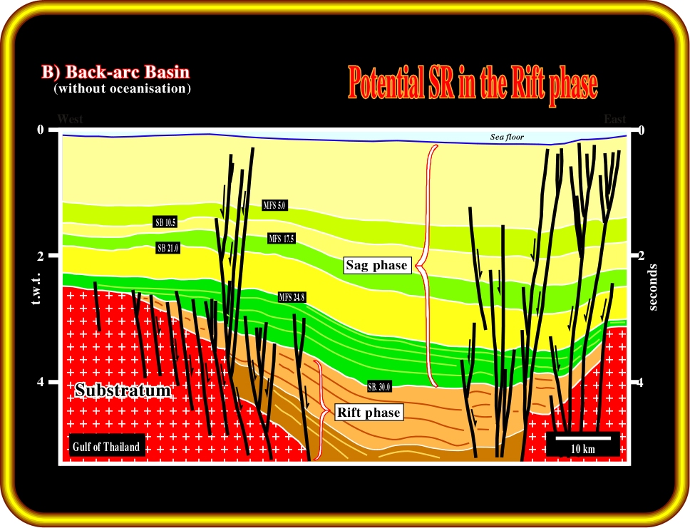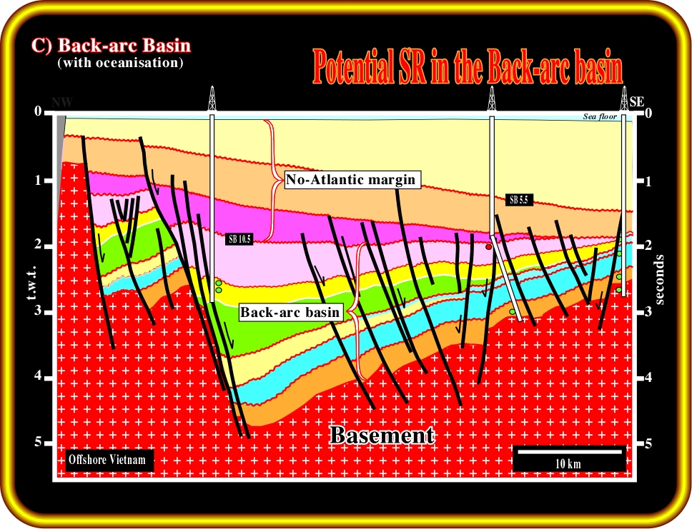 Plate 16- We have two examples to show. Our first example comes from offshore Vietnam. It illustrates the case a back-arc basin with oceanisation and deposition of a thin non-Atlantic margin. So thin that it does not change the hydrocarbon parameters of a conventional back-arc basin. In addition, the tectonic inversions are not too important. As depicted, this tentative geologic interpretation suggests: (i) Above a Paleozoic substratum, the back-arc basin, (ii) The back-arc basin, which is prior to the breakup of the lithosphere, is composed by a rift and a sag phases where the hydrocarbon parameters are located, (iii) The proximal section of the non-Atlantic divergent margin, which was deposited after the breakup, (iv) The generating petroleum subsystem, which is composed by lacustrine organic shales, is located within the rift phase. It is probably overmature in part but source rocks of the sag phase can also contribute to the sourcing, (v) The potential reservoirs (deltaic sandstones) are located within the sag phase of the back-arc basin, (vi) The traps are mainly morphologic by juxtaposition and they are in the back-arc basin. In other words, the sediments of the margin contribute only to the burial and the maturation of the organic matter of the source rocks of the back-arc basin.