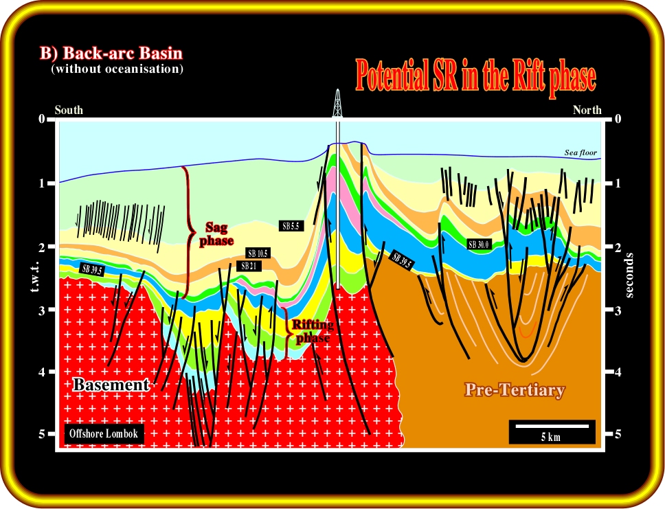Plate 13- This example is taken in the overthrusting continental plate of the Benioff subduction zone of Java northward of Lombok Island. The back-arc basins are here tectonically inverted, particularly the rifting phase (rift-type basin). Large structures and four way dip traps, what we call structural traps, appear. They could be charged if the timing of hydrocarbon migration is posterior to the age of the inversion. Which is often unlikely. However, explorationists should not forget dismigration. Let’s see now what happens in a back-arc basins when the extension is big enough to breakup the lithosphere and create a marginal sea, i.e. oceanisation.