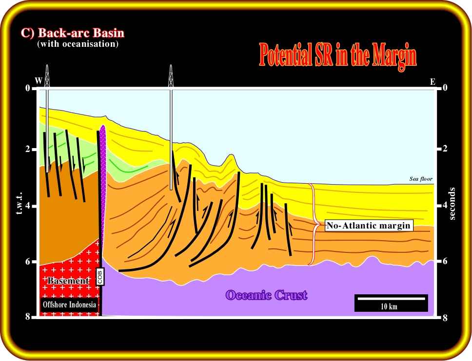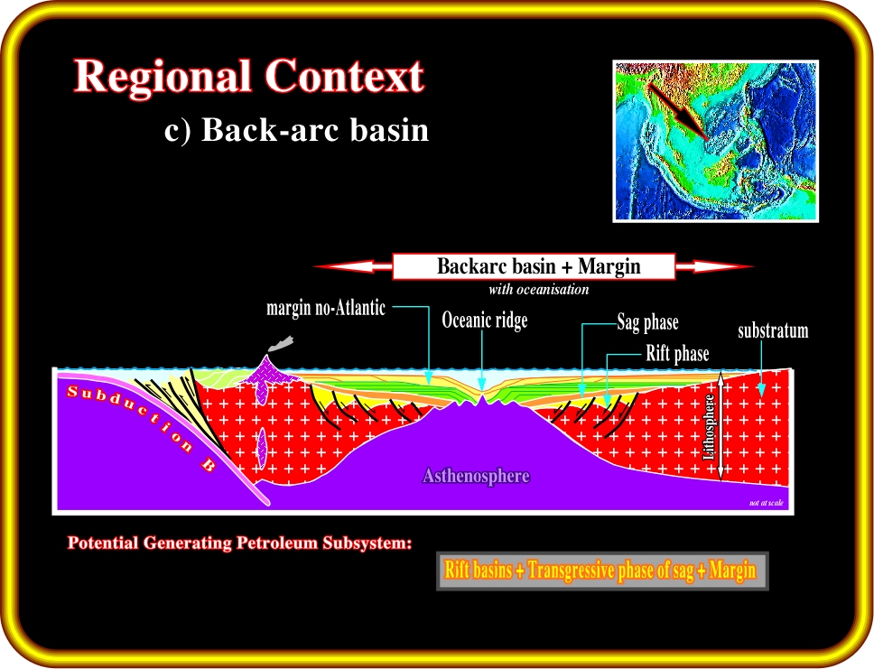 Plate 14- As shown above, in a tectonic context globally compressive, new oceanic crust is formed and a non-Atlantic divergent margin is deposited above the sag phase of the back-arc basin. Depending on the thickness of the divergent margin, the potential generating petroleum subsystem may be quite different from that of a back-arc basin without oceanisation.