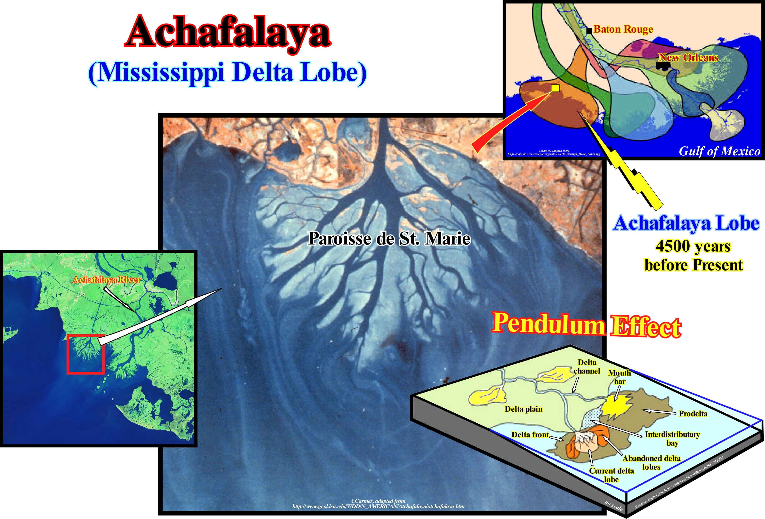 The Ganges-Brahmaputra Delta Building* called, also, Ganges, Sunderban or Bengal Delta Building, is located in Asia, where the Ganges and Brahmaputra rivers discharge into the Bay of Bengal. With an area of about 100,000 km2, it is the largest delta in the world. Approximately two-thirds of the delta belong to Bangladesh. The rest constitutes the state of West Bengal of India. The Ganges delta building is the floodplain of three great rivers: (i) Ganges ; (ii) Brahmaputra and (iii) Meghna. Together, these three rivers drain a basin of about 1.72 million km2 on the southern side of the Himalayas. This figure shows a small part of the abandoned delta, that is to say, the upper part of the deltaic plain which, due the delta progradation, is no more disturbed by the influence of fluvial and tidal deltas**. During the Pleistocene, before the junction of the rivers, the deltaic activity of the Ganges and Brahmaputra rivers shifted several times. Currently, the active sedimentation area is located in the eastern sector. The northern part represents the abandoned delta plain, where traces of abandoned channels dominate the morphology of the region. The shape and abundance of these channels vestiges, which were, probably, the bed of the Ganges River and many of its distributaries***, suggests the existence of an old meander belt, that is to say, an area developed over a valley filled with a floodplain sediments, on which meanders serpentine due a low slope thalweg of the water-courses. During flooding periods, the rivers of the meander belt, which has, recently, been much modified by human activity, overflow the original margins flooding the adjacent areas. The size of the traces of fossil channels is similar to that of the channels currently active along the Ganges and their distributaries. Many of these ancient river channels are now dominated by tidal water. Hooghly and Pusar rivers are perfect examples of ancient beds of the Ganges River, which today are dominated by the tides. Oxbow lakes and meander relics are common in the abandoned delta area. The inner part of the tidal plain was protected by dikes and the old salted lands were converted into agricultural land. This region, which was. originally, an immense mangrove forest ("Sunderbans"), still retains a little of the original delta morphology, although it is, already, well concealed by the tidal drainage network (set of channels that are connected to each other and drain the water from tidal currents, which may be artificial, man-made, or natural). The large tidal channels, well visible south of the abandoned delta area, form bell-shaped estuaries that are deep enough to be used as transport roots. Inland, the estuary channels are very sinuous. They are relatively stable, since lateral migrations are rare. The comparison of old aerial photographs with modern satellite imagery suggests stable channel paths for at least the last 20 years. In the deep offshore, probably in association with the floods of the Ganges/Brahmaputra, submarine slope fans were deposited. Some "gull wing" structures (opposite turbiditic natural levees and the filling of the depression between them) exceed more than 500 m of thickness. The overloading of sediments deposited in direct or indirect association with the Ganges-Brahmaputra river produces a significant subsidence of the seafloor, which, naturally, induces a significant relative sea level rise. Such a marine ingression, has nothing to do with what is, regularly, advertised by the media and particularly by some naive ecologists (verificationists). This relative sea level rise, that is to say, the rise of the sea level referenced to an Earth's surface, whether the seafloor or the top of the continental crust (bottom of the sediments) is not a consequence of anthropogenic global warming and, particularly, due to an increasing of CO2 in the atmosphere. It is just the consequence of the subsidence of the seafloor due to the weight of the sediments. Values of 10/20 m of relative sea level rise per year are frequent not only along the coast but also along the Meghna River. There are other delta types such as: (i) Fan delta ; (ii) Arctic delta ; (iii) Arcuate delta; (iv) Atrophied delta; (v) Complex or Polymorphic delta; (vi) Cuspate or Blunt delta ; (vii) Fingers or Digitated delta; (viii) Flow delta; (ix) Closed delta; (x) Gilbert-type delta; (xi) Lava delta; (xi) Lobated delta; (xiii) Tidal delta; (xiv) Submarine delta; (x) Storm delta; (xvi) Wave delta ; (xvii) Ebbing delta, etc.