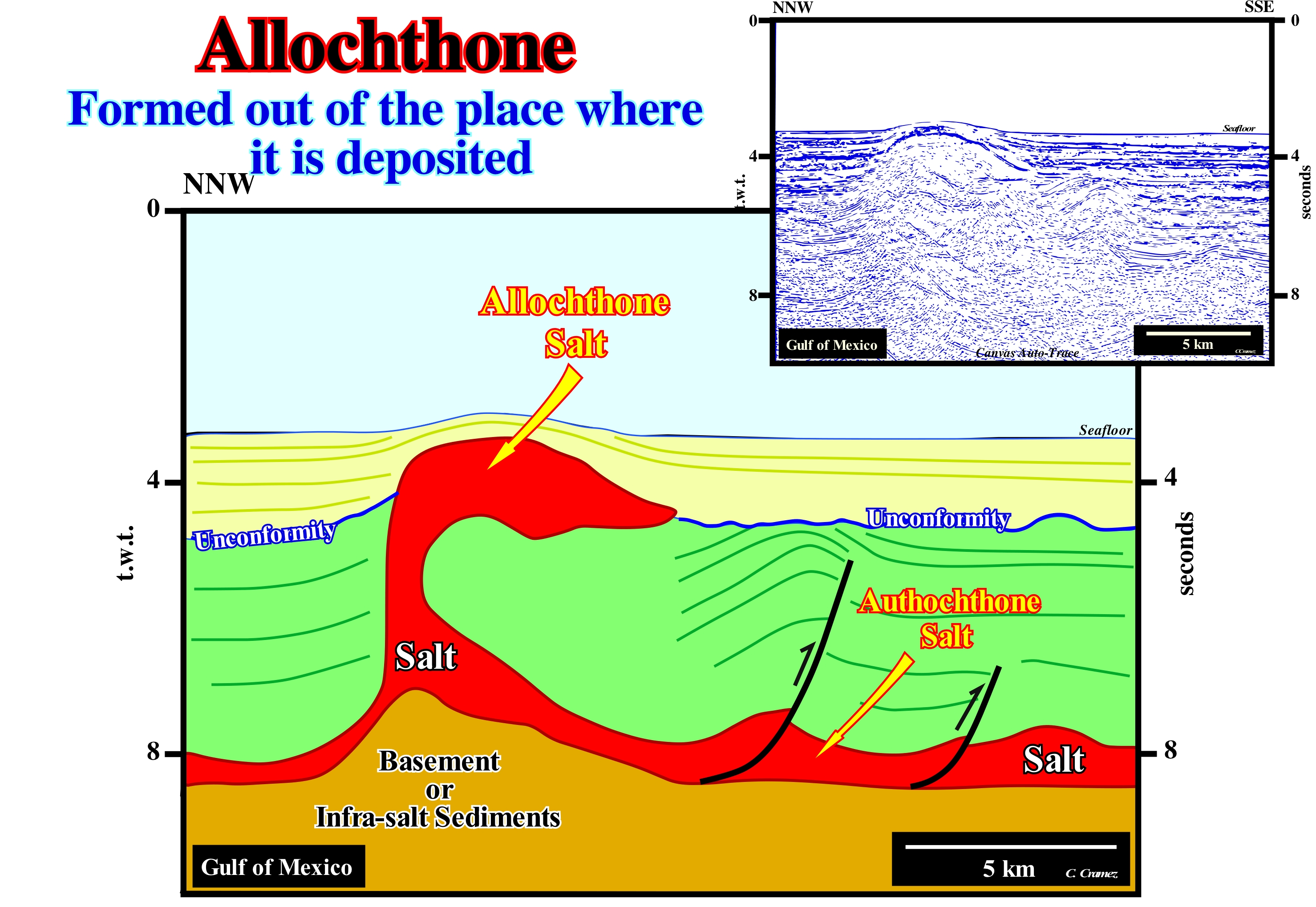 Many geoscientists consider the term allogene is synonymous of allochthone or allochthigeneous. All of them designate materials that did not originate in the place where they are. However, in sequential stratigraphy, by tradition or habit, the term allochthone is, more often, used to describe rocks. Thus, geoscientist say, for instance, allochthonous salt as opposed to autochthonous salt. The allochthonous salt is not in its original stratigraphic position, whereas the autochthonous salt is. The term allochthigeneous is, preferably, used for minerals and sedimentary particles. So, turbidite layers are, mainly composed, of allochthigeneous sedimentary particles. Therefore, the fossils contained therein being transported do not allow a good dating, much less a determination of the sedimentary environment where they have deposited. It is interesting to note on this subject that the reservoir-rocks of the famous Frigg gas field (North Sea) were, during the early years, considered as delta sands, until some geoscientists realize that all fossils, in which such a interpretation was based, were transported. The Frigg finger delta building was overnight transformed into a stacking of submarine basin floor fan, i.e., into a deep-water turbidite system. The term allogene is most, commonly, used to designate surface water currents that have a distant origin from the environment in which they are found. It is, often, used in karst regions to designate currents that pass through or have a swallow hollow (disappearance in a karst subsoil of a surface watercourse) in the karst zone, but whose source is located in another river basin. As illustrated in this figure (Guangxi, Zhuangzu, China) the river that crosses the karsified zone has its origin in another sedimentary basin located hundreds of kilometers northward. Therefore, it can be considered as an allogene river. Likewise, most of the underground rivers circulating in the karst conducts are allogenic currents, although many of them have a resurgence (karst spring, fed at least partially by losses of allogenic surface currents) in the karsified zone.