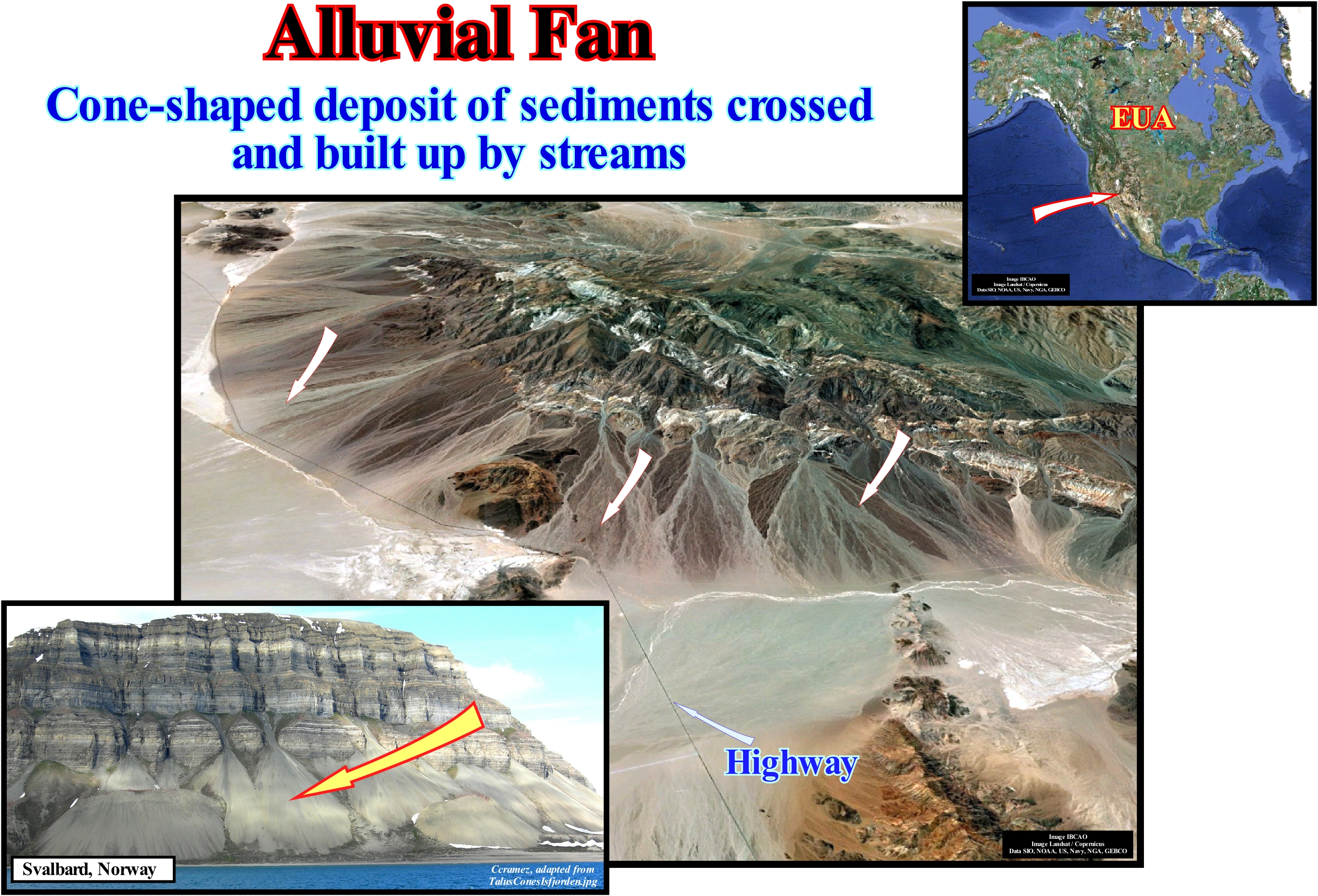 An alluvial fan is deposited when: (i) A stream flows out of a narrow valley upstream of a much wider valley ; (ii) A current is tributary and flows into the main stream ; (iii) The constraint of the valley disappears abruptly or (iv) The gradient of the current decreases rapidly. An alluvial fan is steeper near the mouth of the valley. Its highest point points upstream and plunges, convexly, downstream, as the gradient decreases (AGI, 1999). The Death Valley photograph (near the highway) not far from Badwater (USA) illustrates, perfectly, alluvial fan or fan deltas, which, as can be seen, consist of sedimentary material transported by water and deposited in cone-shaped bodies at the base of the slopes. In this particular case, alluvial fans that formed at the mouth of valleys or continental canyons may, in certain respects, be considered as delta equivalents. However, this is not always the case. Alluvial fans may form, also, at the base of coastal cliffs, caused by sea or glacial erosion, in association with, more or less vertical, ditches* formed along the cliffs, as appears to be the case in the islands of the Svalbard archipelago (between Norway and the North Pole). Generally, alluvial fans form on the basis of topographic components where there is a significant rupture of the slope of the terrain. This, of course, implies that coarser sediments are deposited at the apex of the fan (upstream) and that the edges are made of finer material. Alluvial fans, such as the Death Valley (Mojaves desert, California), are typical of arid or semiarid climates, but it can not be said that they are restricted to these types of climate. Alluvial fans also form in humid climates, such as the great alluvial cones of the Koshi River (Nepal). Over time, an alluvial fan is, progressively, destroyed by erosion, upstream and downstream, and it will, eventually, level the terrain. Alluvial fans are subject to flooding (https://en.wikipedia.org/wiki/Alluvial_fan) and can be even more dangerous than the upstream canyons that feed them, since the convex surfaces force water to spread widely until there is no zone of refuge. If the gradient is steep, active transport of materials down the fan creates a moving substrate that is inhospitable to travel on foot or wheels. But as the gradient diminishes downslope, water comes down from above faster than it can flow away downstream, and may form ponds to hazardous depths. In 2008 high monsoon flows breached the embankment, diverting most of the Koshi river into an unprotected ancient channel and across surrounding lands. Over a million people were rendered homeless, about a thousand lost their lives and thousands of hectares of crops were destroyed. In sequence stratigraphy, alluvial fan are deposited upstream of the bayline (limit between the fluvial and continental deposits), or upstream of the coastal wedge* of Posamentier and Vail, (1988) where the changes in relative sea level have no effect on the creation of available space for sediments (accommodation).
