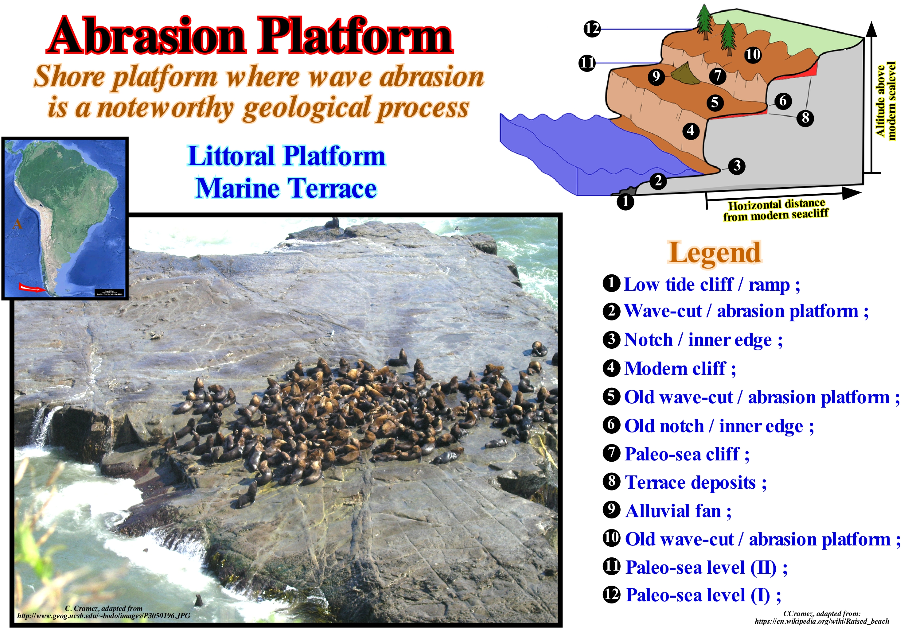 Abrasion platforms are coastal platforms where the abrasion of wave action is the predominant geological process. When an abrasion platform is under development, it is exposed, only, during low-tide, as illustrated on this figure, but there is, always, the possibility that such a platform is hidden under a cover of beach pebbles (which are important agent of abrasion). If the continental shelf is, permanently, exposed, above the high-tide line, it corresponds, probably, to a raised beach platform, which is not considered as a product of abrasion. It is the result of a mechanical scraping of a rocky surface by friction between the rocks and the moving particles during their transport by wind, glaciers, sea-waves, gravity, running water or erosion. After friction, the moving particles dislodge the less consolidated and weaker parts of the rocks, which can, also, be dissolved in the water. The intensity of the abrasion depends on the hardness, concentration, speed and mass of the moving particles. Erosion is the destruction of soil and rocks and their transportation made, usually, by rainwater, wind or by the ice action. Ice acts by expanding the material in which the infiltrated water freeze. Erosion destroys the structures that make up the soil, releasing sand, clay, oxides, humus, etc. The sedimentary particles and rock debris are transported to the lower parts of the ground aggrading* the streams. Abrasion can be considered as one of the mechanical processes of erosion. In forest-covered soils, erosion is quit insignificant and almost non-existent. Erosion is a natural process that is, always, present and important in the formation of landforms. Since man destroys forests, to use the land in agriculture, erosion becomes very severe in the exposed soil and can lead to desertification (transformation of an area into a desert). When the sea coast is rocky, high and steep, i.e.-, when cliffs or escarpments emphasize the coastline, erosion induces the retreat of the coast. Such a retreat happens, more or less, as follows: (a) Waves scrape the base of escarpment, which becomes unstable due to the loss of its basal support ; (b) Such an instability causes fragmentation of the cliff and falling blocks ; (c) When the cliff has cracks, the air, located in the cracks, is compressed when the waves shock and decompressed when the waves recede ; (d) The fissures of the rocks are enlarged and the rocks, progressively, fractured ; (e) This damage causes a concave excavation at the foot of the cliffs, that geoscientists call undercut, groove or notch, which, without support, crumble (break or fall apart into fragments) ; (f) In this way, the cliff recedes, developing an abrasion platform (strip of bedrock between the near-offshore and the cliff), which is discovered at low-tide. In the geological schema illustrated on this figure we can distinguish: (i) Low-tide cliff / ramp ; (ii) Wave-cut /abrasion platform; (iii) Notch / inner edge ; (iv) Modern cliff ; (v) Old wave-cut / abrasion platform ; (vi) Old notch / inner edge ; (vii) Paleo-sea cliff ; (viii) Terrace deposits ; (ix) Alluvial fan ; (x) Old wave-cut / abrasion platform ; (xi) Paleo-sea level II ; (xii) Paleo-sea level I. In addition, three abrasion platforms (2), (5) and (10), induced by absolute or (eustatic) sea level, can be recognized. Eustasy is the result of the joint action of (A) Tectono-Eustasy, which is controlled by changes in the volume of oceanic basins induced by the break-up and assemblage of the supercontinents ; (B) Glacio-Eustasy, which is controlled by changes in ocean water volume due to the amount of ice (glaciations and deglaciations**) ; (iii) Geoidal-Eustasy, which is controlled by the distribution of ocean water caused by variations in the terrestrial gravity field, and (iv) Thermal expansion of the oceans or steric rise of sea level (when the ocean temperature increases, the density of the water decreases and, for a constant mass, the volume of the oceans increases). Taking into account that just glacial changes are both important (> 10 m) and quite fast (<1 My), recent abrasion platforms were, certainly, created by glacio-eustasy.