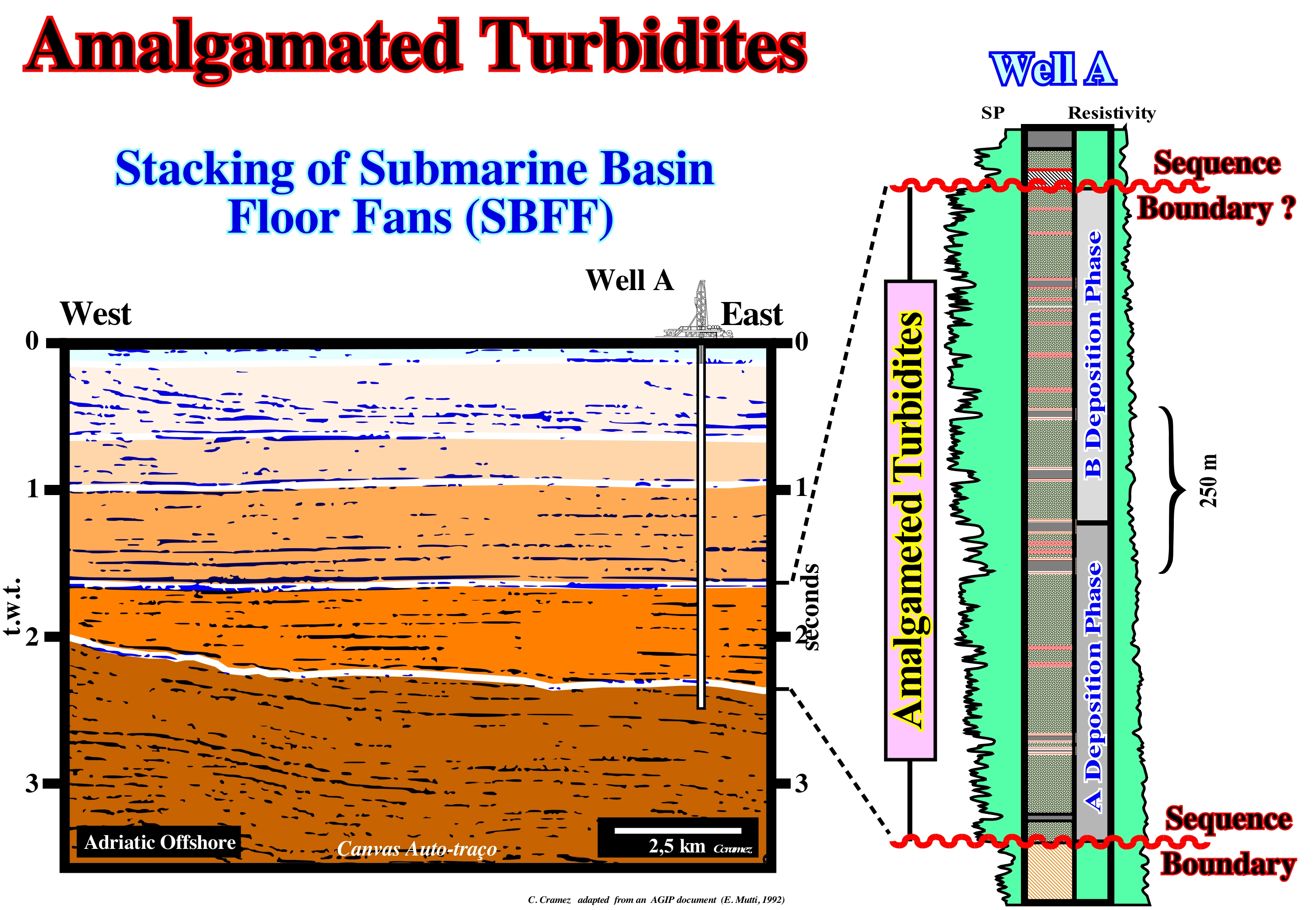 On this tentative geological interpretation of an Canvas auto-trace of a detail of an Adriatic Sea seismic line, the interval immediately overlying the unconformity, located between 2 and 2.3 seconds (double time), which was slightly tectonically enhanced, corresponds to a vertical stacking of E. Mutti type-1 turbidites. This interpretation was corroborated by the results of exploration wells drilled in this region and, particularly, by the results of well A (shown in this figure). They corroborate, also, that the direction of the seismic line ism roughly perpendicular and not parallel, to the flow direction of the turbidite currents. This means that the slope break of the unconformity, perceptible in the western part of this auto-trace, does not correspond to the break of the base of the continental slope and that the turbiditic lobes are, probably, disconnected from the base of the continental slope. In P. Vail's terminology, this interval corresponds to a stacking of submarine basin floor fans (SBFF) associated with a significant relative sea level fall. The relative sea level is a local sea level, referenced to any point on the Earth's surface, which is the result of the combined action of the absolute (eustatic) sea level, supposed to be global and referenced to the Earth's centre, and tectonics (subsidence or uplift of the sea-floor). For the most part, the geological events that are at the origin of these deposits are not the same for Vail and for Mutti. Vail thinks that turbidite deposits are induced by significant relative sea level falls, which puts the sea level lower than the basin edge (continental edge when, at the level of a sequence-cycle, the basin has a shelf), which means that for him, turbidites are directly associated with unconformities (erosional surfaces that bound the sequence-cycles). At the level of a sequence-cycle (a stratigraphic cycle limited between two unconformities, whose age difference is greater than 0.5 My and lesser than 3-5 My) to have deposition the relative sea relative level has to rise in order to create or increase the available space for sediment (accommodation). For deep-water turbidite depositional systems, this is not true. Downstream of the continental edge (whether the basin has or not a shelf) there is always room for deposition. Mutti does not deny the possibility of turbidite deposits in association with significant relative sea level falls (as suggested by P. Vail). However, he thinks that in the case of unchannelized turbidites and, especially, in amalgamated turbidites, the most likely is that they have been deposited during highstand geological conditions (sea level higher than the basin edge) in association with floods of the great rivers, instabilities and diverse ruptures of the continental edge or upper continental slope. For Mutti, turbiditic currents can, also, be induced by landslides or large-scale ruptures of the basin edge, preferably when it coincides with the continental edge (seismically coincident with the shoreline). This is the case, under highstand geological conditions, during the deposition of the 2nd phase of development of the highstand prograding wedge (HPW) of a sequence-cycle. When the sea level is lower than the basin edge, which happen, immediately, after an unconformity (significant relative sea level fall), obviously, the basin edge corresponds to the last continental edge of the previous sequence-cycle, since a new sequence-cycle starts with the unconformity. Under these conditions, the origin of the turbidite systems, in the deepest parts of the basin, is, easily, explained by the model proposed by Vail, although the Mutti model can also work. The electrical logs of well A, illustrated in this figure (spontaneous potential and resistivity) but, mainly, the spontaneous potential, strongly, suggest, amalgamated turbidites are limited by erosional surfaces (unconformities). They belong to different sequence-cycles. The different lobes have abrupt contacts (upper and lower), which differentiates them from Type-2 turbidites and, above all, from Type-3 turbidites (Mutti's terminology).