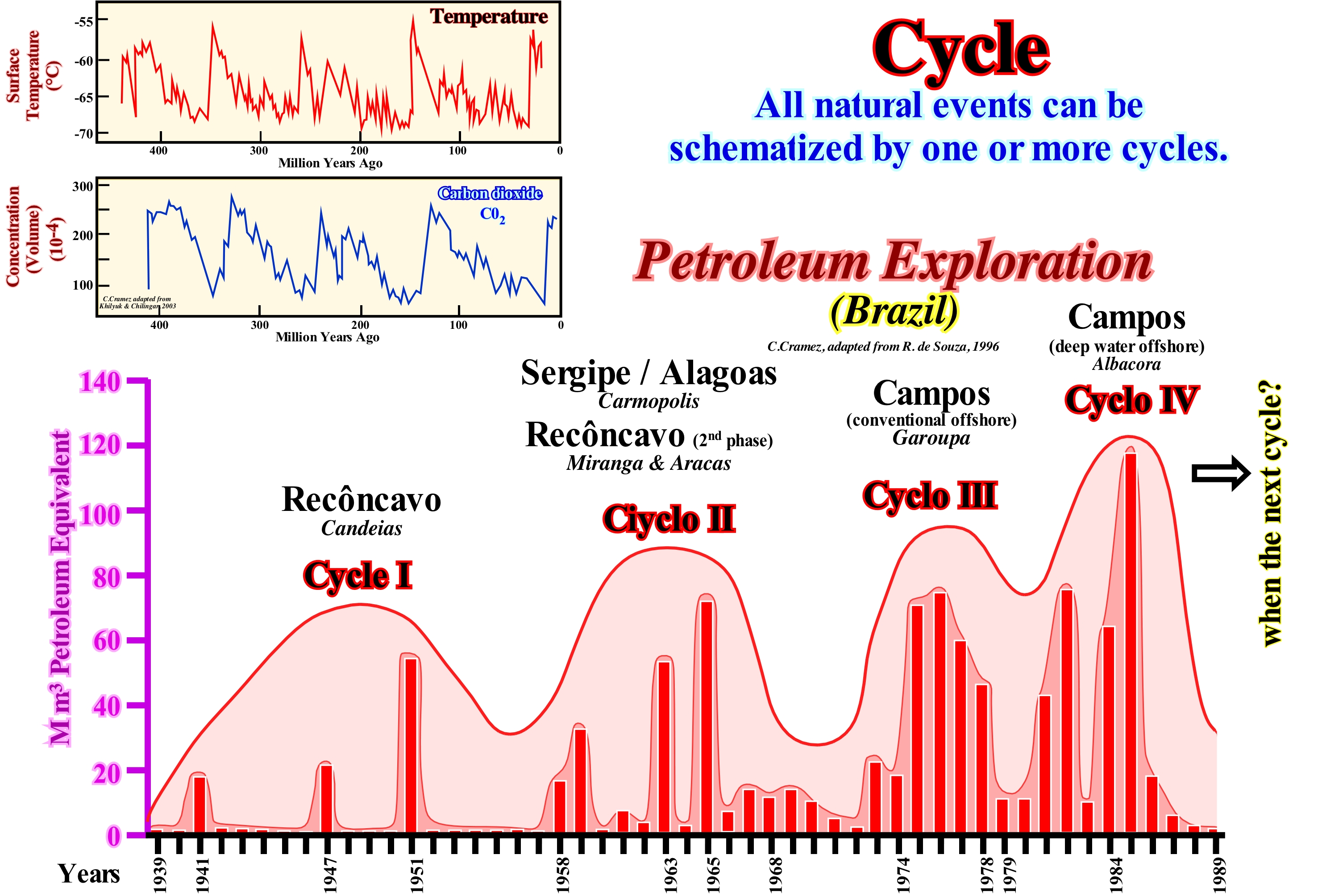 Among the great principles of nature: (i) Inequality; (ii) Self-similarity; (iii) Fractal distribution; (iv) Cyclicity; (v) Finitude; (vi) Gravity; (vii) Life; (viii) Determinism/Probabilism and (ix) Symmetry (central limit theorem), cyclicity is perhaps the most evident principle in geology and in particular in sequential stratigraphy. All natural events can be represented by one or more cycles. For several centuries, geoscientists have noticed the cyclicity of sedimentary rock depositional systems. After Benoit de Maillet and Lavoisier, the vast majority of geoscientists now think the cyclicity of sedimentary deposits is induced by eustasy (variations of absolute or eustatic sea level, which is supposed to be global and referenced to the Earth's centre). Absolute (eustatic) sea level changes, which are dependent on: (i) Tectono-Eustasy, controlled by volume variation of the ocean basins ; (ii) Glacio-Eustasia, controlled by the variation of ocean water volume as a function of the amount of ice ; (iii) Geoidal-Eustasy controlled by the distribution of ocean water caused by variations in the terrestrial gravity field, and (iv) Thermal expansion of the oceans or steric sea level rise (if the temperature of the oceans increases, the density of the water decreases and, for a constant mass, the volume increases). Earth's history, at least since the beginning of the Phanerozoic (± 600 Ma), can be described in a cyclical way. After the break-up of the Protopangea supercontinent (Rodhinia), the individualized continents dispersed to a maximum, due to the oceanic expansion (sea floor spreading). Then, since the agglutination of the ancient continental crust, along the B-type (Benioff) and the A-type (Ampferer) subduction zones, became predominant in relation to the formation of new oceanic crust by sea floor spreading, progressively, the continents clustered together again, forming the Pangea supercontinent. Similarly, the Pangea supercontinent fractured on several continents, which moved away from each other due to oceanic expansion, but which have now begun to approach* forming, probably, in a geological future, a new supercontinent. This cyclicity, which is, perfectly, explained by the Plate Tectonics Theory, is, also, found in biotic crises, climate, sea level changes, stratigraphic distribution of hydrocarbons source-rocks, etc. The day/night cyclicity, the cyclicity of the phases of the Moon, the seasons of the year, etc., marked humanity to the point that man speaks of sagittal and cyclic time. As illustrated in this figure, it seems that in the history of petroleum exploration of most productive basins, several exploration cycles can be highlighted. However, these cycles are not natural. They are the direct consequence of the gradual increase in geological knowledge of the geoscientists and the technology they use. Globally, as for any other natural material used by man, oil production will obey to certain laws. According to Hubbert's law, the annual rate of oil production depends, linearly, on the total fraction of oil that has not yet been produced. This means the total amount of oil produced follows a logistic curve and under normal conditions, as long as the oil production curve reaches its maximum, it can be said that about half the reserves have already been produced. So it can not be said that oil exploration at the global level is cyclical, once production has started, reached or will reach a maximum of production (probably between 2008 and 2012 for cheap oil) and then, irrevocably, will end. The vast majority of natural events can be schematised by one or several cycles. Roberto de Souza in his book on the history of petroleum suggested that up to 1898, four cycles can be highlighted in the offshore oil research in Brazil, whose culminating points are the discoveries of Candeias (Recôncavo), Carmopolis, Miranga and Aracas (Sergipe/Alagoas and Recôncavo), Garoupa (Campos) and Albacora (Campos). Similarly, changes in Earth's temperature and carbon dioxide (CO2) in the atmosphere during the Phanerozoic are cyclical. The peaks in temperature seem to precede CO2 peaks (about 800 years), that is to say, that, quite probably, are not the CO2 peaks that cause the peaks in temperature, as Mr. Al Gore (business man and politician who was vice-president of the United States from 1993 to 2001) is telling every-body, but probably the other way around.