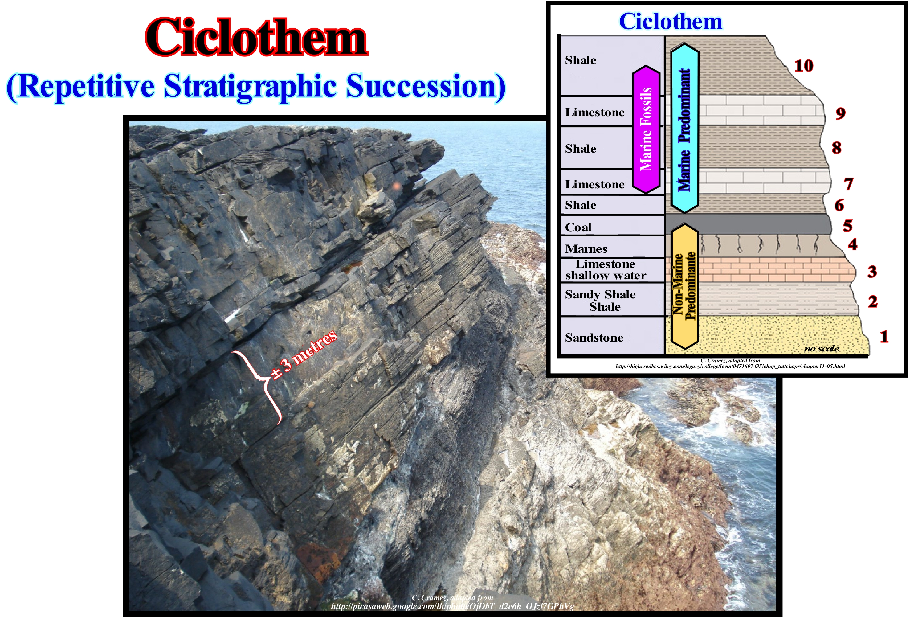 In the East sector of the United States and, particularly, in the Paleozoic cratonic basins, certain sedimentary clusters correspond to the stacking of non-marine and marine sediments, which, evidently, suggests advances and retreats of coastal deposits (sedimentary regressions and sedimentary transgressions). Each interval consisting of a stacking of non-marine and marine sediments was designated cyclothem by Weller in 1958. The average thickness of a cyclothem is about 6 meters, half of which is continental and the other half marine. In other words, a cyclothem is a sedimentary interval representing a transgressions / regressions cycle. However, many geoscientists now use the term cyclothem to designate a repeated sedimentation unit, either in cyclic or rhythmic sedimentation. In a cyclic deposition, from the bottom up, a cyclothem can be constituted by the following units: Interval 1, Interval 2, Interval 3, Interval 4, Interval 3, Interval 2, Interval 1. In a rhythmic sedimentation, a cyclothem is the set A, B, C, D of the succession A, B, C, D / A, B, C, D. Cyclothems associated with a rhythmic sedimentation are, generally, formed by: A) Coarse sandstones ; (B) Fine sandstone ; (C) Shales ; (D) Limestone, passing again to the second cycle, with the repetition of all or almost all of the depositional systems (lithology with a more or less characteristic fauna deposited in a given environment.) A cyclic sedimentary unit can be considered as a symmetrical cyclothem, while a rhythmic sedimentary unit is an asymmetric cyclothem. Although many geoscientists consider the terms cycle and rhythm as synonyms, genetically, a cyclic and a rhythmic sedimentation are associated with different geological events. A set of cyclothems form a megacyclothem, and successions of mega-cylothems form am hiper-cyclothem. Most of the cyclothems with coal extend through large continental regions forming series, although can, rarely, occur, also, in isolation. In certain areas series have been recognized with more than 10 cyclothems. In the North American, cyclothems with coal extend for thousands of kilometers square. They are are uniform in thickness and internal organization. During the Carboniferous, much of Eastern North America was a vast lowland (almost at sea level), probably, similar to the current coastal plain of the Gulf of Mexico. The stacking of these Carboniferous cyclothems cycles suggests frequent and repeated rise and fall of relative sea level (local sea level referenced to any point on the Earth's surface, which can be the sea floor or the base of the sediment, resulting of the combined action of the tectonics with the absolute or eustatic sea level, which is supposed to be global and referenced to the Earth's centre). In the stratigraphic sketch shown in this figure is illustrated a typical cyclothem of the Pennsylvanian in which 10 sedimentary units can be recognized. The lower part is composed of non-marine sediments, which end up with the depositing a level of coal (level 5). The coal layer is covered by marine sediments, which suggests a marine ingression (relative sea level rise) and submersion of the marshy area. Rich coal cyclothems were recognized in strata of the same age (Pennsylvania) in Europe. A repetition of cyclothems, i.e., the alternation of non-marine and marine deposits suggests: (i) Repeated variations in regional subsidence ; (ii) Repeated uplifts and (iii) Eustatic changes (variations in absolute or eustatic sea level) and repeated relative sea level changes. The cyclothems were, initially, identified in the USA and interpreted as an interaction between: (a) A tropical/equatorial climate ; (ii) A significant terrigeneous influx (sand and mud) and (c) Significant relative sea level changes.