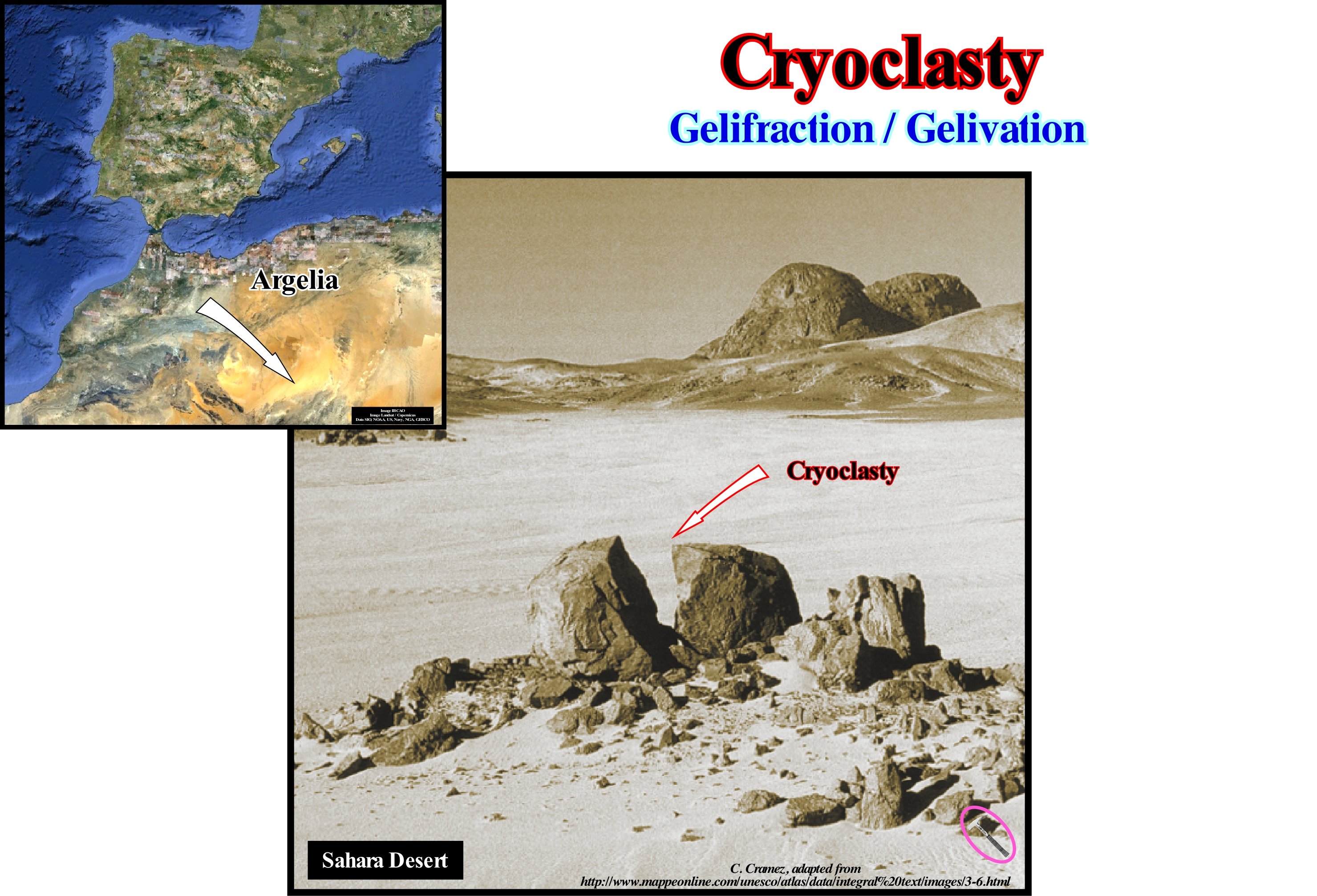 As illustrated in this figure, despite the great aridity of the soil of the Algerian Sahara, water is the main modelling agent of the landscape. In fact, haloclasty and cryoclasty are very important processes in the demolition of mountain chains. Haloclasty is the process of mechanical fragmentation of rocks due to the crystallization of salts from salt-water and salt-spray*, in which the cracks of rocks impregnated with concentrated solutions and salt minerals increase in volume by evaporation. In haloclasty the salts contained in the rocks absorb the atmospheric humidity and swell. The associated volume increasing fracture the rocks. In the cryoclasty, the moisture absorbed by the rocks freezes at night when temperatures are too low. In both cases, the increase in volume causes even the most resistant geological formations to disintegrate. It can be said that the cryoclasty (gelifraction or gelivation), as certain geoscientists call it, produces the rupture of the rocks in small blocks, more or less, lamellar function of the initial internal structure. The amplitude of the cryoclasty depends less on the intensity of the cold than on the alternation of freezing and thawing. The forms of cryoclasty are, mainly, found in the caves of altitude and in the lapiaz, as well as in the regions where there are climatic variations, more or less, important, around zero degrees Celsius. This mode of rock alteration exists, also, in the periglacial regions. The stone monuments that we find in many cities also suffer cryoclastic alterations, that without maintenance, deteriorate, or even, are destroyed. Cryoclasty appear to have shaped the Serra da Cabreira, in Portugal, where there is a morphological disparity between the western and eastern slopes. The western slope is characterized by intense gelifraction formation with large granitic slabs (macrogelifraction) with a thickness between 1 and 2 cm, some of which are more than 1 m in length (they can be seen in the flat tops of Talefe-Chã de Lousas and Toco).