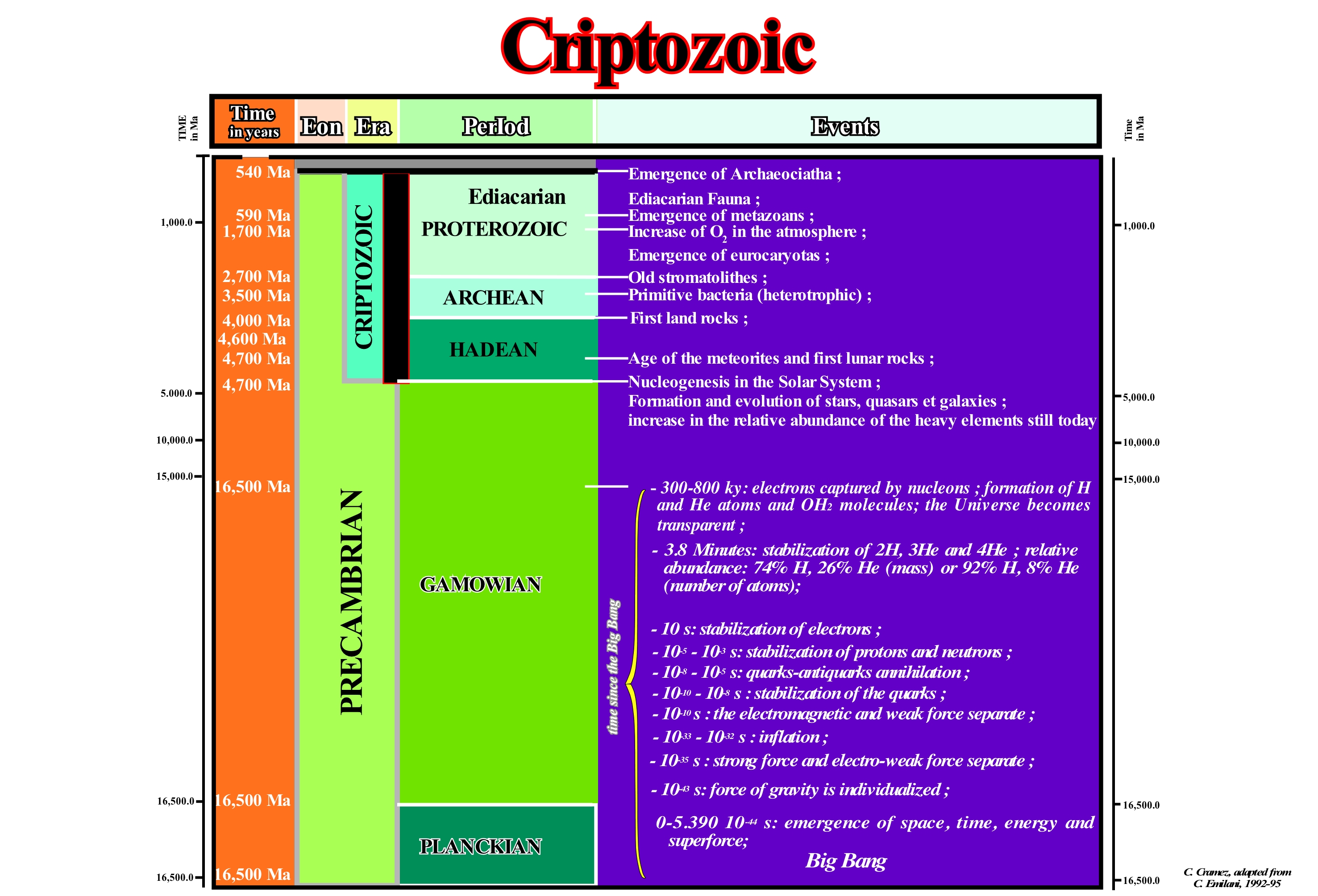 The Cryptozoic encompasses all time between the formation of the solar system, that is to say, from the end of the Gamowian (4.7 x 109 years ago or 4.7 Ga) to the beginning of the Cambrian, i.e., up to about 570 Ma. Contrariwise to 10 My, which underlines a time interval of 10 million years, whether it be from the Cretaceous or from the Devonian, 10 Ma represents an age. Thus 65 Ma means a geological age of 65 million years. The Cryptozoic, as illustrated in this figure was divided into three Eons (a rank higher than the Age): (i) Hadean ; (ii) Archean and (iii) Proterozoic. The Cryptozoic is also called Precambrian, more strictly, speaking. The Precambrian includes all the time before the Cambrian, that is to say, the Gamowian and the Planckian. The Hadean (between 4.7 and 3.8 Ga), embraces the formation and differentiation of the Earth, as well as, the evolution of bacteria. The Archean (between 3.8 and 2.7 Ga) is the time of the formation of the stromatolithic crust and dome-shaped stromatolites. The Early Proterozoic (between 2.7 and 1.7 Ga) is the time of cylindrical stromatolites. The Late Proterozoic (between 1.7 and 0.54 Ga) is the time of the branched stromatolites, the evolution of eukaryotes and the appearance of Ediacara fauna. The Phanerozoic (between 540 Ma and Today) is the time of the appearance of Archaeocyatha, and development of metazoans and metaphythes. Metazoans form the sub-kingdom which includes all species of multicellular animals characterized by digestive system and differentiated cells in various tissues only animals that are not considered metazoans comprise the three phyla of uncertain systematic position: Rhombozoa, Orthonectida and Placozoa, which are, sometimes, grouped in the sub-kingdom Agnotozoa (meaning "unknown animals"). The metaphythes constitute the plant kingdom and include all the multicellular eukaryotes, photosynthetic plants found in this biosphere, which are composed of three large groups: (i) Algae, (ii) Bryophytes and (iii) Tracheophytes.