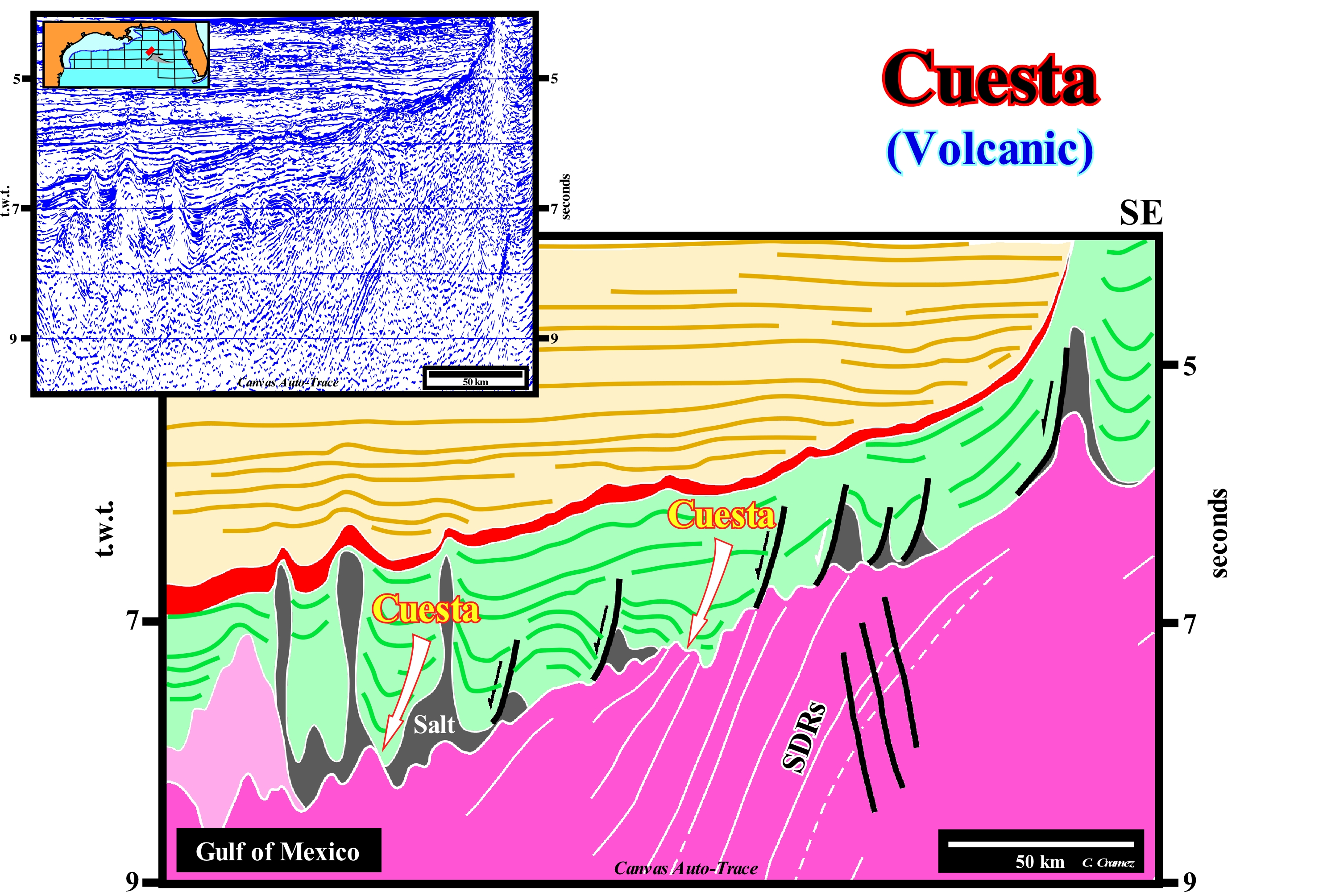 On this tentative geological interpretation of a Canvas auto-trace of a seismic line of the Gulf of Mexico, the proposed cuestas at the base of the saliferous horizon and, especially, in the salt welds (when the salt disappears completely by flow or when it has a thickness inferior to the seismic resolution) are volcanic cuestas associated with lava deltas. The Atlantic-type divergent continental margins are, essentially, volcanic divergent margins. The sedimentary prisms lie, directly, on a substratum formed, mainly, by sub-aerial lavas. The dimensions of such a substrate are impressive. In fact, the sub-aerial lavas, which dip seaward and thinning continentward (SDRs, i.e., Seaward Dipping Reflectors), such as those illustrated in this tentative, may be followed since Northern Europe and North America offshore till the offshores of South Africa, Brazil and Argentina. The total thickness of the lavas, which overlap, partially, is variable, but may exceed ten kilometers. The sub-aerial lavas flow from the sub-aerial expansion centres towards the continent (volcanoes, more or less, rectilinear, formed when the lithosphere break-up). Not only do they pinchout toward continentward and they are post break-up unconformity, which separates the rift-type basins from the overlying margin sediments. The sub-aerial volcanic substratum is an integral part of the divergent margins. If there is no obstacle to the flow, the lava thin continentward and disappear progressively. If there is a barrier to the lava flowing, such as a lake or epicontinental sea, the lava entering the water cool, rapidly, and solidify into lava deltas, i.e., sigmoid progradational constructions (upbuilding and outbuilding) in direction of flow, similar to the progradations of a delta building. It is these structures that form the volcanic cuestas proposed on this tentative interpretation. This type of lava and lava delta were recognized by several oil exploration wells and DSDP in the Atlantic offshore.