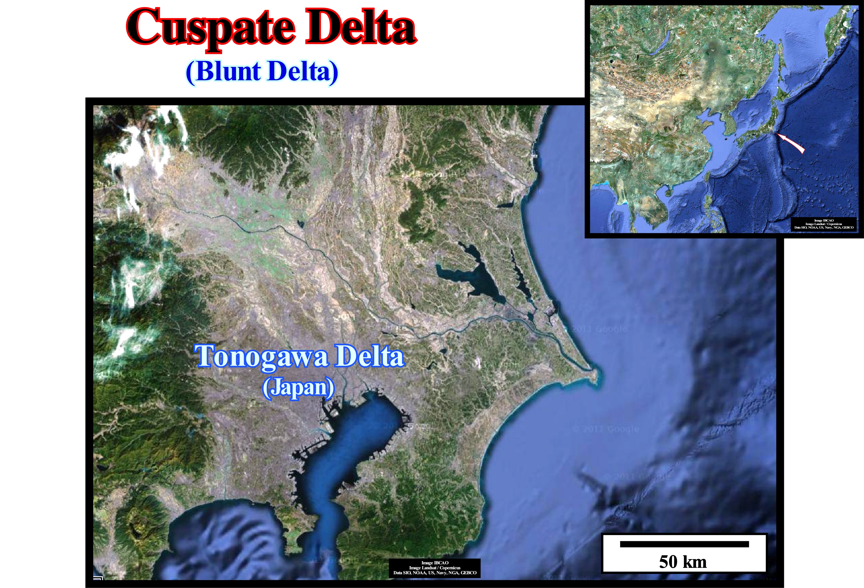 A cuspate delta is the delta that forms when a river drains into a coastline, more or less, straight and subject to a strong swell, in such a way that sea-waves force the sedimentary particles to spread in two directions opposite the river-mouth, building an arrowhead with crescent-shaped curves on each side. A cuspate delta can not be confused with an arcuate delta. An arcuate delta forms when a river meets the sea in a place where the waves, currents and tides are strong, in the areas where the longitudinal currents maintains the edge of the delta trimmed and relatively smooth. In other words, these deltas are dominated by sea-waves and are the erosion induced by the waves that controls the shape of the delta. The vast majority of the sedimentary particles arriving from the mouth are diverted along the coastline. However, these deltas can have multiple energies. When the delta is tilted and with high energy, the coasts with deficient sedimentary particles have little sand at the bottom and a, relatively, deep offshore. When the delta is little inclined in a low energy environment, the coasts are, usually, shaly with a coastal vegetation fringe. In these deltas, the action of the incident waves is dissipated in a shallow-water offshore, which is not the case for most deltas. In general, deltas result from river and sea processes, and the sedimentary particles transported by rivers are deposited when the stream enters a water-body without strong currents, such as a lake, lagoon, sea or ocean. The deposition of the sedimentary particles is enhanced when the water is salted. The finer particles, and especially the shaly ones, agglutinate in the salt water, forming larger particles. Other major factors that influence deposition are: (i) Type of sedimentary particles ; (ii) Local geological context; (iii) Eustatic changes (absolute sea level, which is supposed to be global and referenced to the Earth's centre) and changes of relative sea level (local sea level referenced to any point on the Earth's surface, and which is the result of the combined action of absolute sea level and tectonics) ; (v) Plant growth; (vi) Human Impact, etc. Typical examples of large delta buildings are associated with the Mississippi, Ganges, Bramaputra, Rhone, Rhine, Dust, Danube, Nile rivers. The actual Ebro Delta in Spain, San Francisco Delta (between Sergipe and Alagoas in Brazil) and the Tonogawa Delta in Japan, are typical cuspate deltas. The Tonogowa delta, for instance, illustrated in this figure, is a cuspate our blunt delta (arrowhead delta), which forms when a river deposits the sedimentary particles, which it transports on a, more or less, straight-line coastline, but dominated by very strong waves that oblige the sedimentary particles to spread, perpendicularly, to the mouth of the river and in opposite directions. Another well-known cuspate delta is the actual Tiber delta (Italy). The Tiber deelta building began to form between 13,000 and 7,000 years BC, when the fluvial valley and deep (incised valley), which the river dug during the Wurm glaciation(*) (characterized by having produced a significant absolute or eustatic sea level fall, at least in the Northern Hemisphere), was, partially, inundated by the increments of the absolute sea level rise induced by thawing. Initially, during the marine ingression, the delta building was of in the bottom of the bay and its geometry, globally, retrogradational. Around 8,000 BC, the delta building began to progradate seaward (sedimentary regression) and changed (around 6,000 BC) into a cuspate delta due, mainly, to the action of the waves. The interaction between sea level rise induced by the melting of ice caps, terrigeneous transport and wave energy, explains the evolution of the Tiber region over the last 18,000 years. Several types of delta can be considered as a function of the dynamics of the delta and the shape of the emergent plain: (i) Abandoned delta (sub-delta) ; (ii) Alluvial delta; (iii) Arctic Delta; (iv) Rounded Delta; (v) Atrophied Delta; (vi) Complex or polymorphic Delta; (vii) Typed Delta; (viii) Flood delta; (ix) Closed Delta; (x) Gilbert-type Delta; (xi) Lava Delta; (xii) Lobated Delta ; (xiii) Tidal delta; (xiv) Sunmarine Delta; (xv) Storm Delta; (xvi) Wave Delta ; (xvii) Ebb Delta.