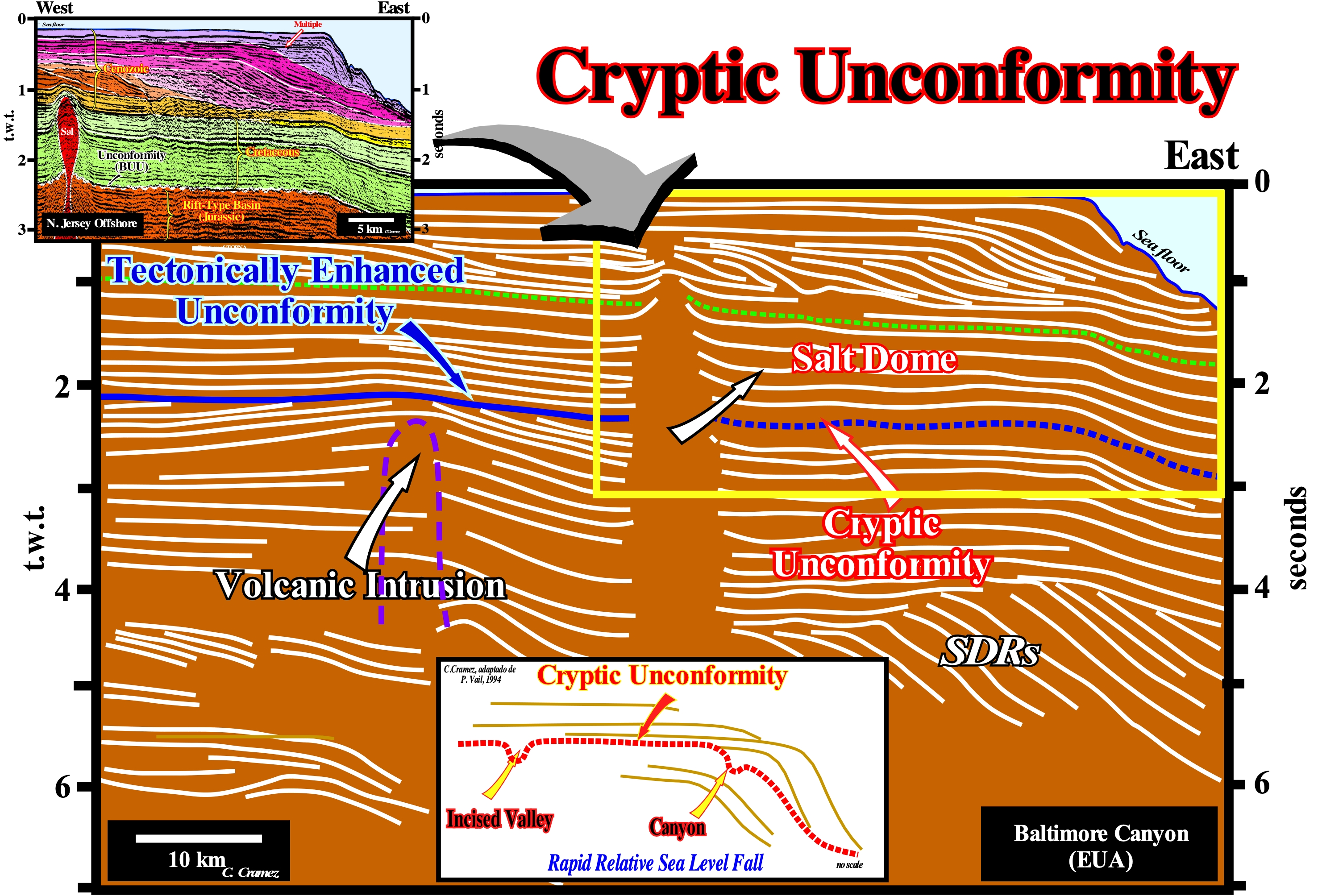 All non tectonically enhanced unconformities, i.e., all non angular unconformities are cryptic (difficult to identify). They are difficult to recognize and especially to follow (picking) both on seismic lines and on the field. This is particularly true in the absence of incised valley and submarine canyons fills, as illustrated in the geological model on the lower part of this figure, where the anomalies associated with the submarine canyon and the incised valley are obvious. In the same way, this is, perfectly, corroborated on this tentative geological interpretation of a Canvas auto-trace of a regional seismic line of the New Jersey offshore (Baltimore Cannon, United States). In the western part of this auto-trace, a volcanic intrusion (confirmed by oil exploration wells and magnetics studies), which is quite visible in the parallel lines, deformed the overlying sediments creating an antiform structure (extensional and not compressional structure such as an anticline). Later, the antiform structure was, partially, eroded following a significant fall of the relative sea level (sea level, local, referenced to any point on the Earth's surface, which could be the sea-floor or the base of the sediments and which is the result of the combined action of absolute or eustatic sea level, which is the global sea level, referenced to the Earth's centre, and tectonics), which exhumed the continental platform (shelf) and created an erosional surface, i.e., a regional unconformity, that underlies the top of the Triassic. Regionally, the unconformity associated with this relative sea level fall is cryptic, as can be seen in the eastern part of this tentative interpretation (an area where sediments were not deformed by the implementation of the volcanic intrusion). In the middle of the auto-trace, the reflector terminations emphasize a salt dome. It is interesting to note that, just, the sediments of the progradational interval were, partially, deformed by the upward movement of the salt dome. This, probably, means the salt dome struck the sea floor very early, and that as the sediments deposited it rises without deforming them, until it has been, totally, fossilized by the progradational upper sediments of the Cenozoic. Later, the upward movement of the salt dome, probably, resumed by halokinesis, deforming the overlying sediments (lengthening them). However, as the strata did not reach the sea floor, there was no significant erosion of the sediments. This means that tectonics deforms sediments, but by itself can not erode them. For erosion to occur it is necessary that there is a significant relative sea level fall that exposes sediments to erosional agents. Another possible explanation for the lack of deformation of the sediments surrounding the salt structure is to admit that this structure does not correspond to a salt dome but to a salt drop structure, disconnected from the autochthonous salt mother-rock by a vertical salt weld (detached salt stock). In this way, the absence of deformation of the reflectors is apparent. Under the salt mass forming the drop structure no seismic reflector can be highlighted. This hypothesis is more difficult to refute than the first one. On a seismic line, a salt dome with vertical walls, i.e., a cylindrical shaped salt dome is a physical impossibility: (i) Salt density is constant in depth what is not the case of the surrounding sediments, whose density increases with depth ; (ii) In depth, along a salt dome, there is a point of density inversion between the salt and the adjacent sediments, above which the salt density is greater than the density of the sediments ; (iii) On this auto-trace, a salt dome of 4 seconds thick (t.w.t.) would imply a depth of base of the salt much greater than the thickness of all sedimentary intervals (seismic wave velocity within the salt is about 4,000-5,000 m/s, which is much higher than the velocity of the seismic waves within clastic sedimentary rock). The seismic line of this tentative interpretation and in particular the progradational interval (Cenozoic), i.e., the seismic interval between the sea floor and about 1-1.5 seconds (t.w.t.) is used in the courses of sequential stratigraphy to show the importance and, above all the preponderance, of eustasy (absolute sea level changes) in the stratigraphy. Indeed, on this tentative, the subsidence induced by tectonics was, throughout the Cenozoic, insignificant. Almost the available space for the sediments (accommodation) was created by eustasy. All segments, landward of the depositional coastal break of the different chronostratigraphic lines are sub-horizontal.